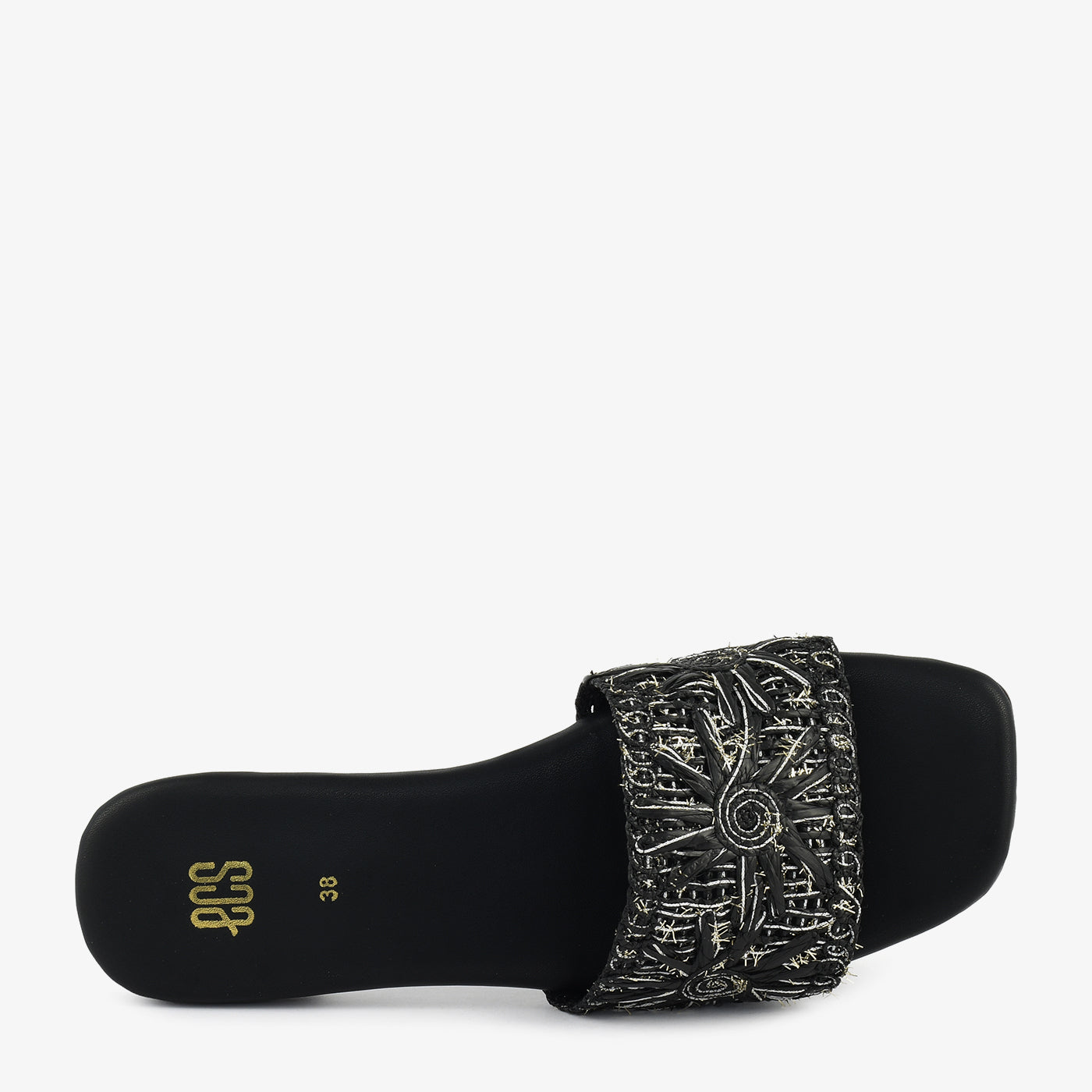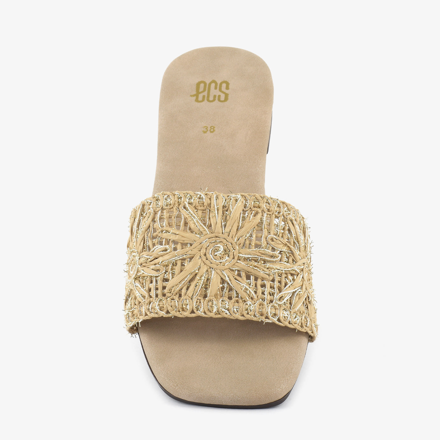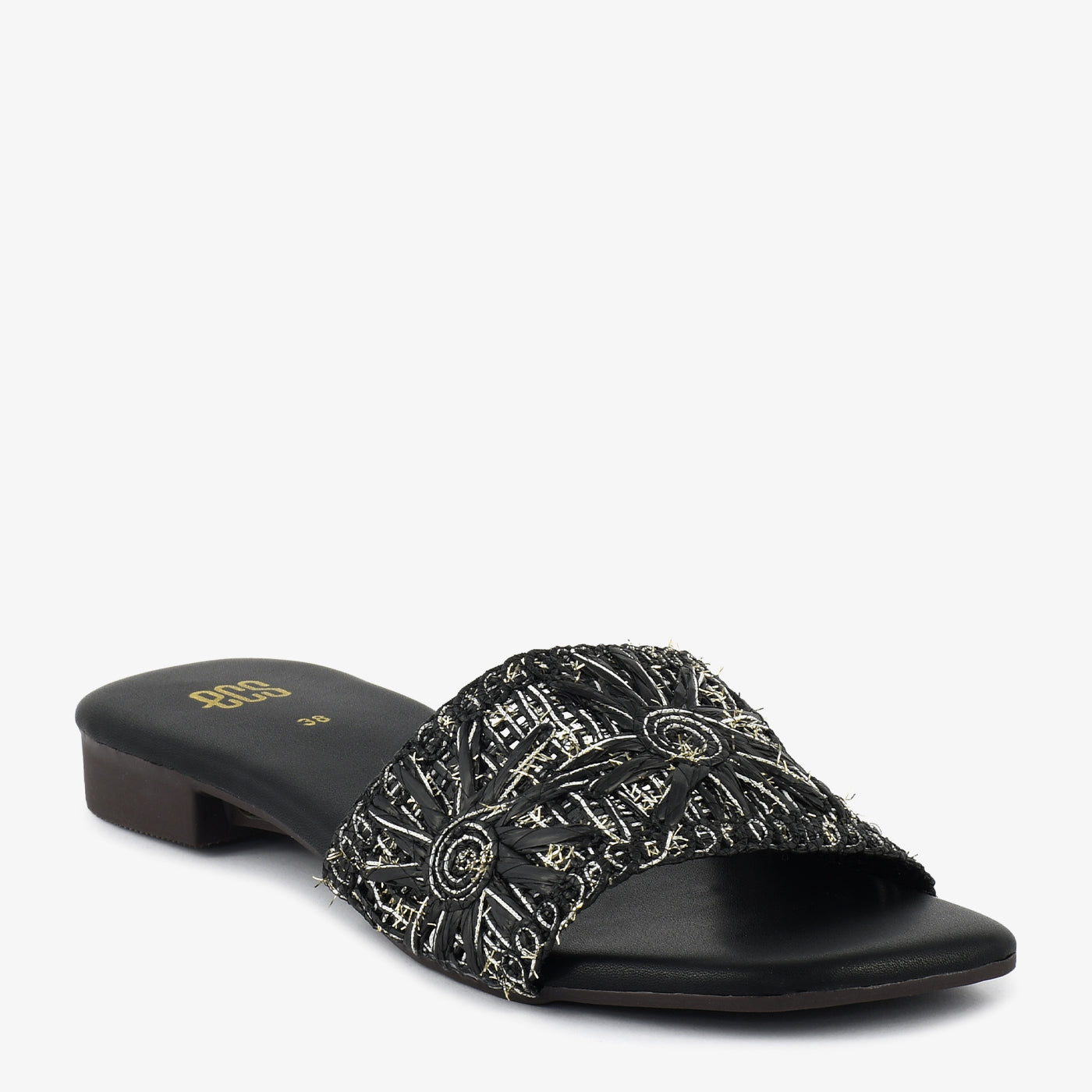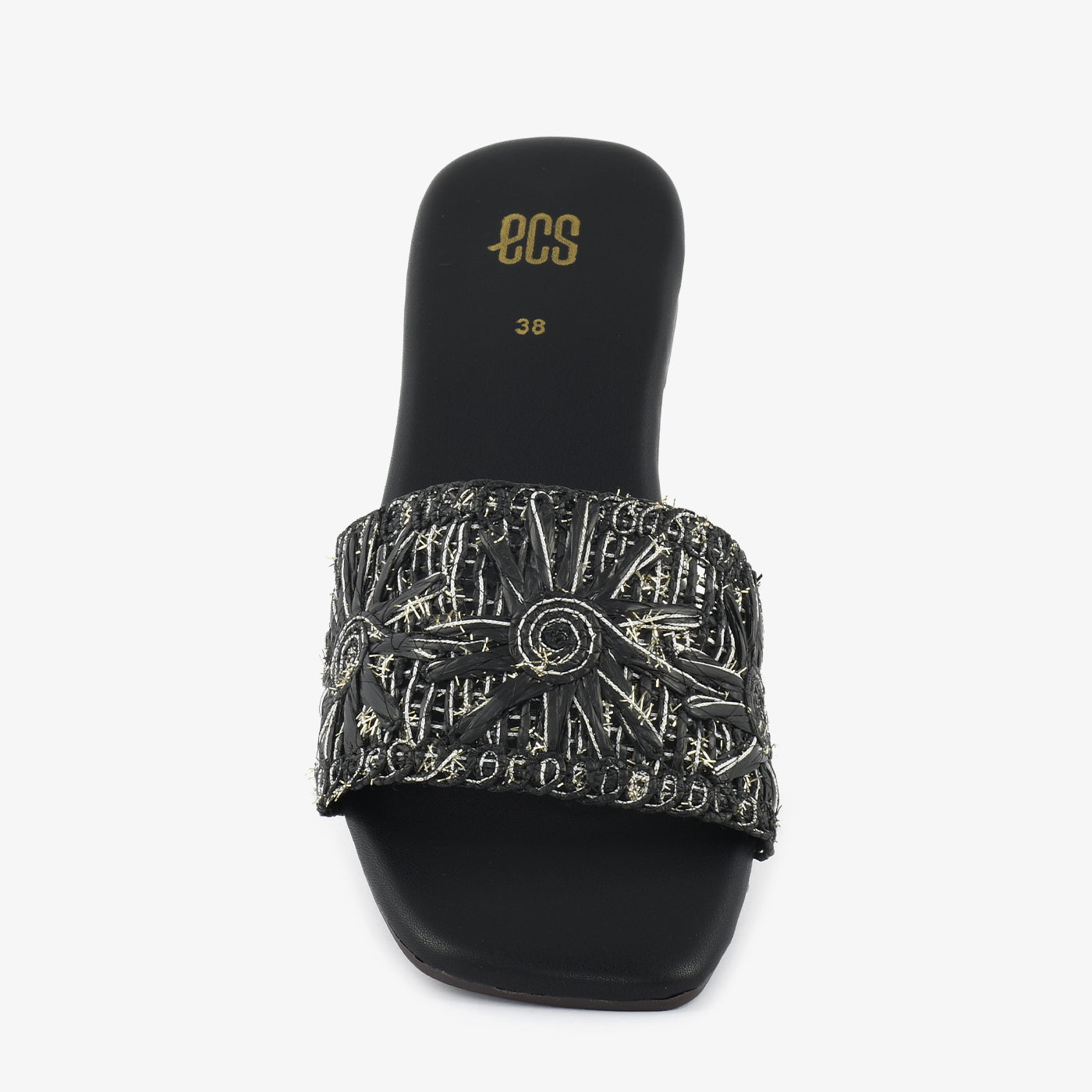 Step into textured beauty with the Floral Weave. These charming flats feature a wide strap with an intricate, floral-inspired woven design. The flat sole offers a comfortable and relaxed feel for everyday wear.
