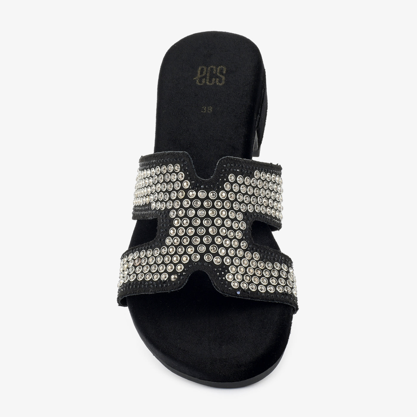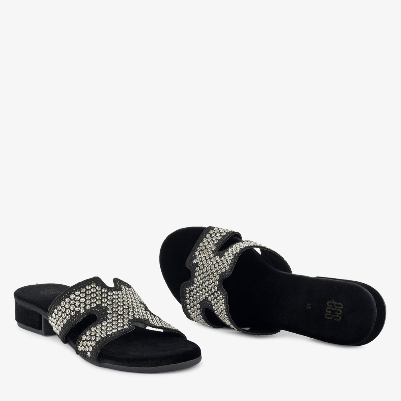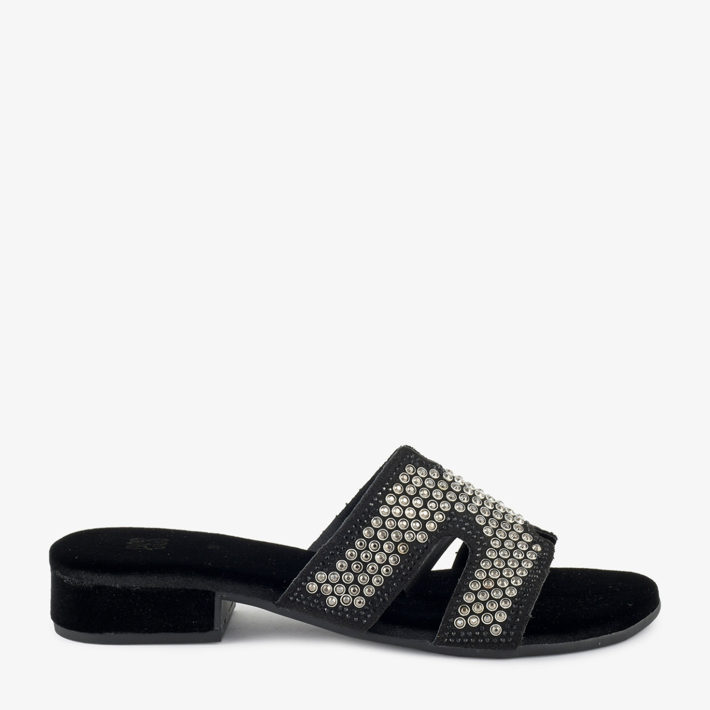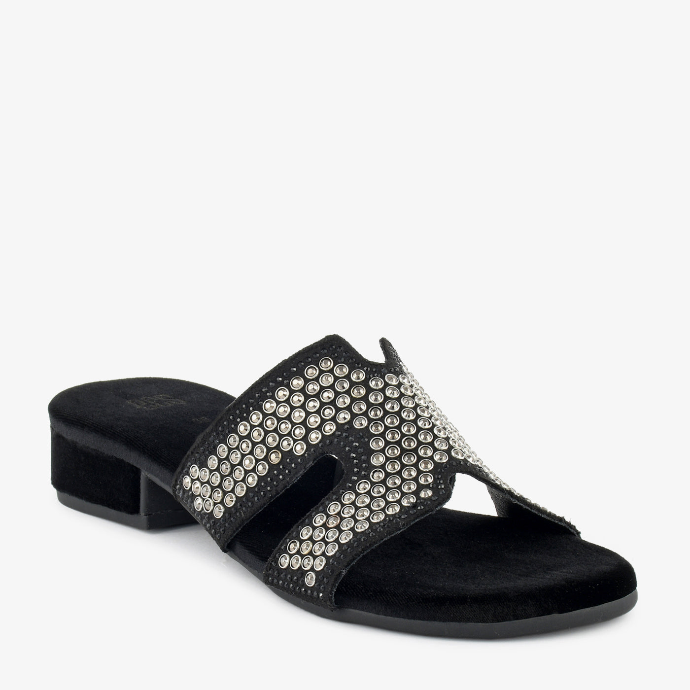 Step into glamorous comfort with the Crystal Cutout. These stylish heeled slides feature a unique cutout design on the wide strap, fully embellished with sparkling crystals. The low block heel offers a touch of elevation while ensuring ease of wear for various occasions.