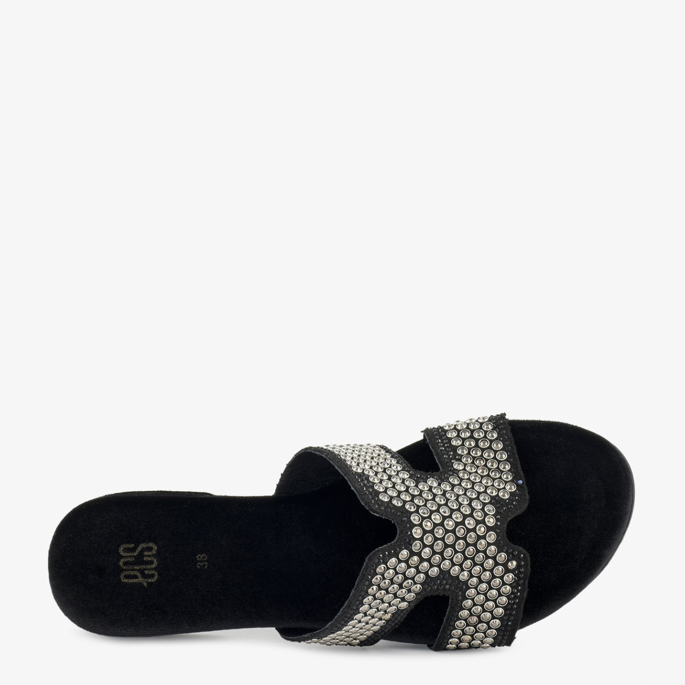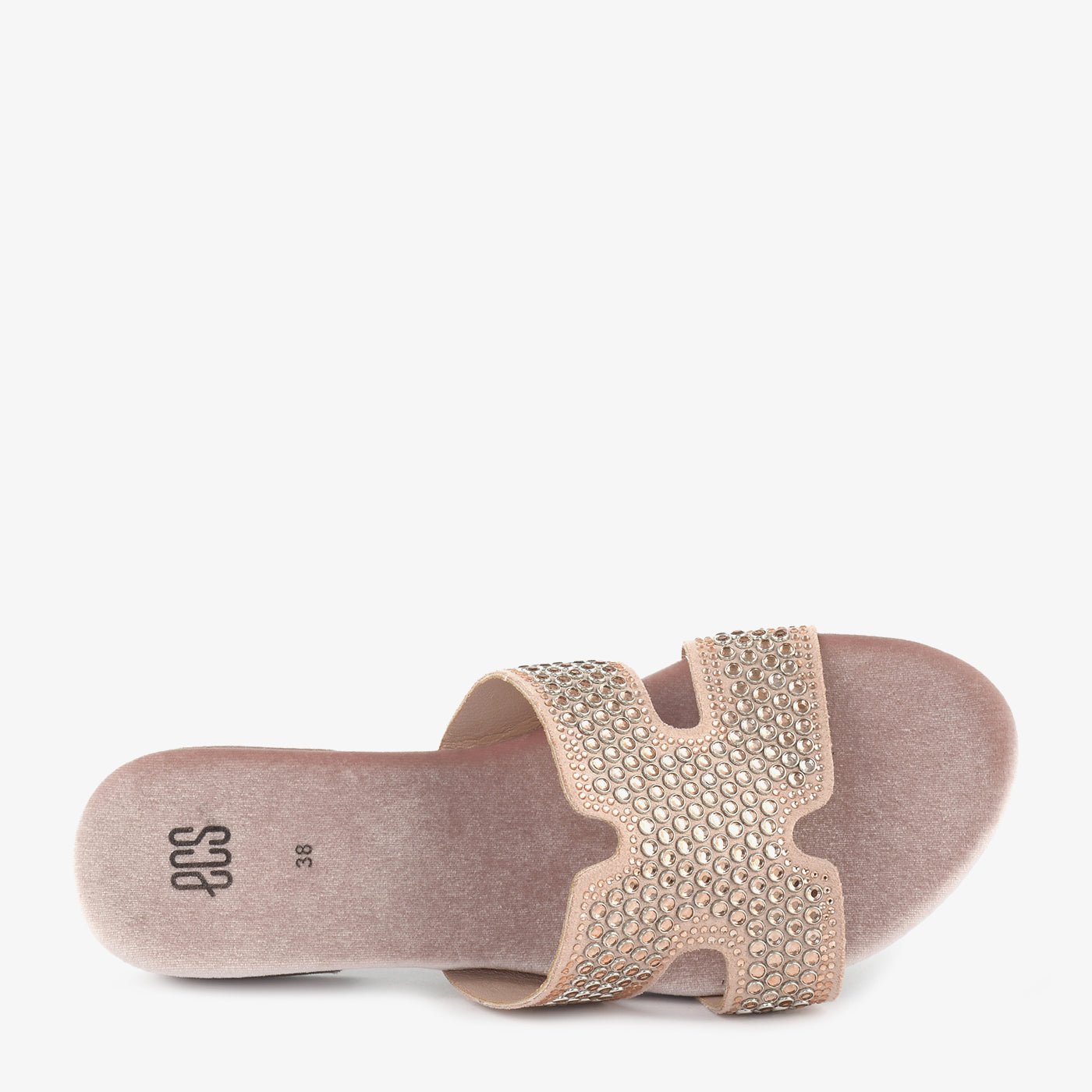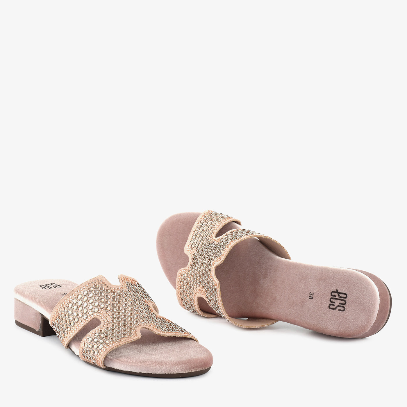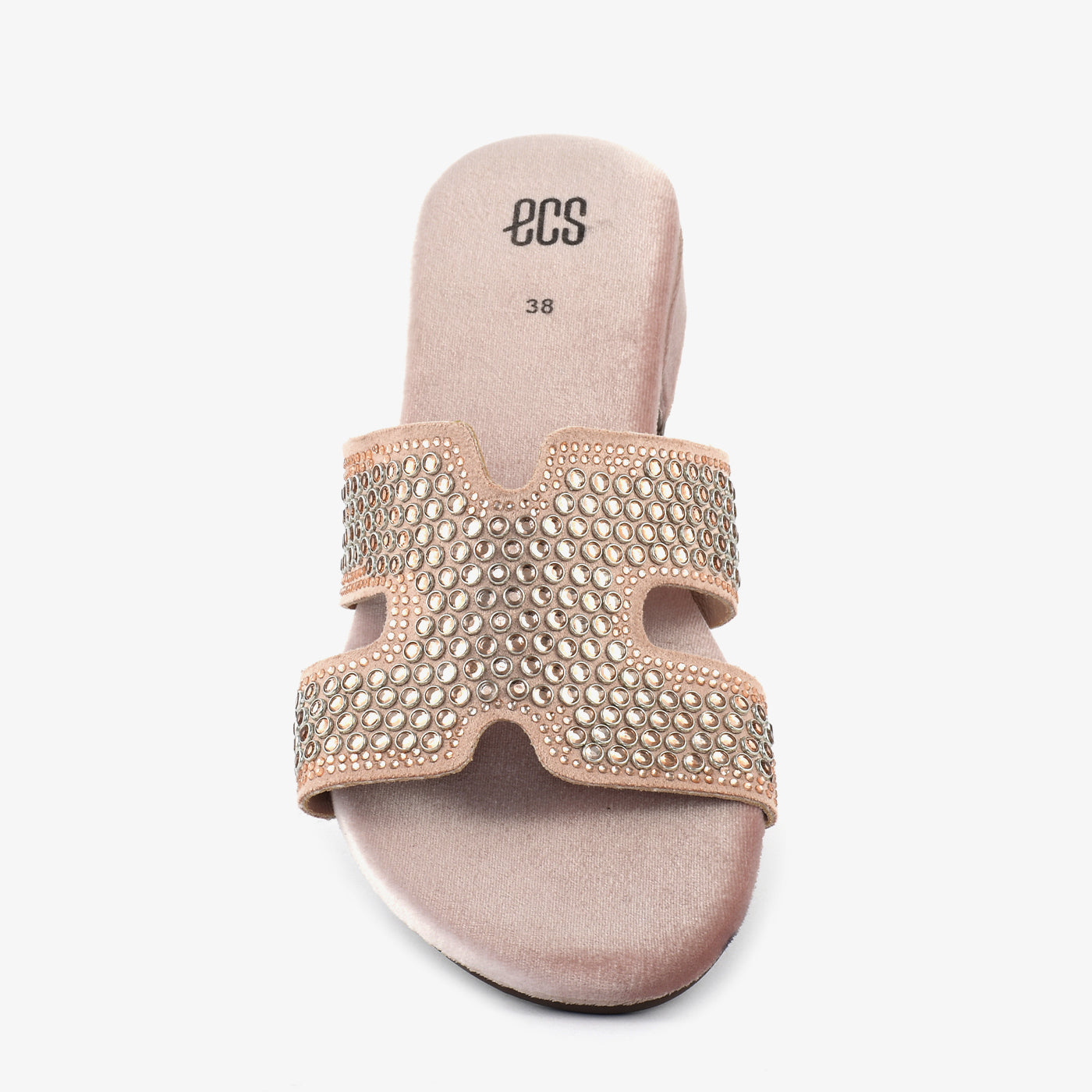 Step into glamorous comfort with the Crystal Cutout. These stylish heeled slides feature a unique cutout design on the wide strap, fully embellished with sparkling crystals. The low block heel offers a touch of elevation while ensuring ease of wear for various occasions.