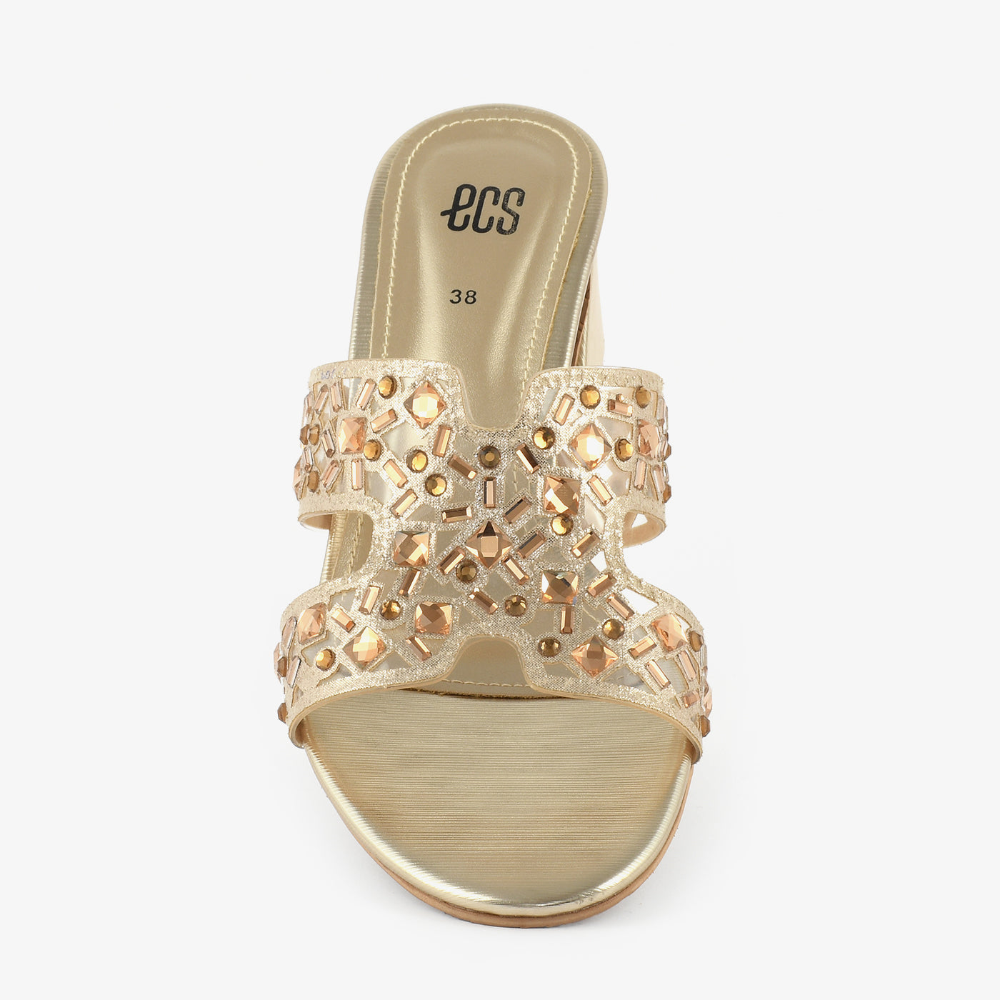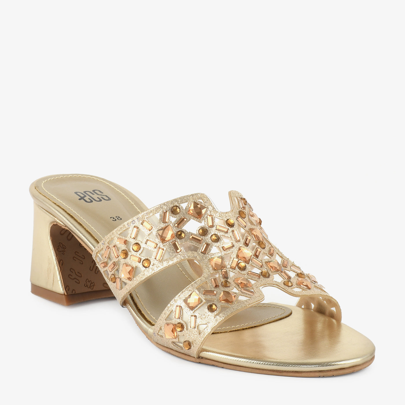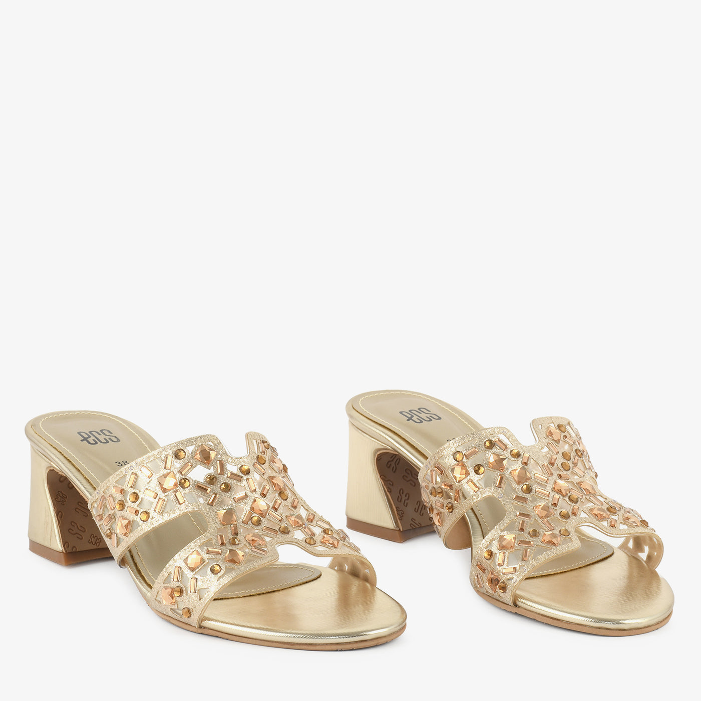 A festive slipper crafted for occasions where comfort meets sparkle. The multi-strap upper adorned with reflective accents gently wraps the foot while allowing airflow. The supportive block heel ensures steady balance, making it ideal for celebrations and semi-formal gatherings.