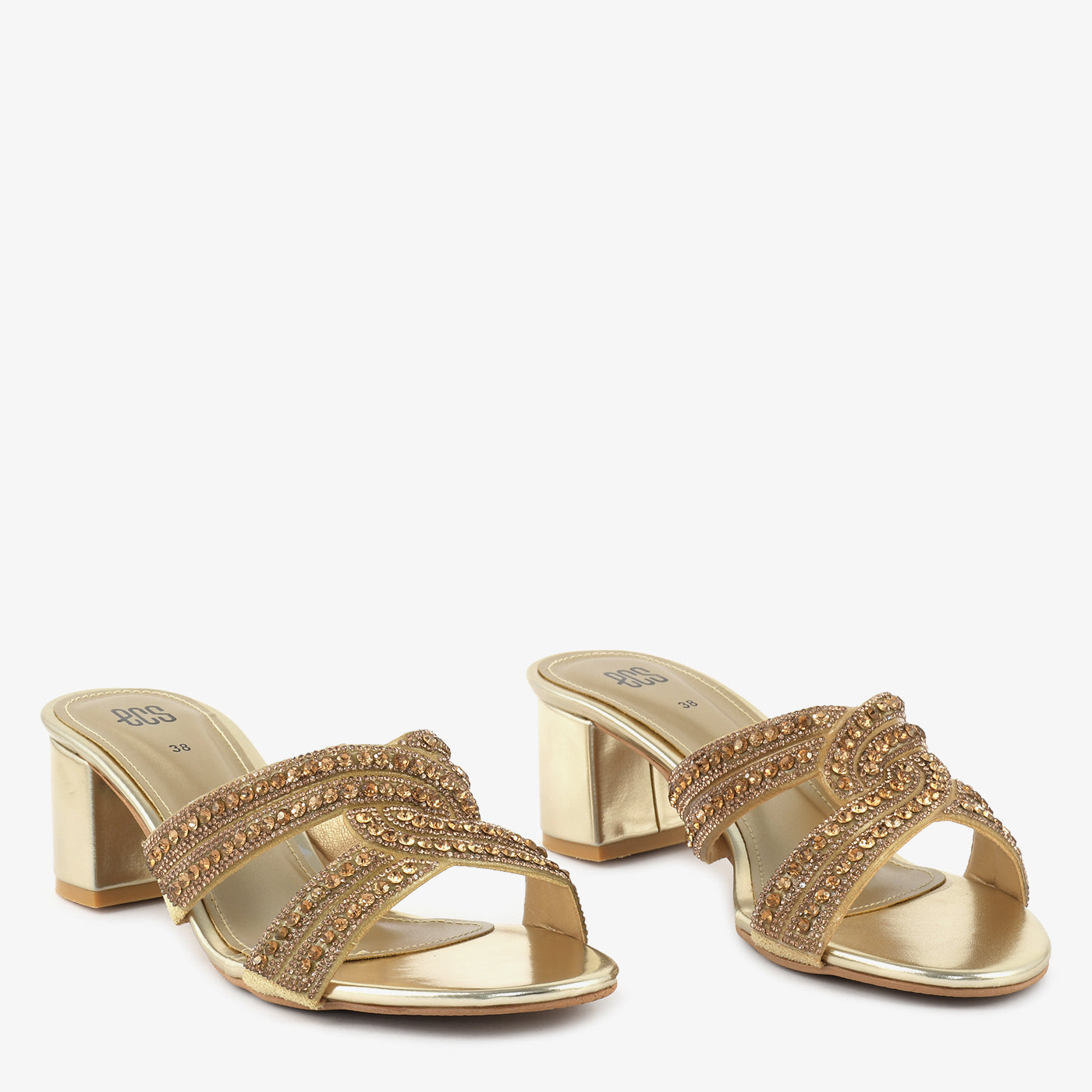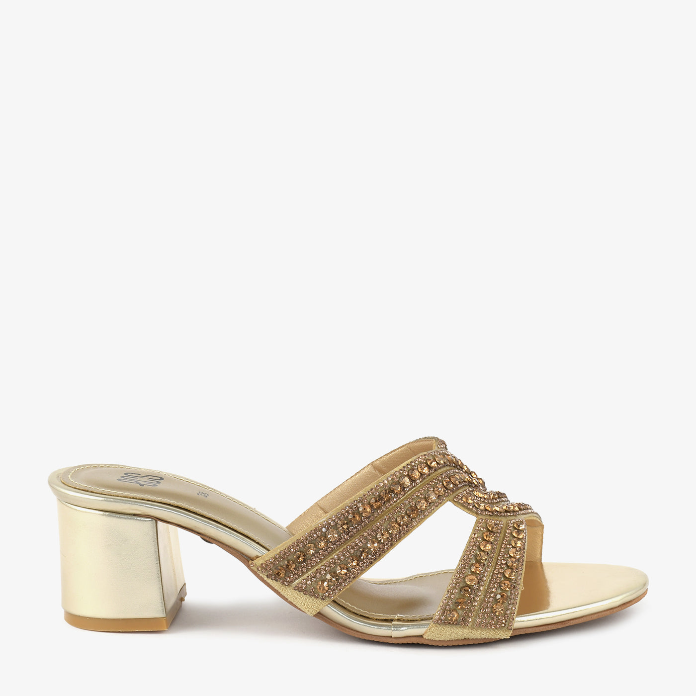 Step into radiant glamour with these gold block heel mules. The multiple straps are beautifully embellished with shimmering beads and stones, creating a cascading effect of sparkle perfect for festive occasions in Lahore. The comfortable block heel provides a stylish lift for celebrations.