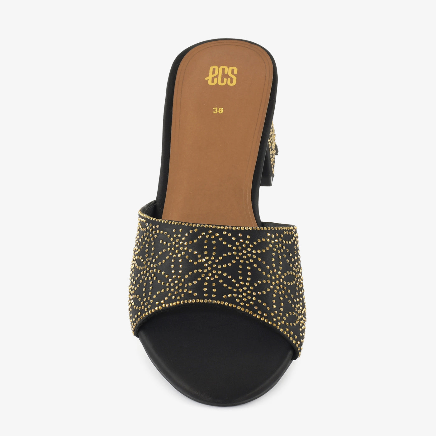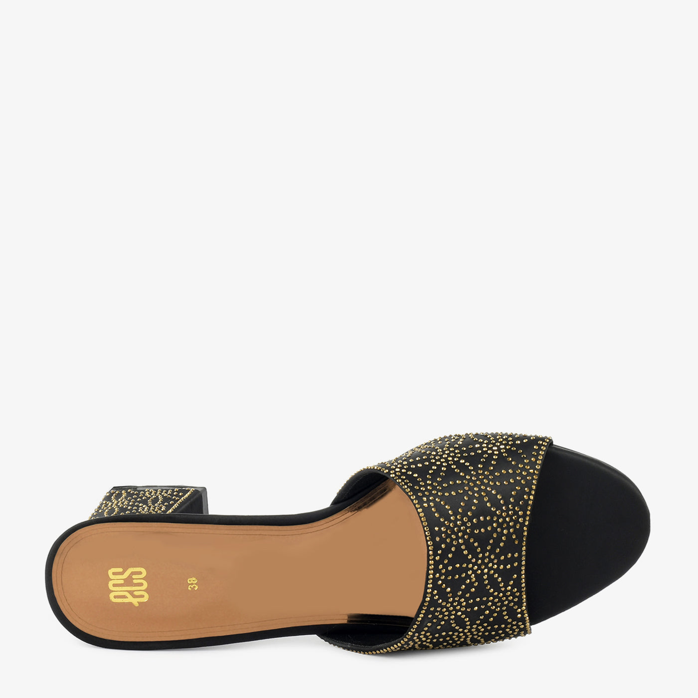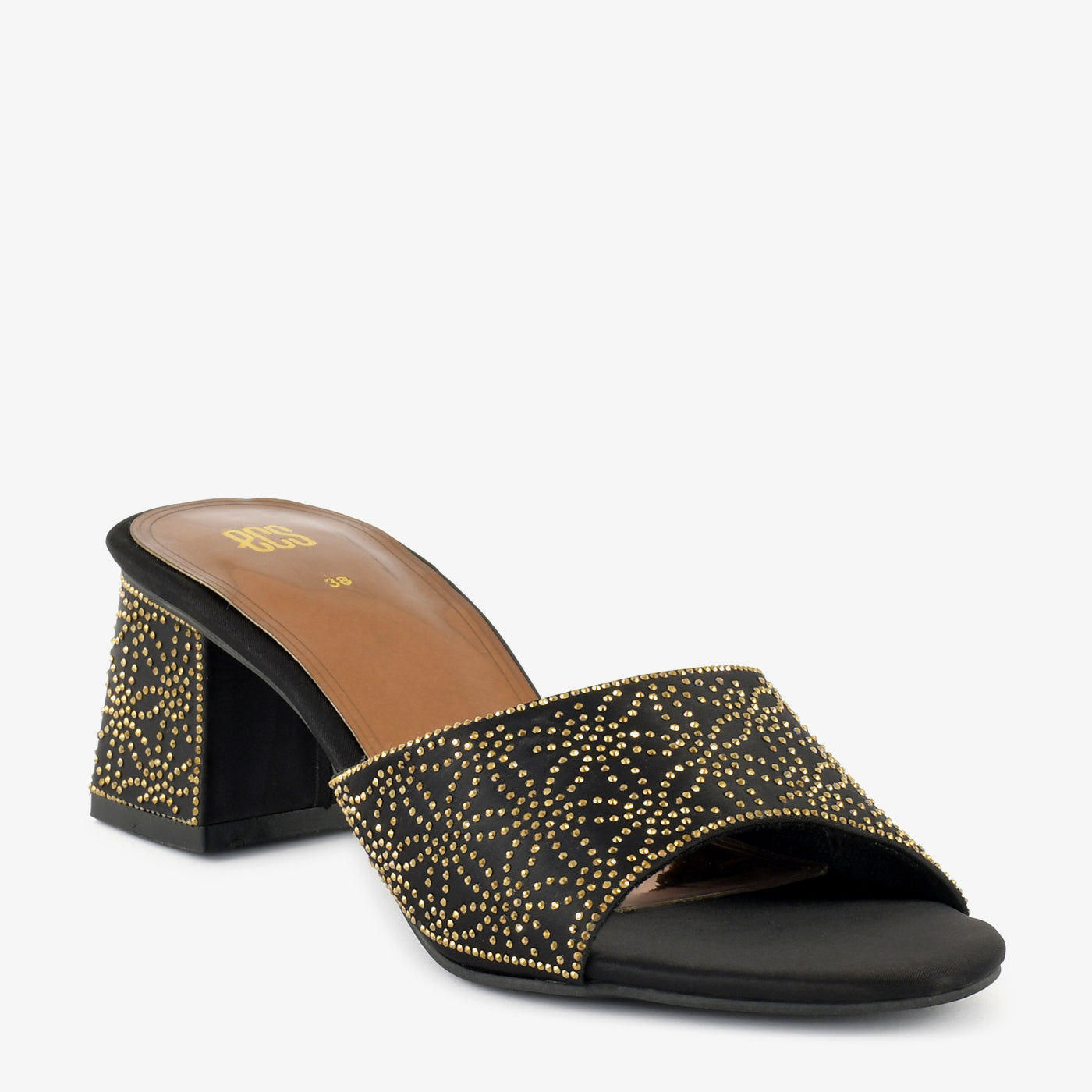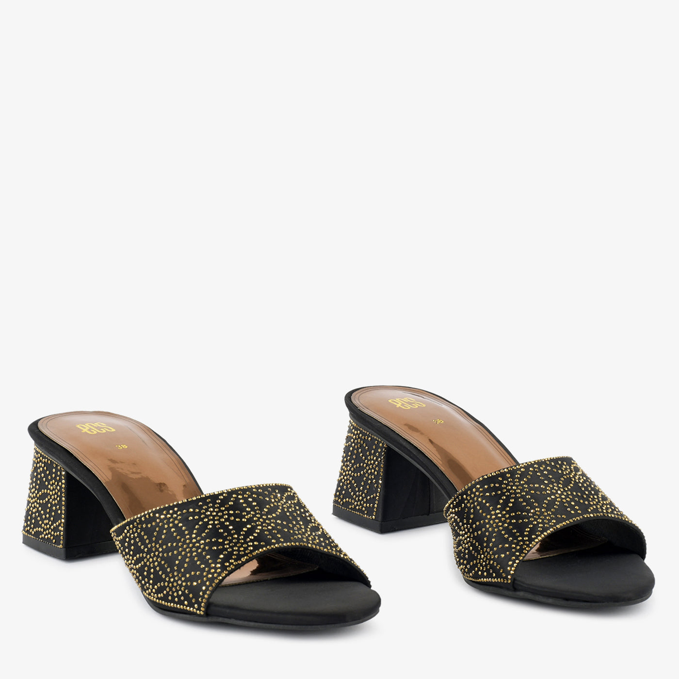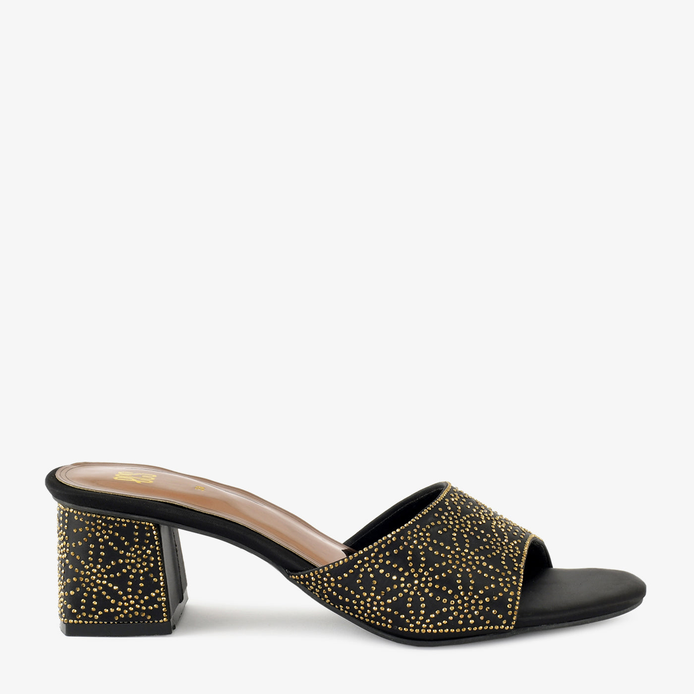 Step into striking elegance with these black block heel mules. The wide strap and block heel are beautifully adorned with intricate gold embellishments, adding a touch of regal glamour...