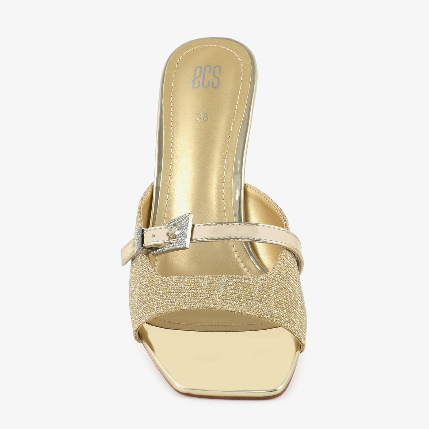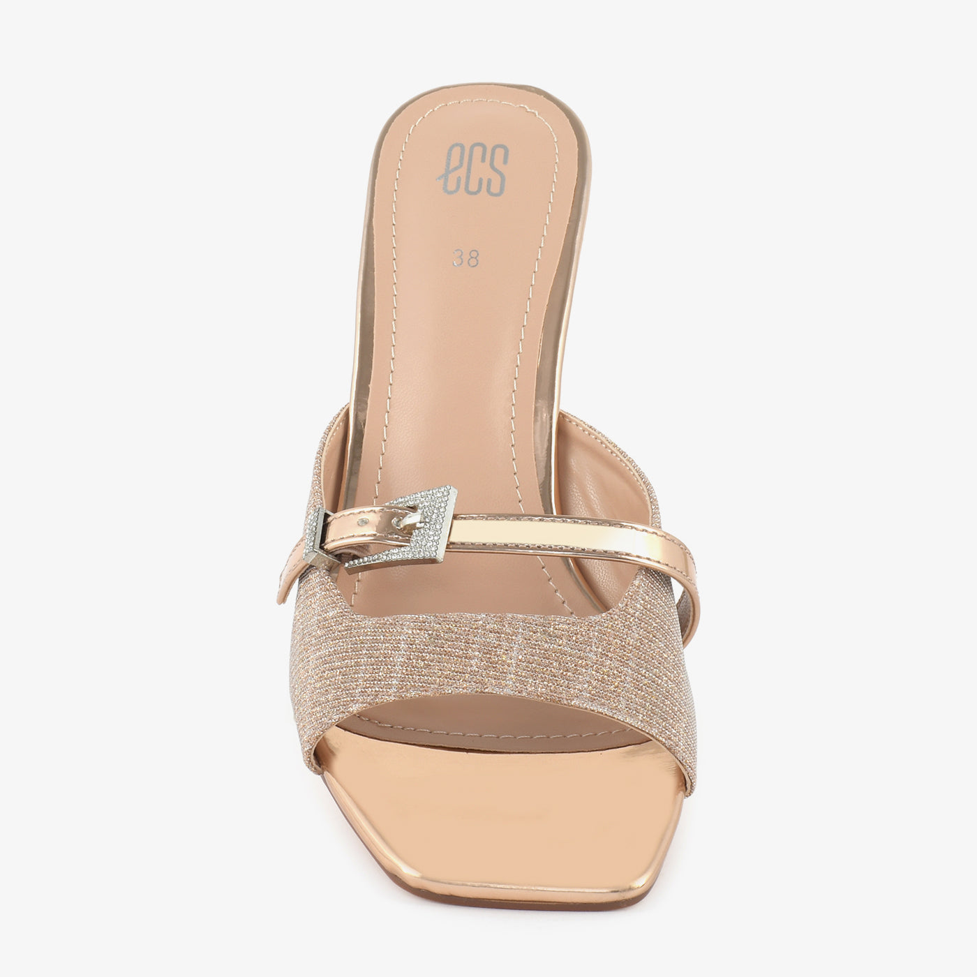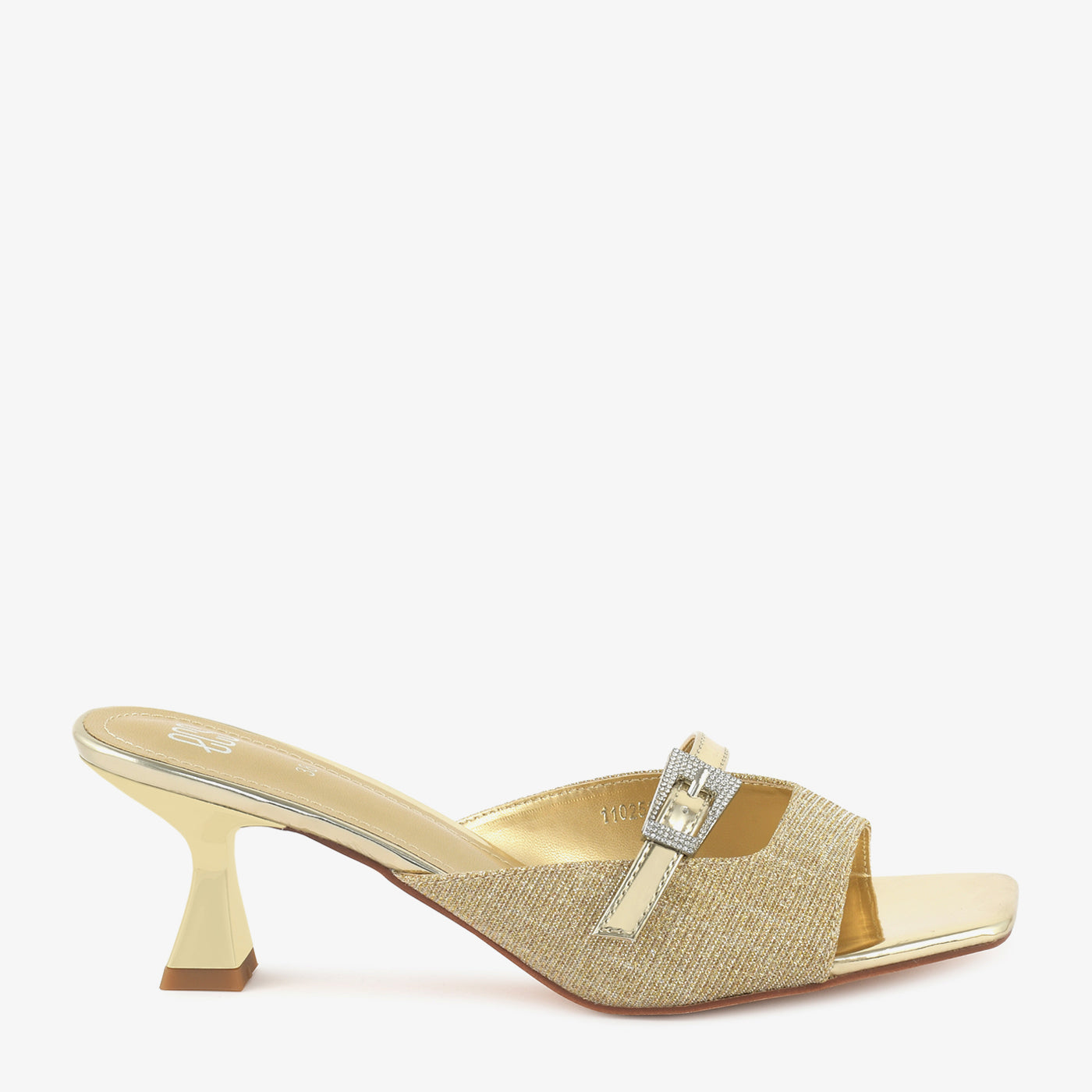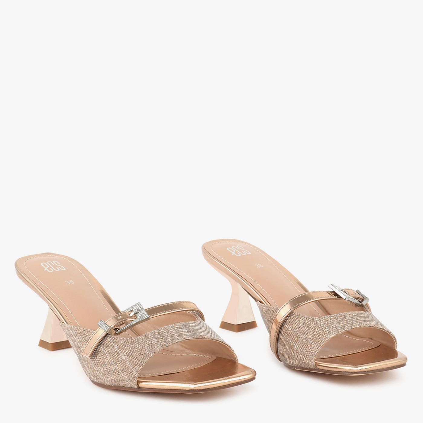 Step into subtle sparkle with these beige glitter heeled mules. The shimmering finish and the elegant jeweled buckle add a touch of refined glamour to your look. The unique heel provides a stylish lift for evening events or special occasions in Lahore.