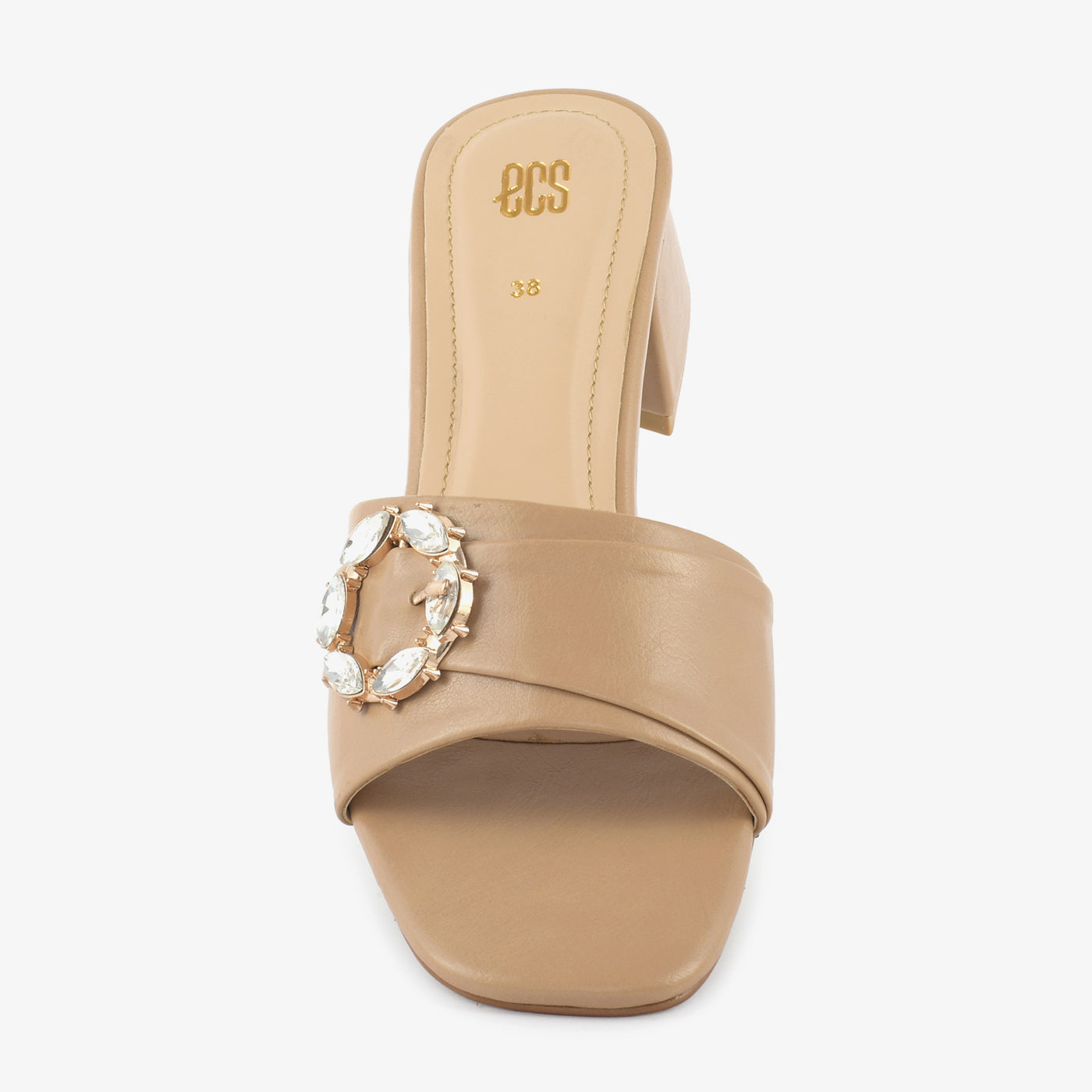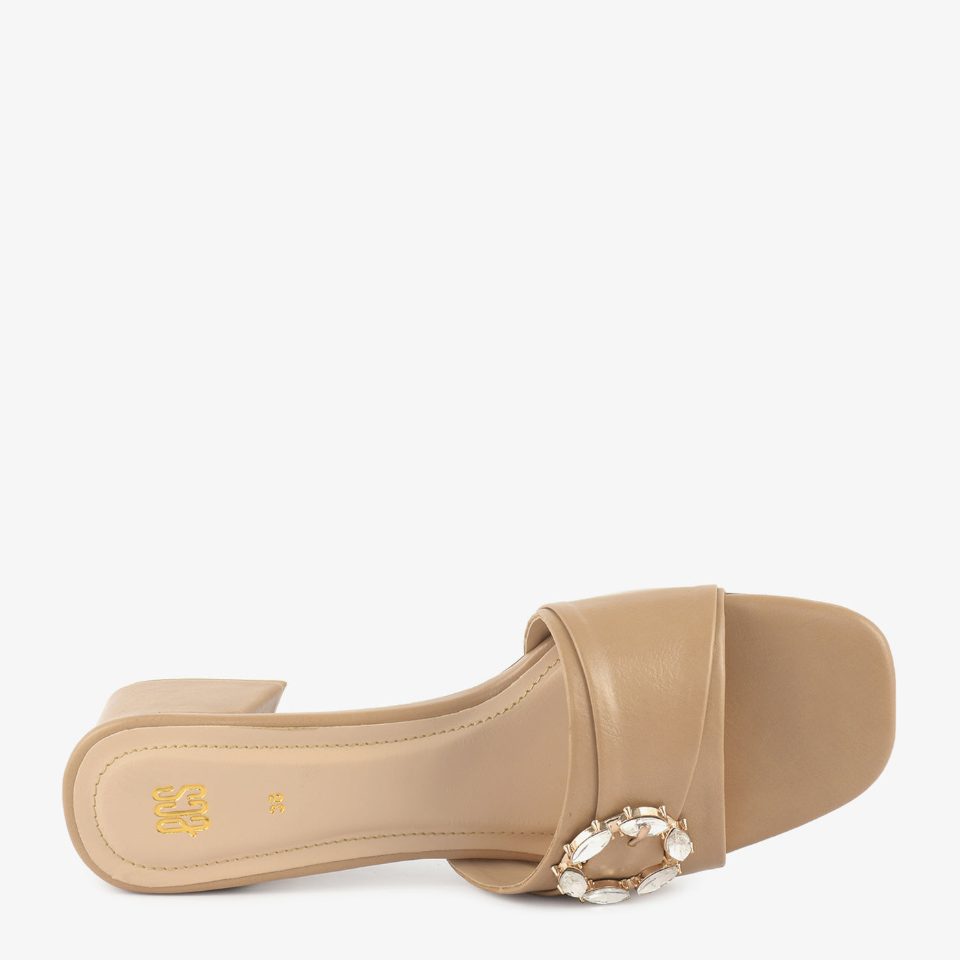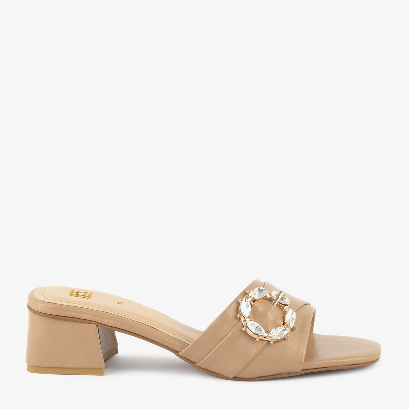 Step into subtle glamour with these beige block heel slides. The warm neutral tone is elevated by a beautiful jeweled circle embellishment, adding a touch of sparkle to your...