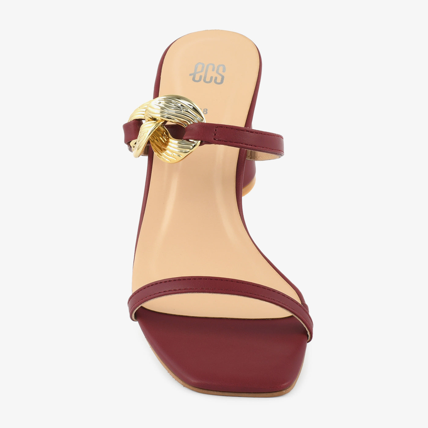 This statement heel features a rich maroon upper paired with an elegant gold-tone knot detail that adds a luxurious touch. The sleek open-toe design is balanced with slim front straps, giving it a refined and feminine silhouette. A sturdy block heel provides excellent stability while ensuring all-day comfort. The cushioned footbed supports the feet gracefully, making it ideal for extended wear. Designed to stand out, this heel effortlessly elevates both festive and evening ensembles.