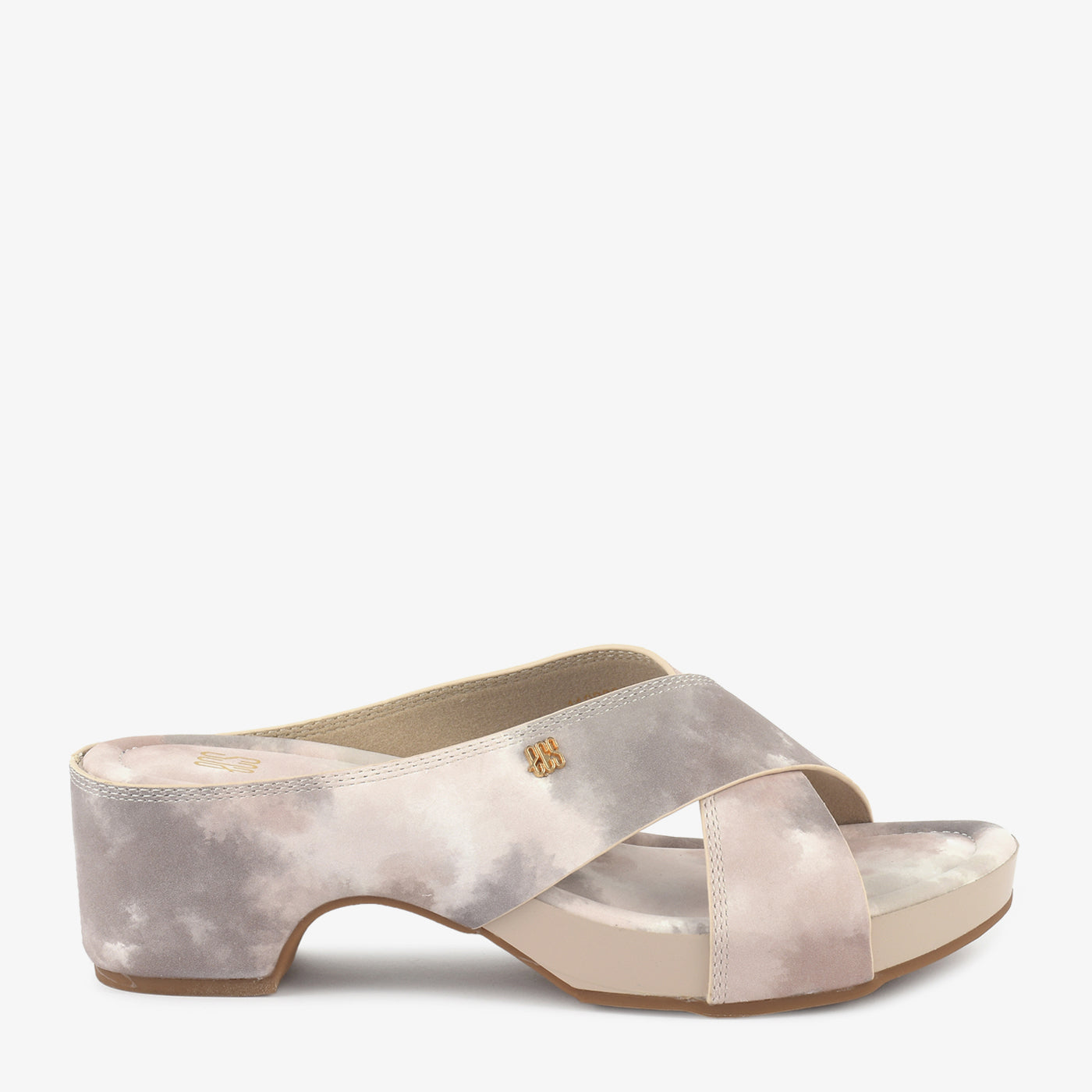 Step into soft comfort with these beige and grey block heel slides. The subtle tie-dye effect on the cross straps adds a touch of unique style to your everyday...