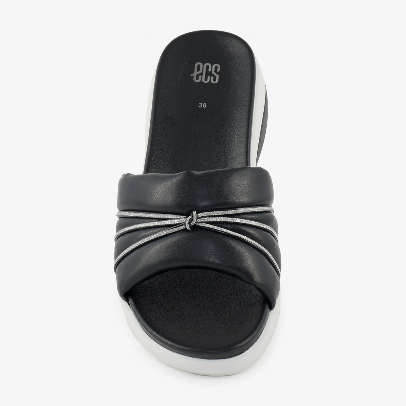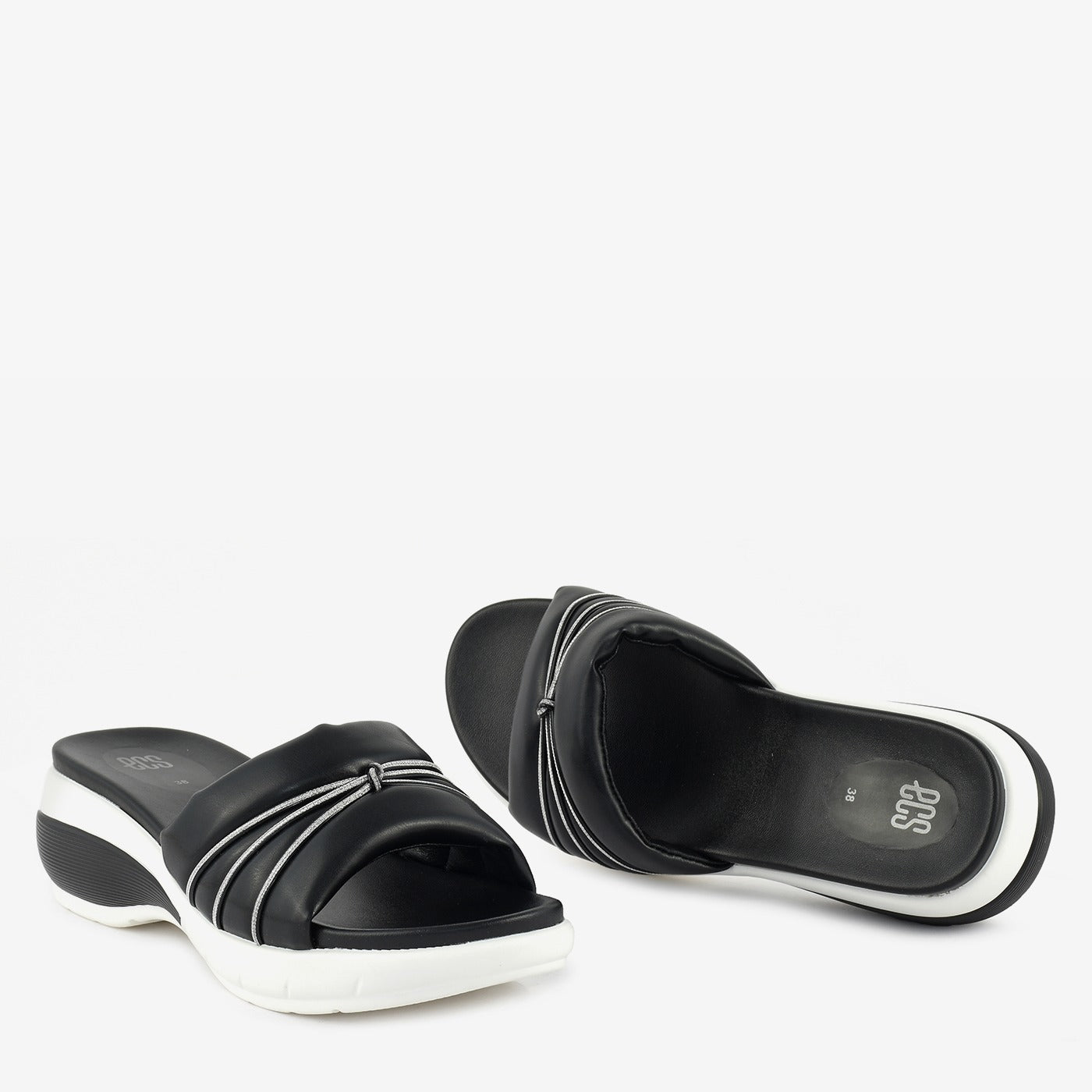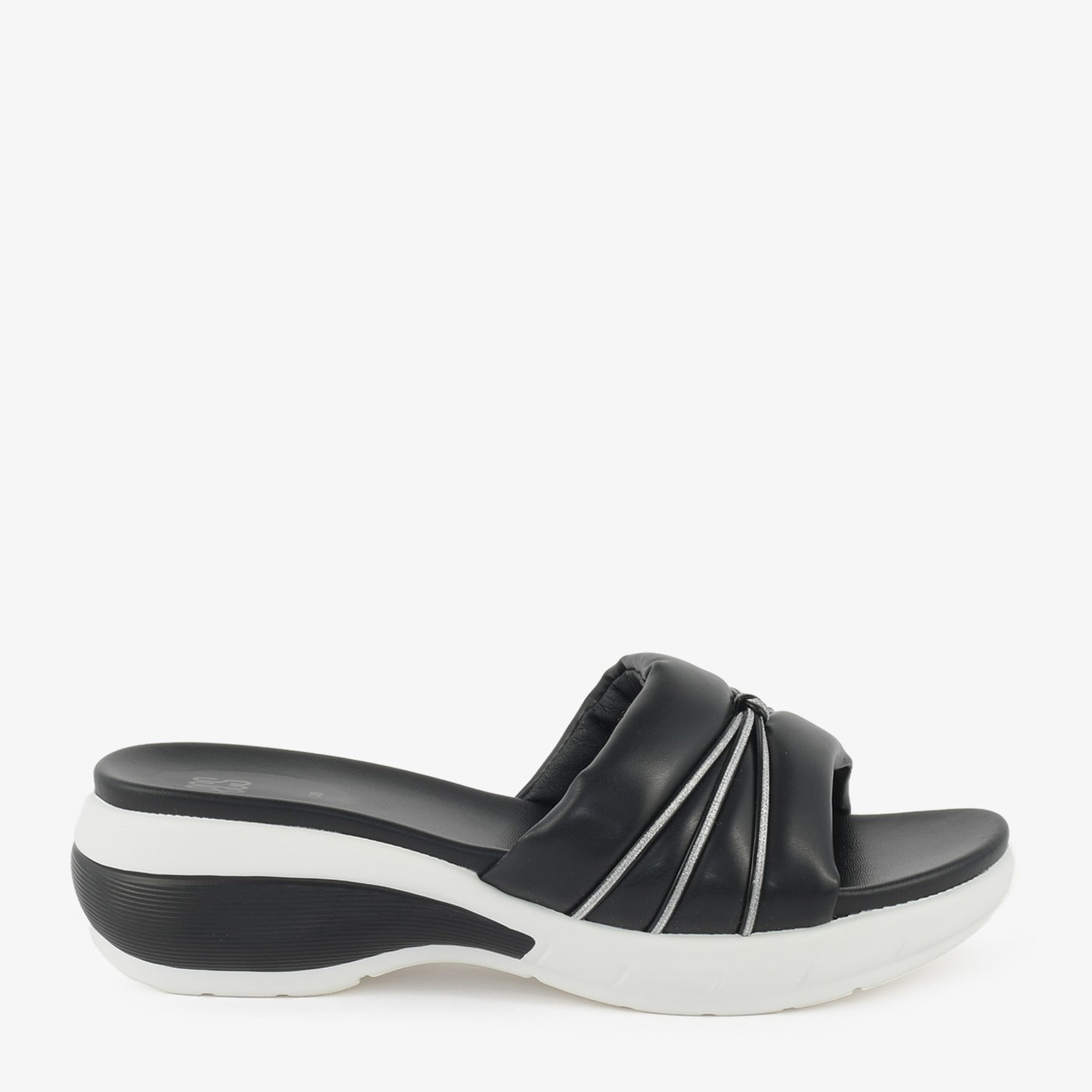 - Design: Wide strap with bow and metallic detail, Wedge heel, Slip-on style