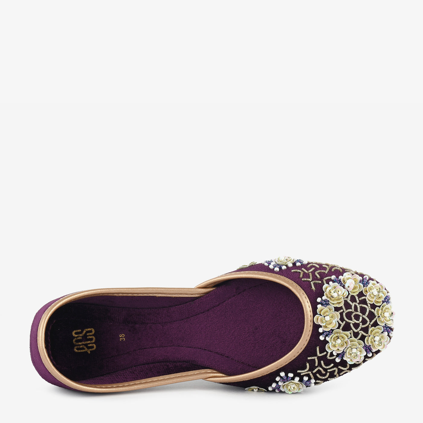 A richly embroidered khussa with delicate floral patterns for an elegant touch. The soft velvet finish enhances its ethnic charm and comfort.
