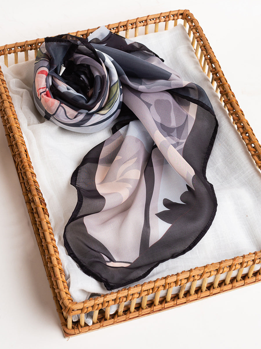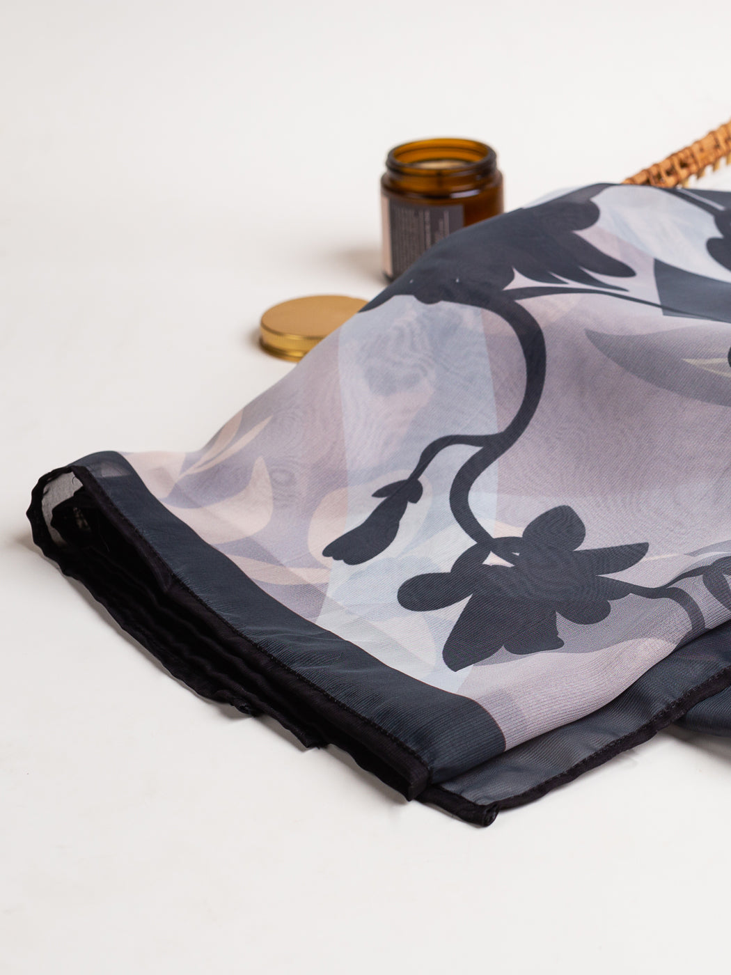 A semi-sheer scarf with soft floral silhouettes and a balanced composition. The minimal contrasts and large patterns keep it understated yet stylish.