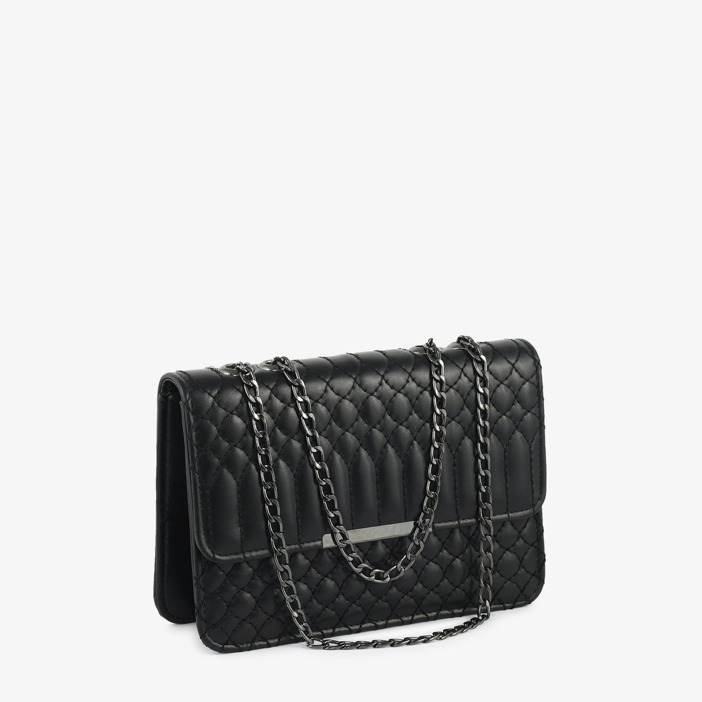 The "Noir Quilt" bag is an elegant statement piece featuring intricate quilted detailing and a sleek gunmetal chain strap. Its compact size and structured silhouette make it perfect for day-to-night transitions.