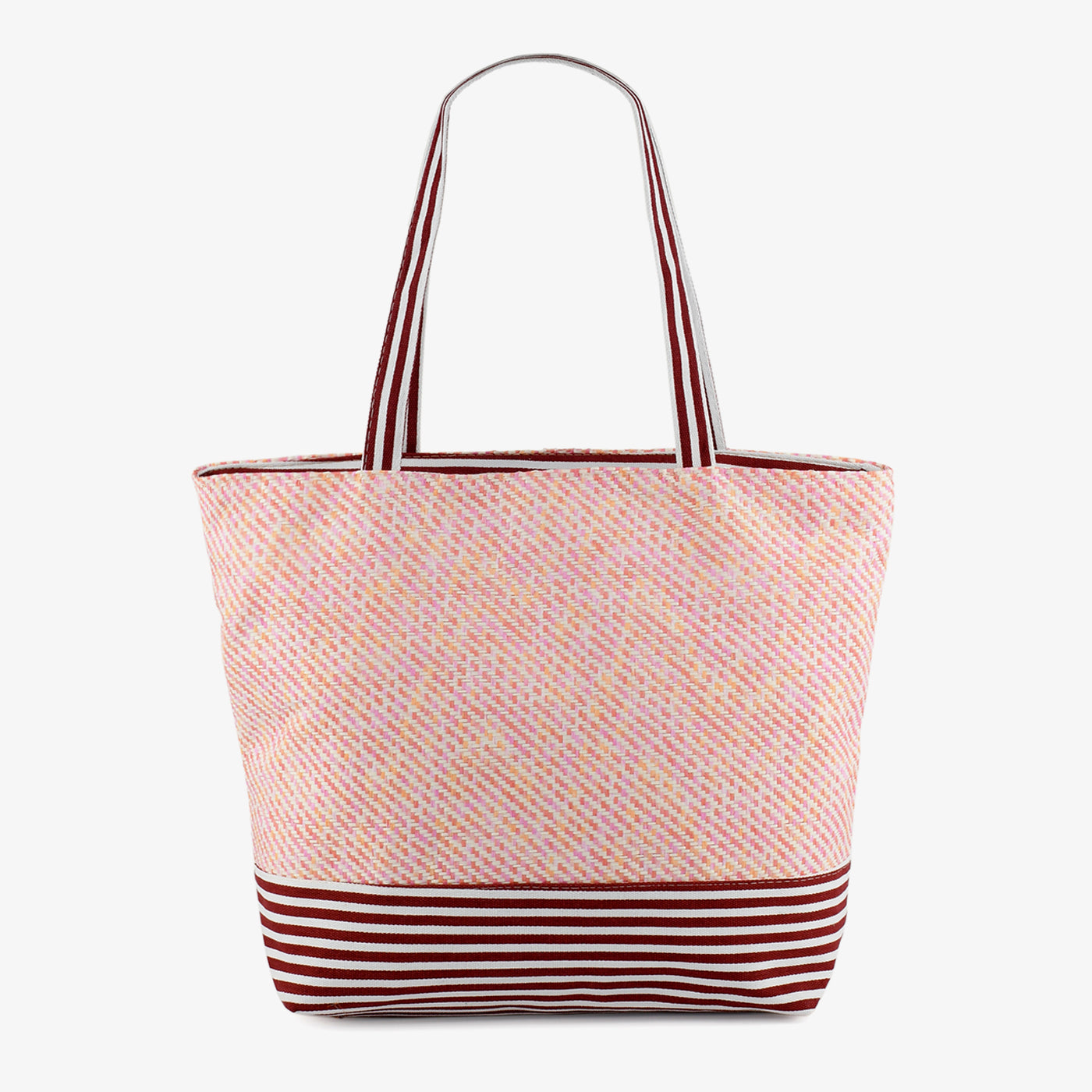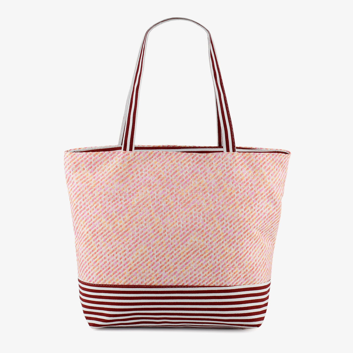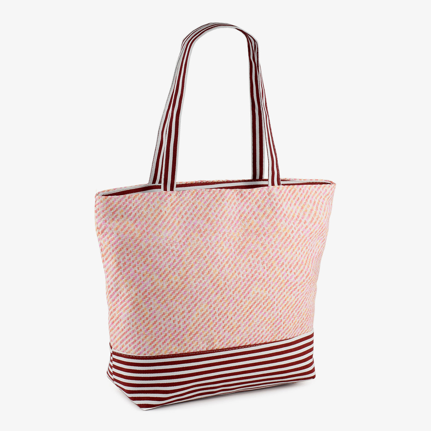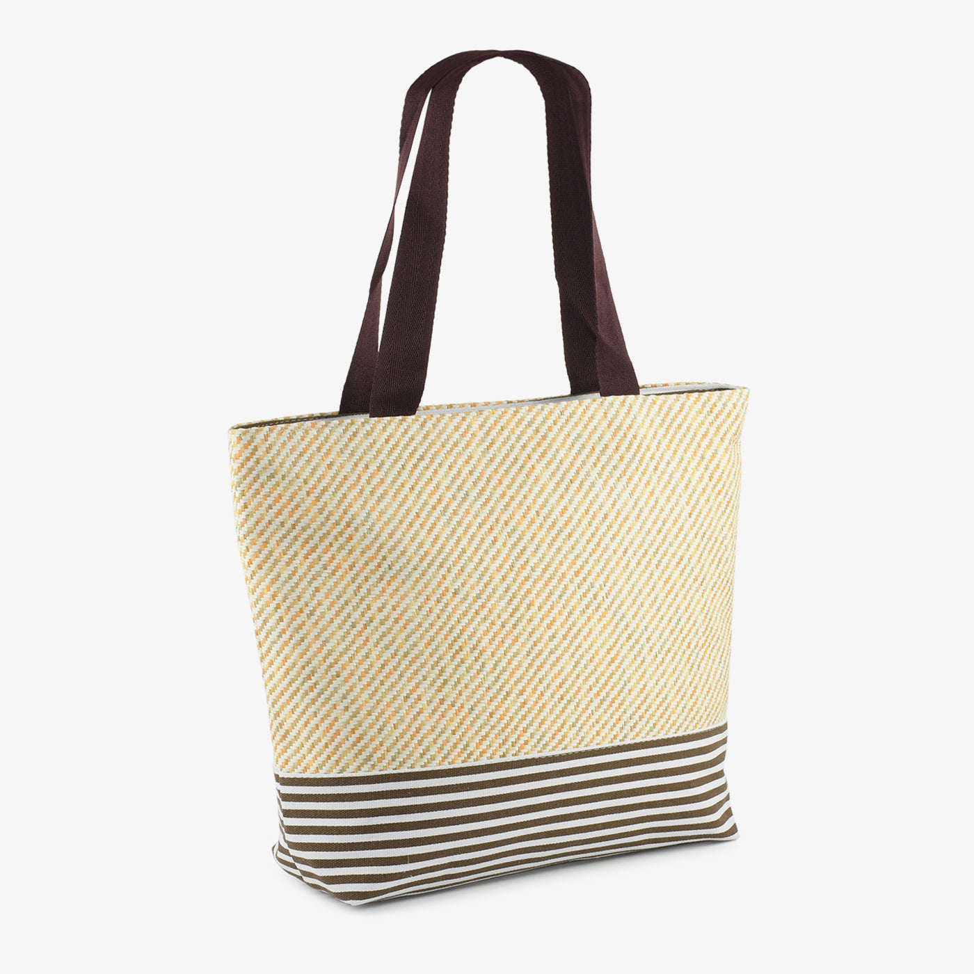 • Design: Tote bag with woven texture, striped detailing, and shoulder handles