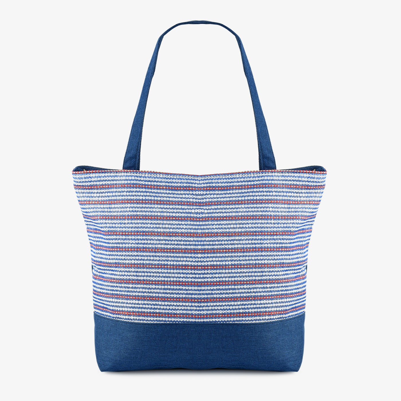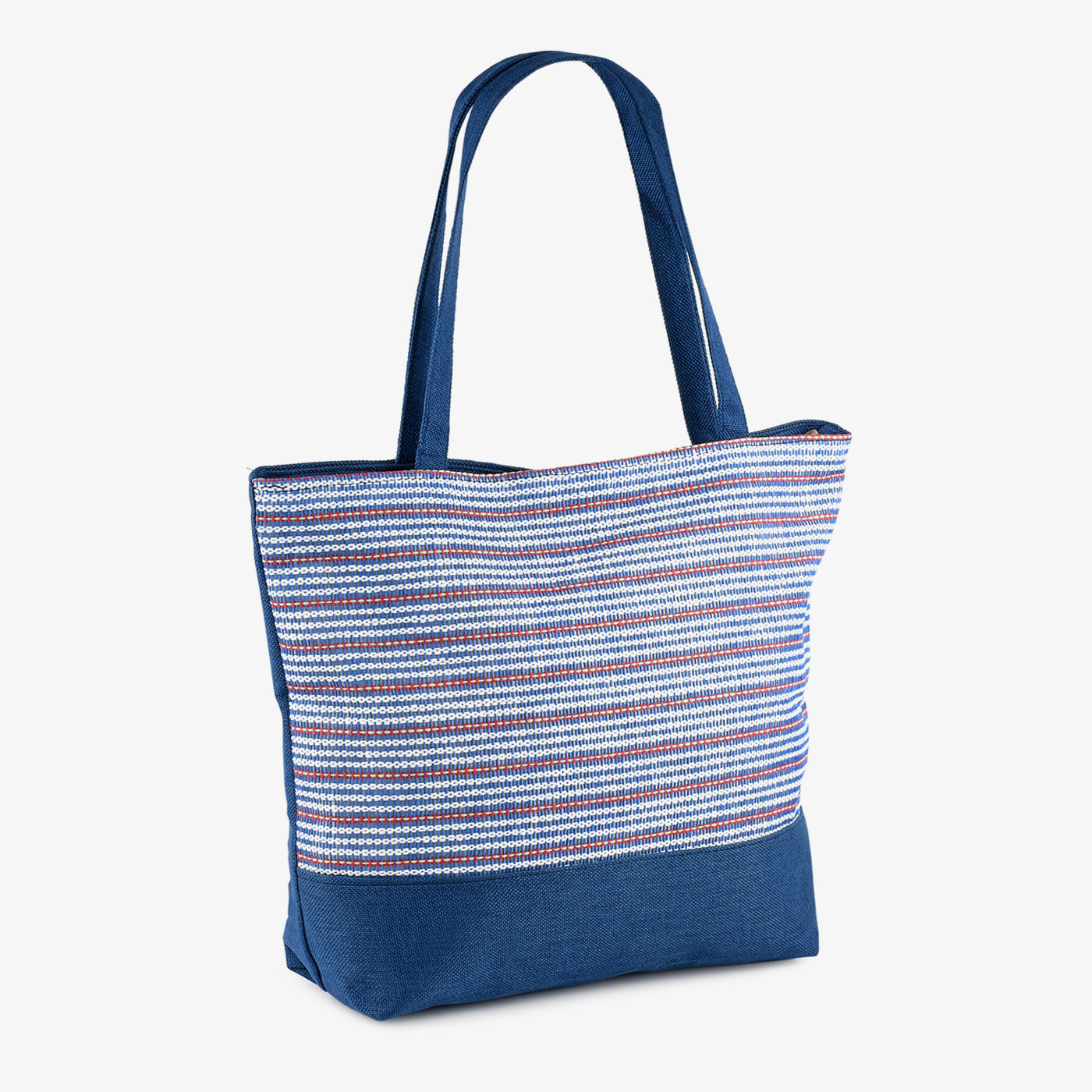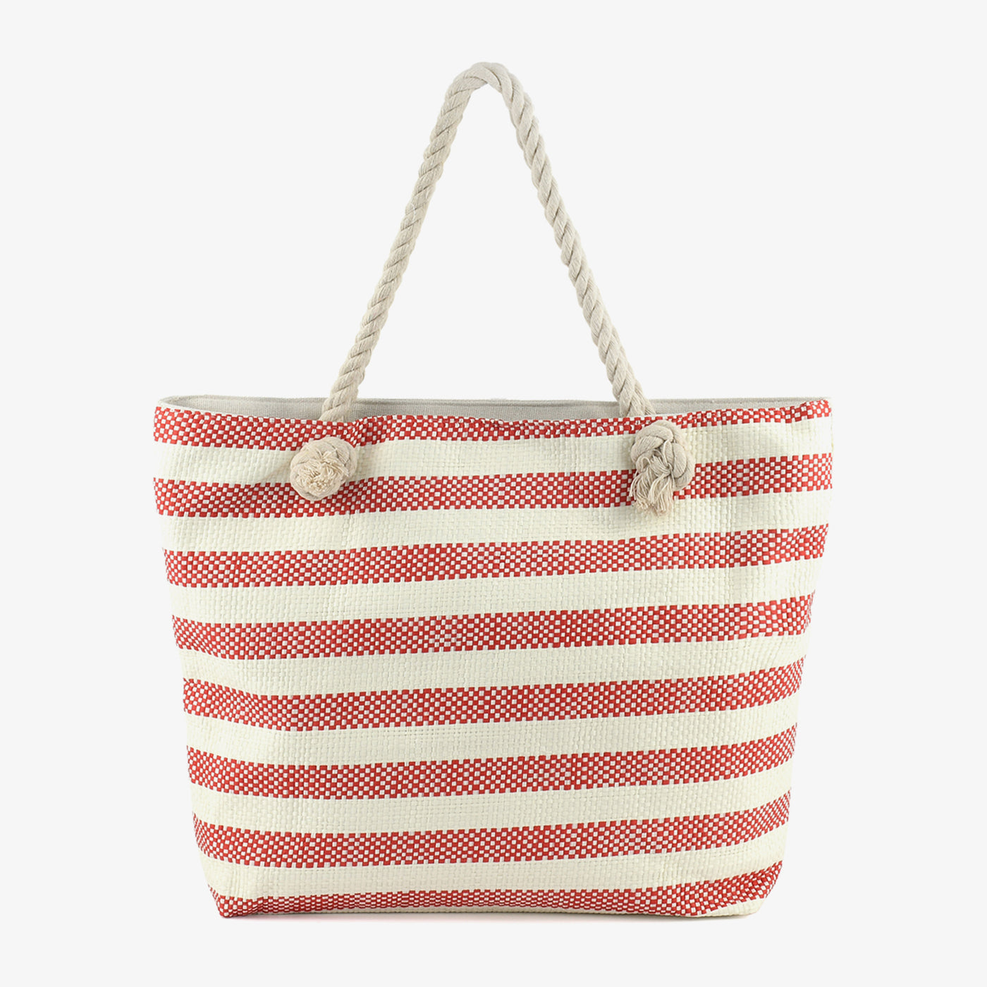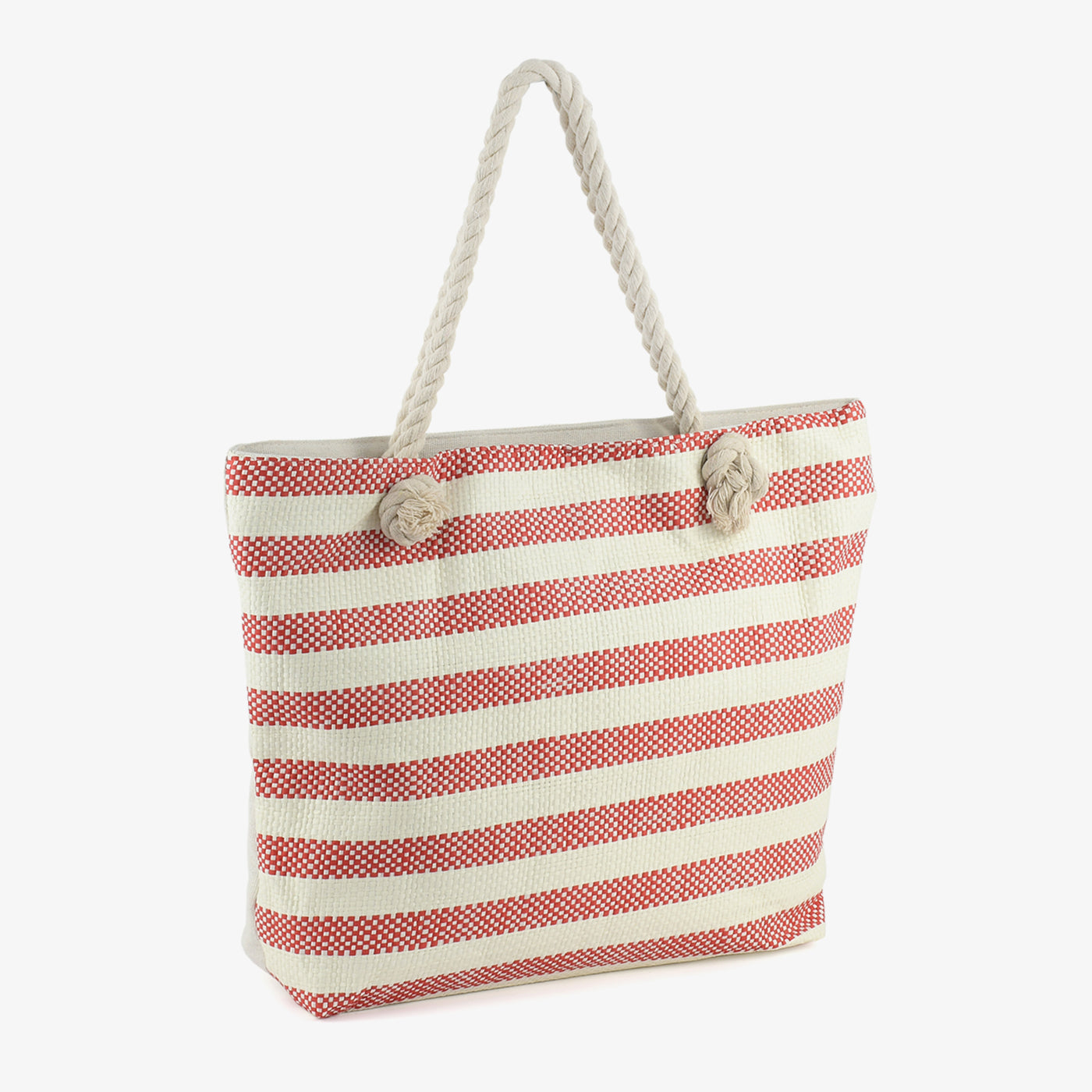 • Design: Tote bag with woven texture, striped detailing, and shoulder handles