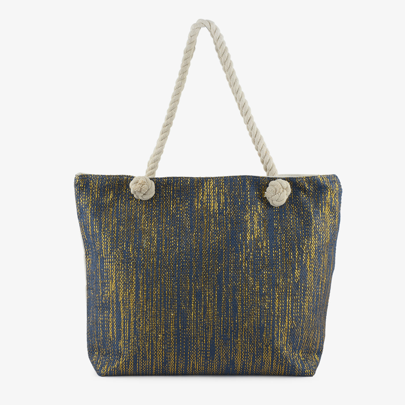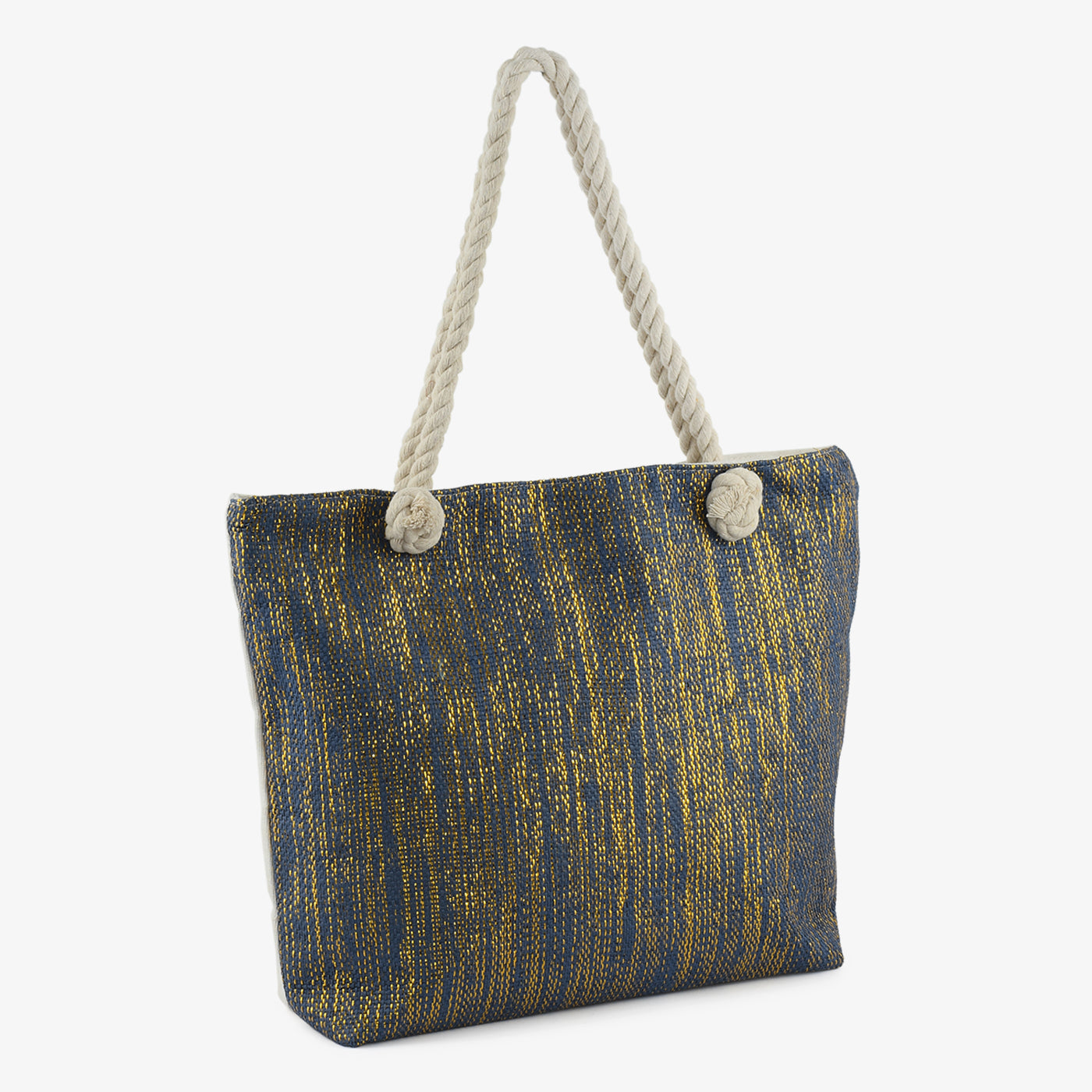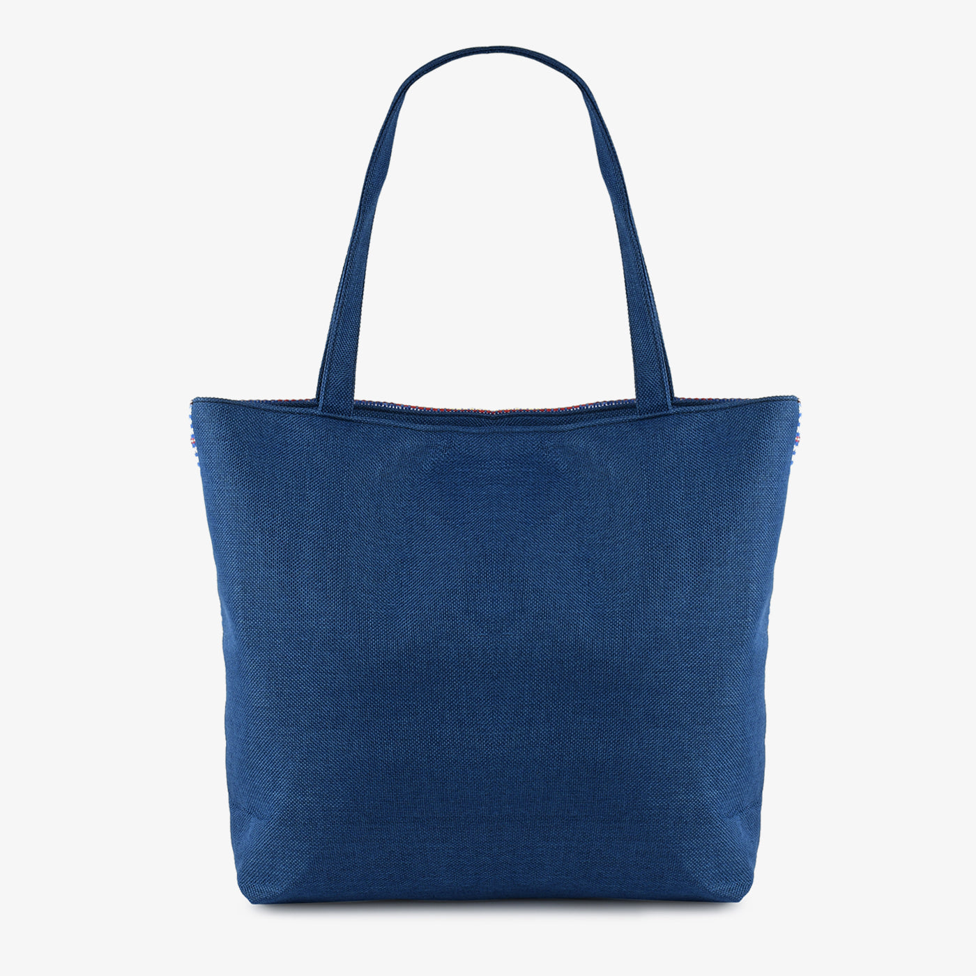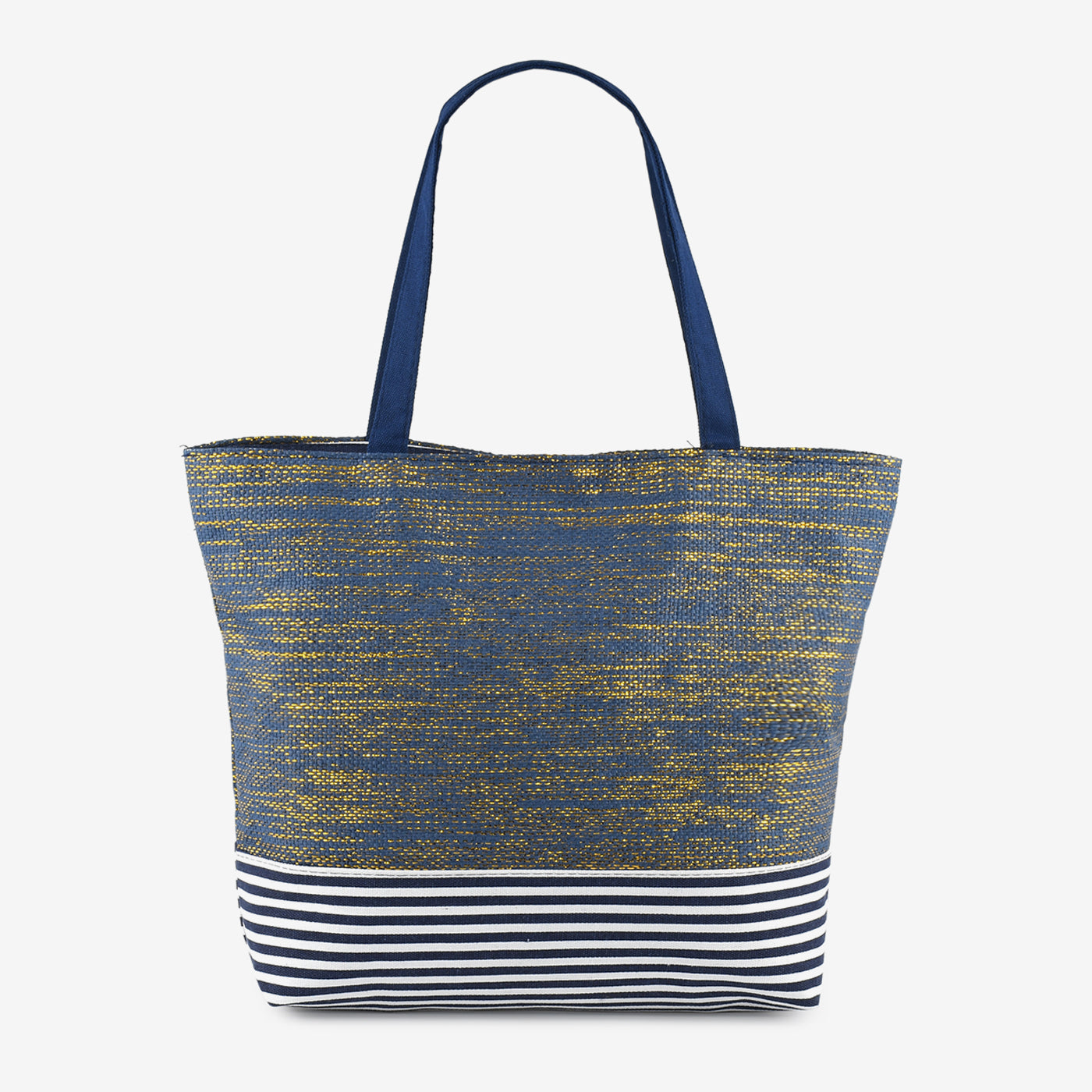 • Design: Tote bag with woven texture, striped detailing, and shoulder handles