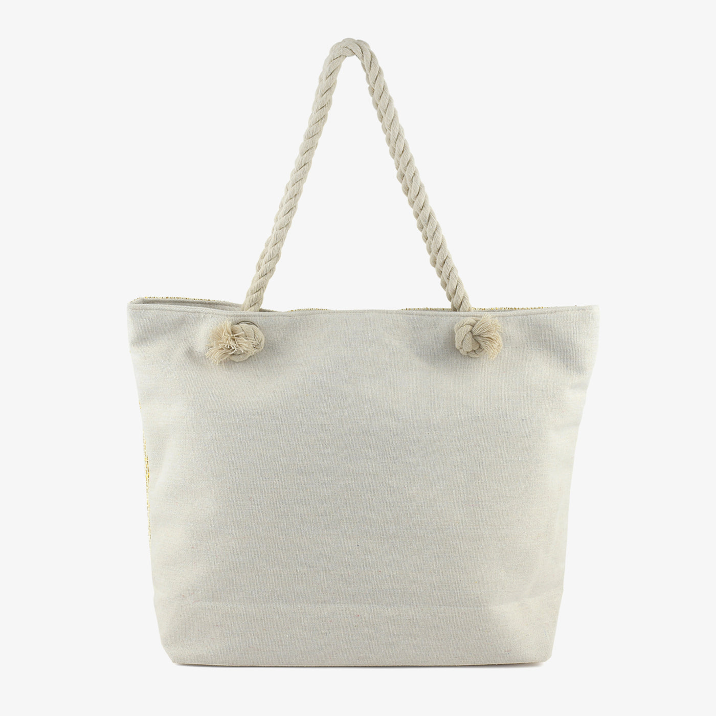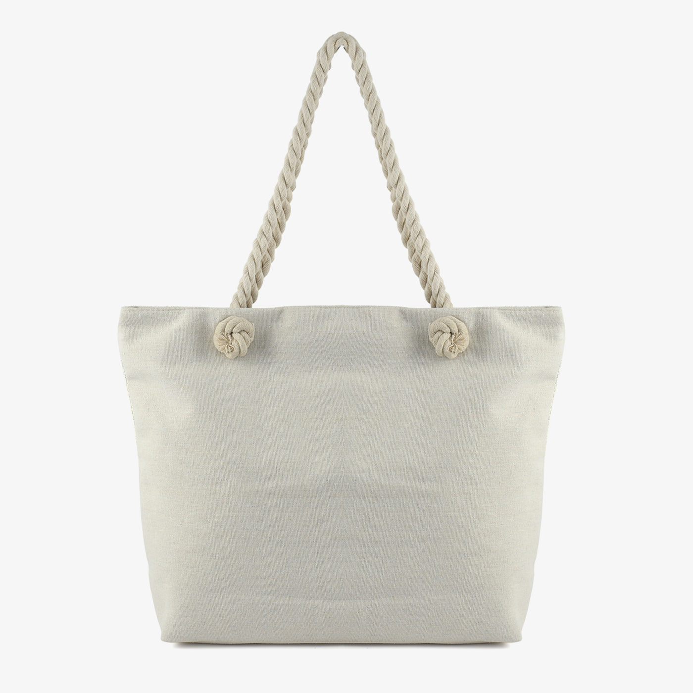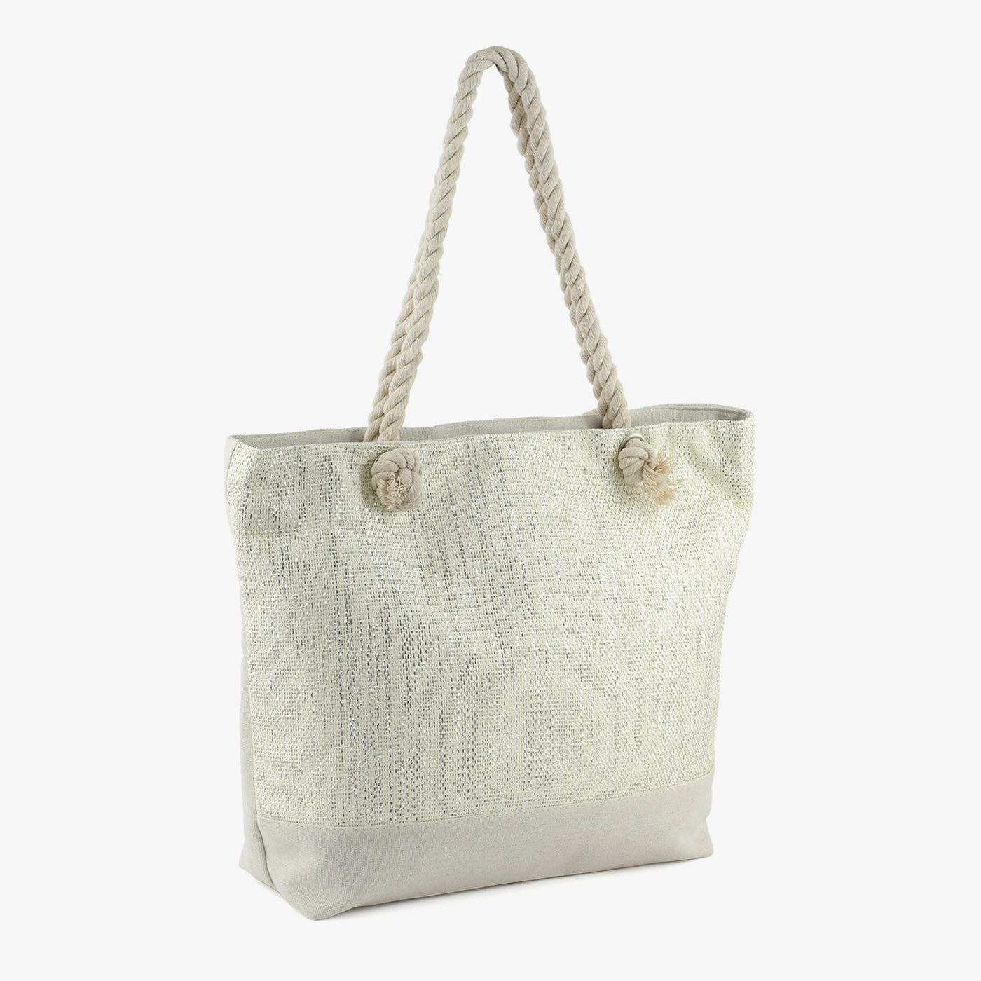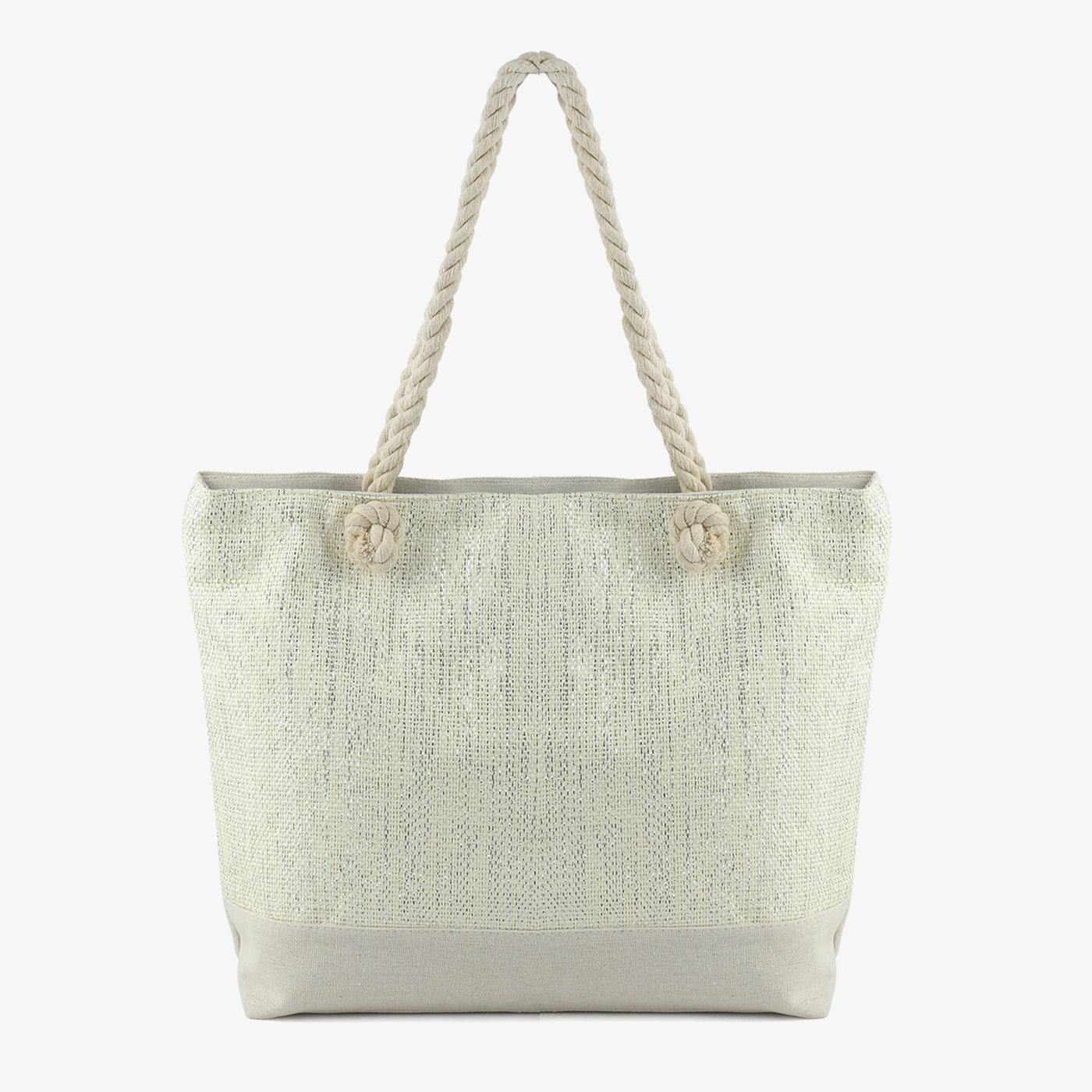 • Design: Tote bag with woven texture, striped detailing, and shoulder handles