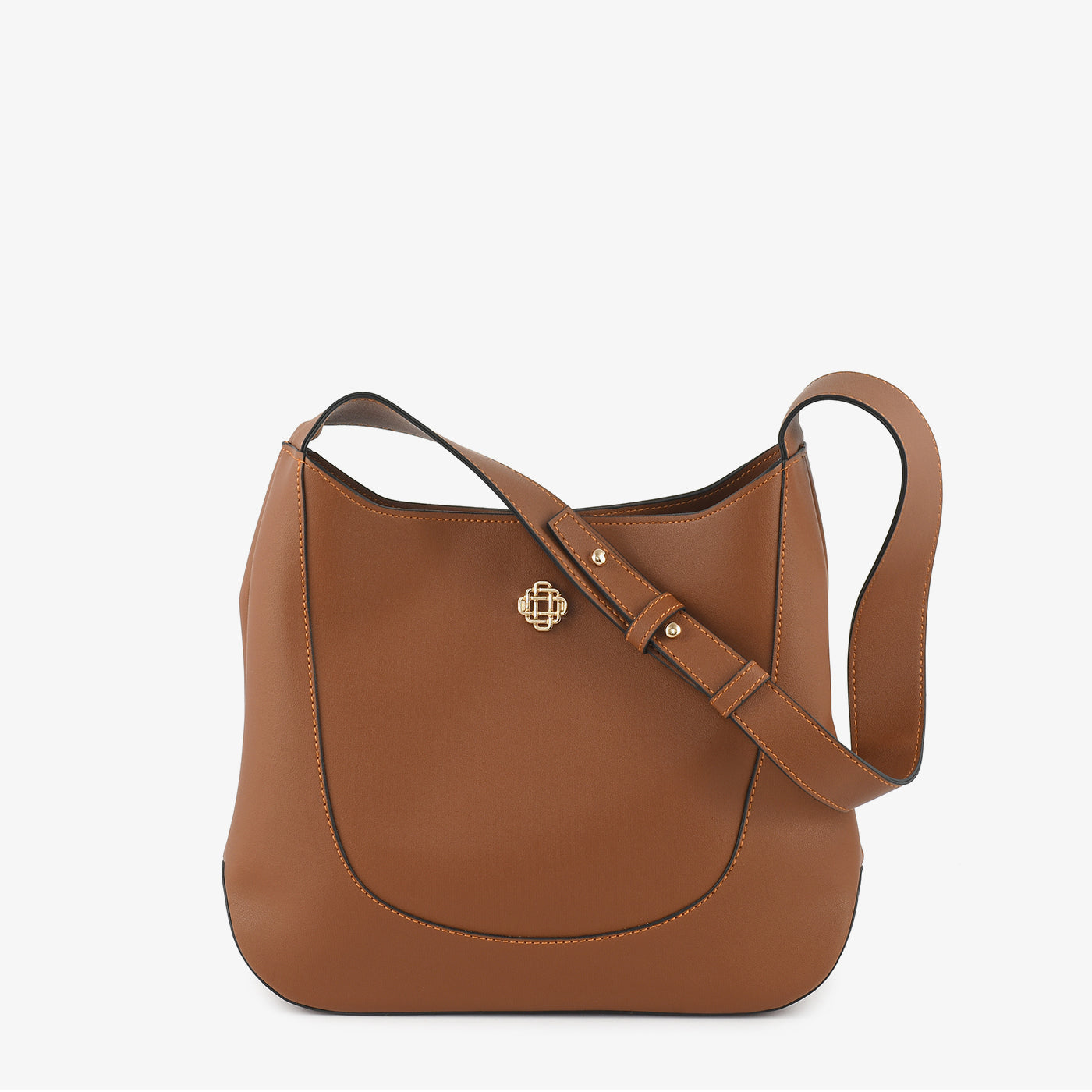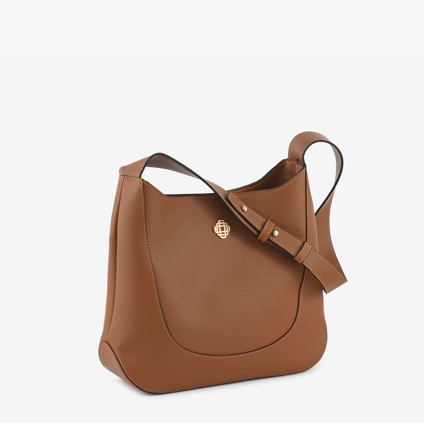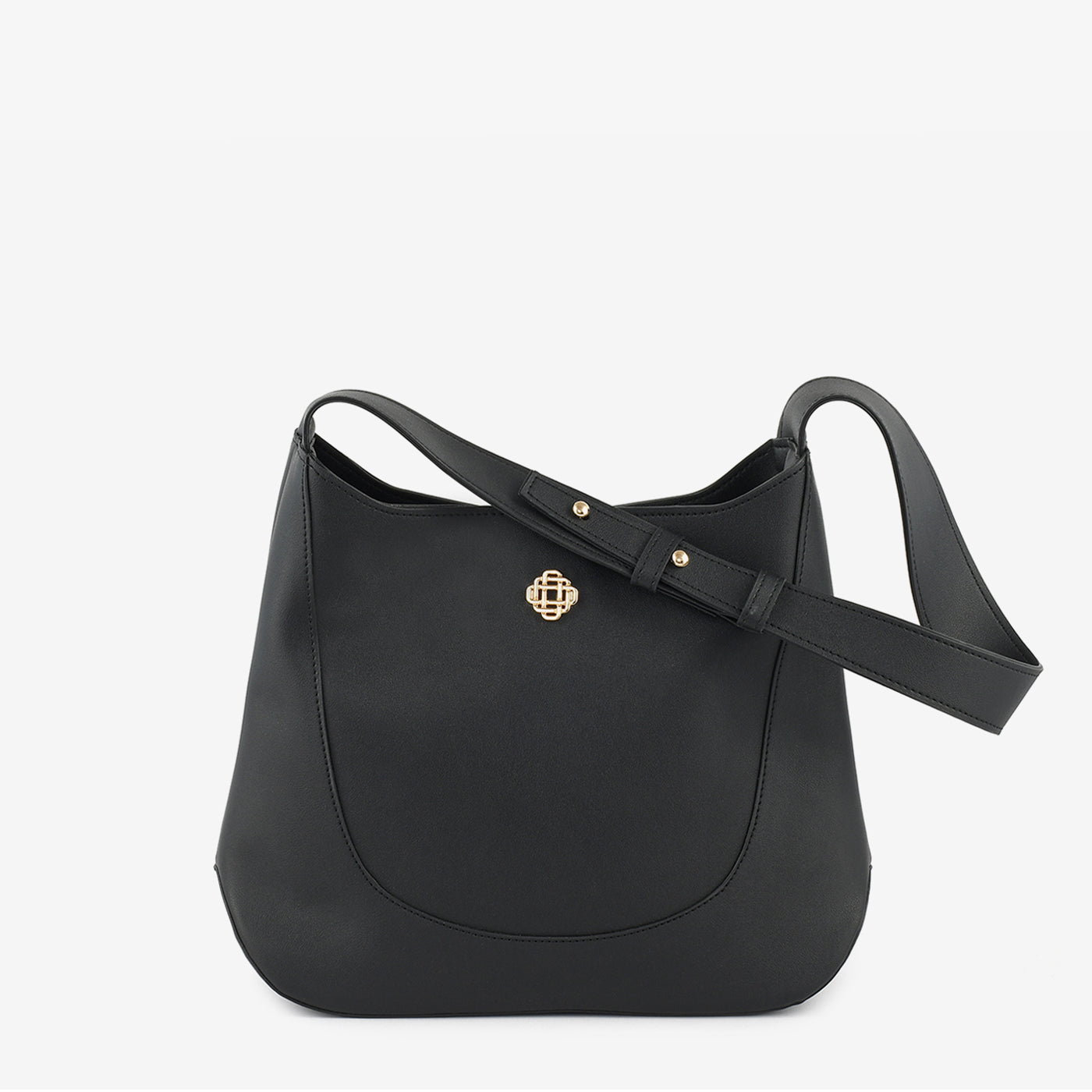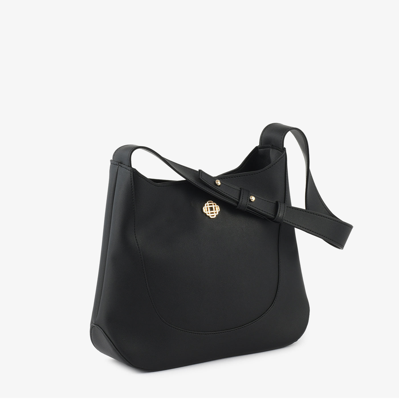 Spacious and everyday-ready, this large structured open-top hobo bag features a pebbled leather-finish exterior with a clean curved panel seam that runs along the front and base, giving the bag a refined and architectural silhouette. A small gold lattice logo badge sits at the centre front as a subtle and distinctive brand detail. The wide flat adjustable shoulder strap with a buckle slider and gold stud hardware provides a comfortable and secure carry for everyday casual and smart casual use.