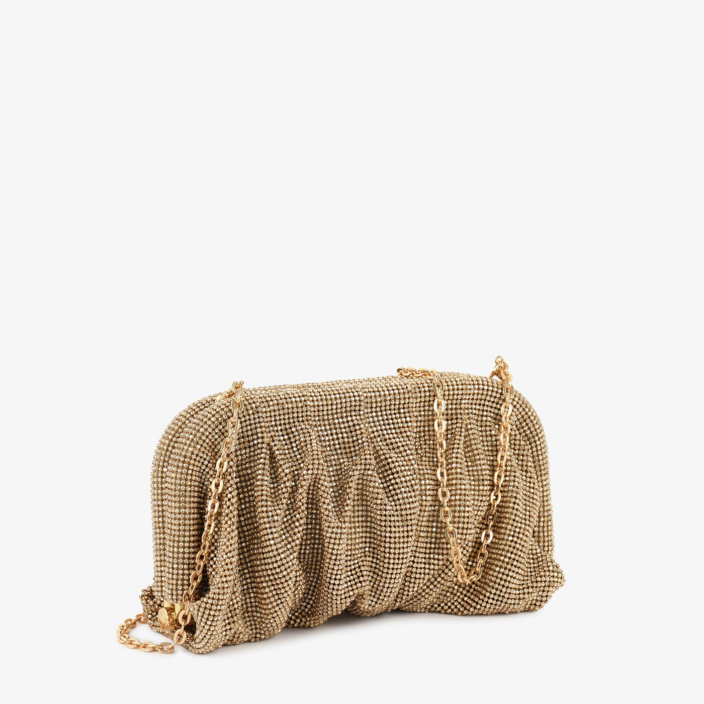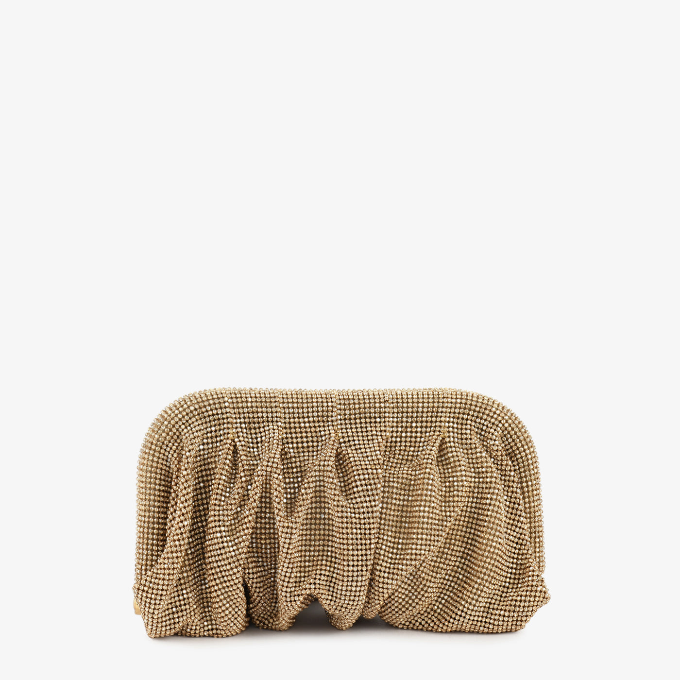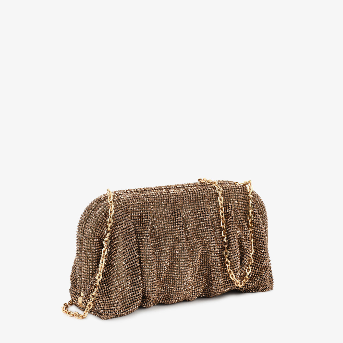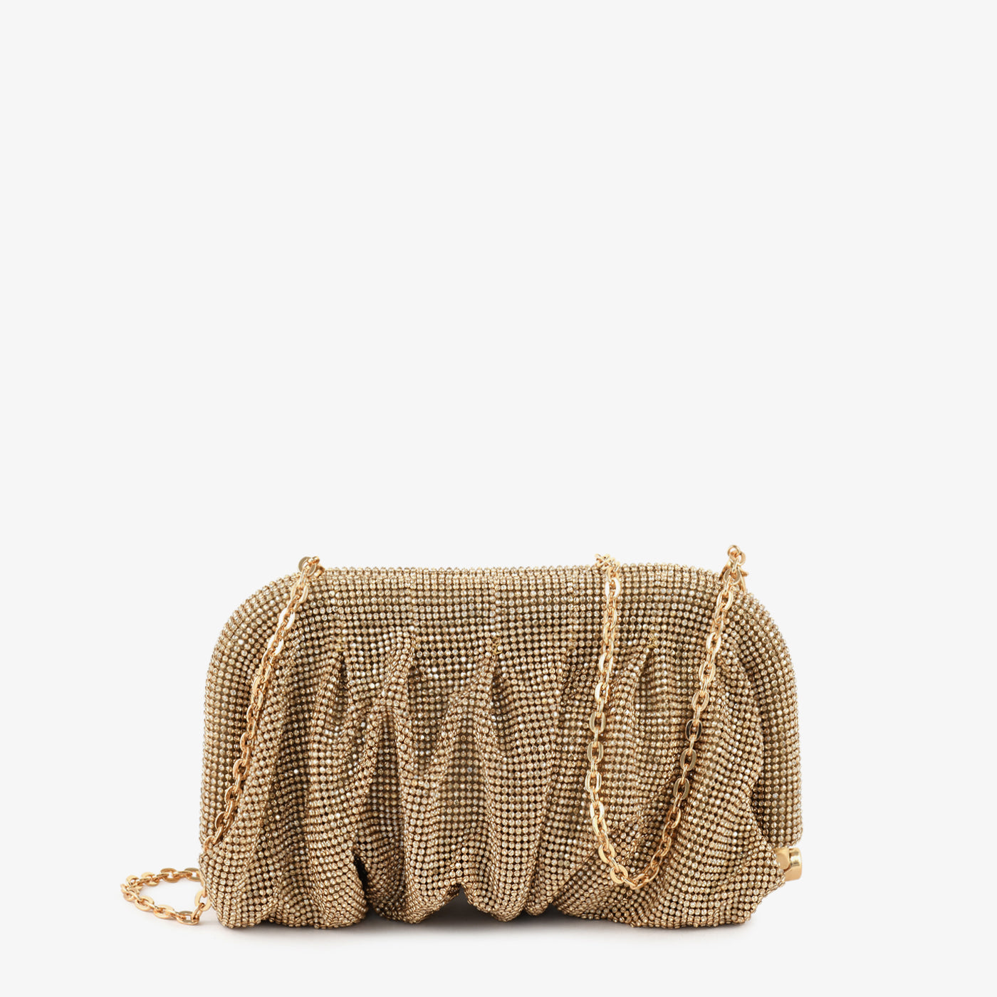 This ruched clutch with a delicate chain strap brings together timeless grace and modern sparkle. Its fluid design and shimmering finish make it a versatile piece for both evening gatherings and formal dinners.