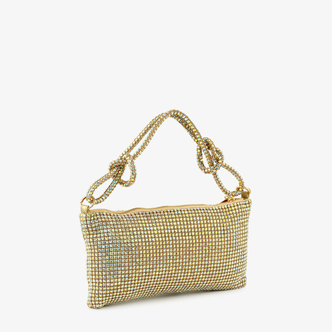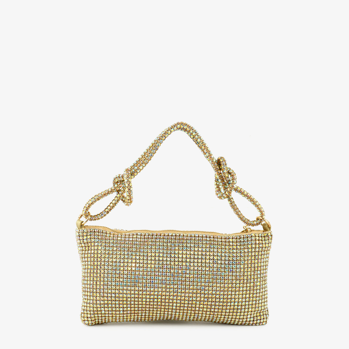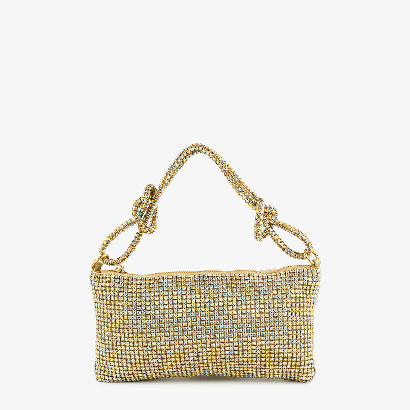 Shoulder bag with full crystal mesh covering and a distinctive knotted chain strap design. The rectangular silhouette offers practical storage for essentials during evening events. Crafted with a secure closure...