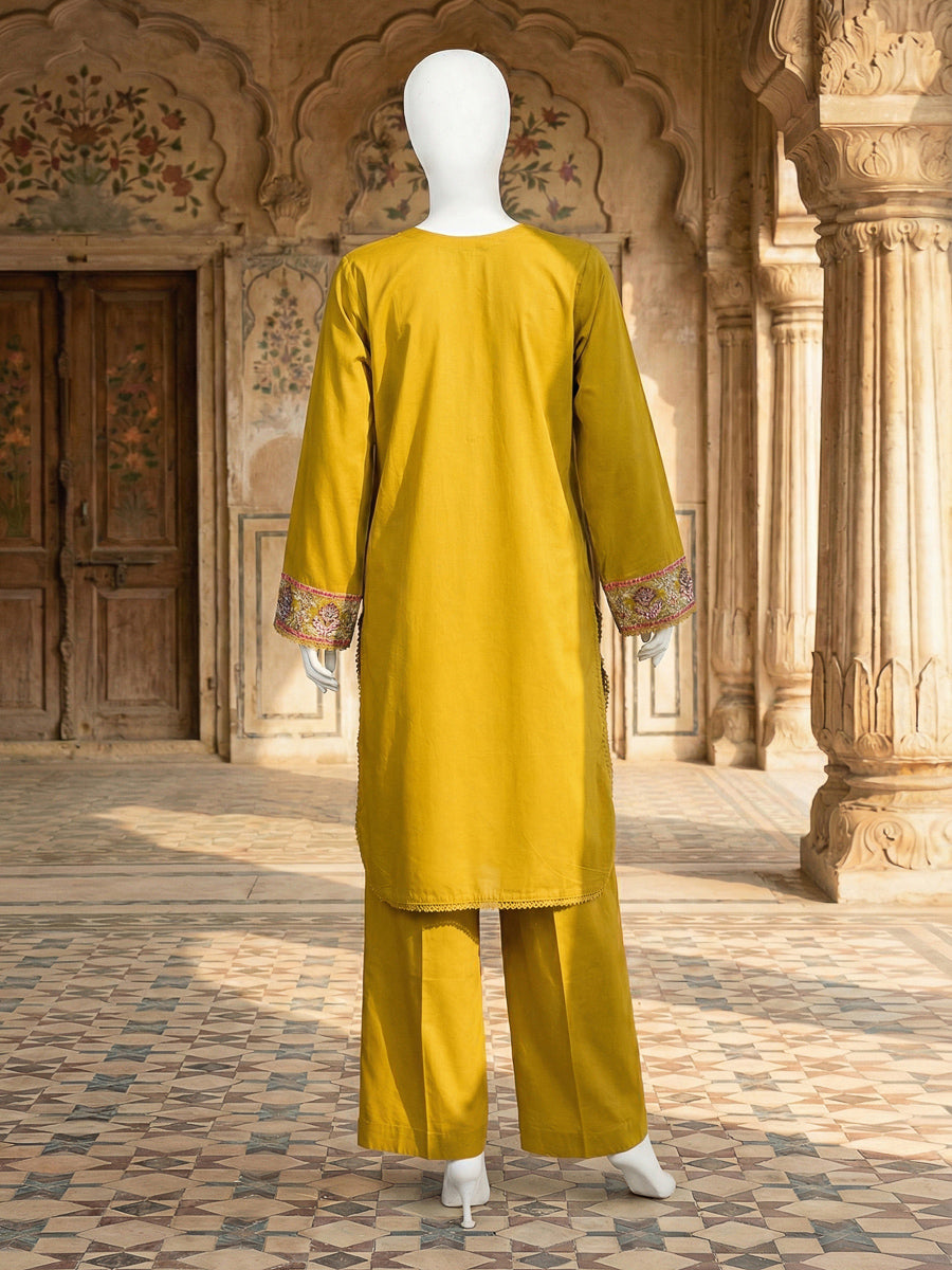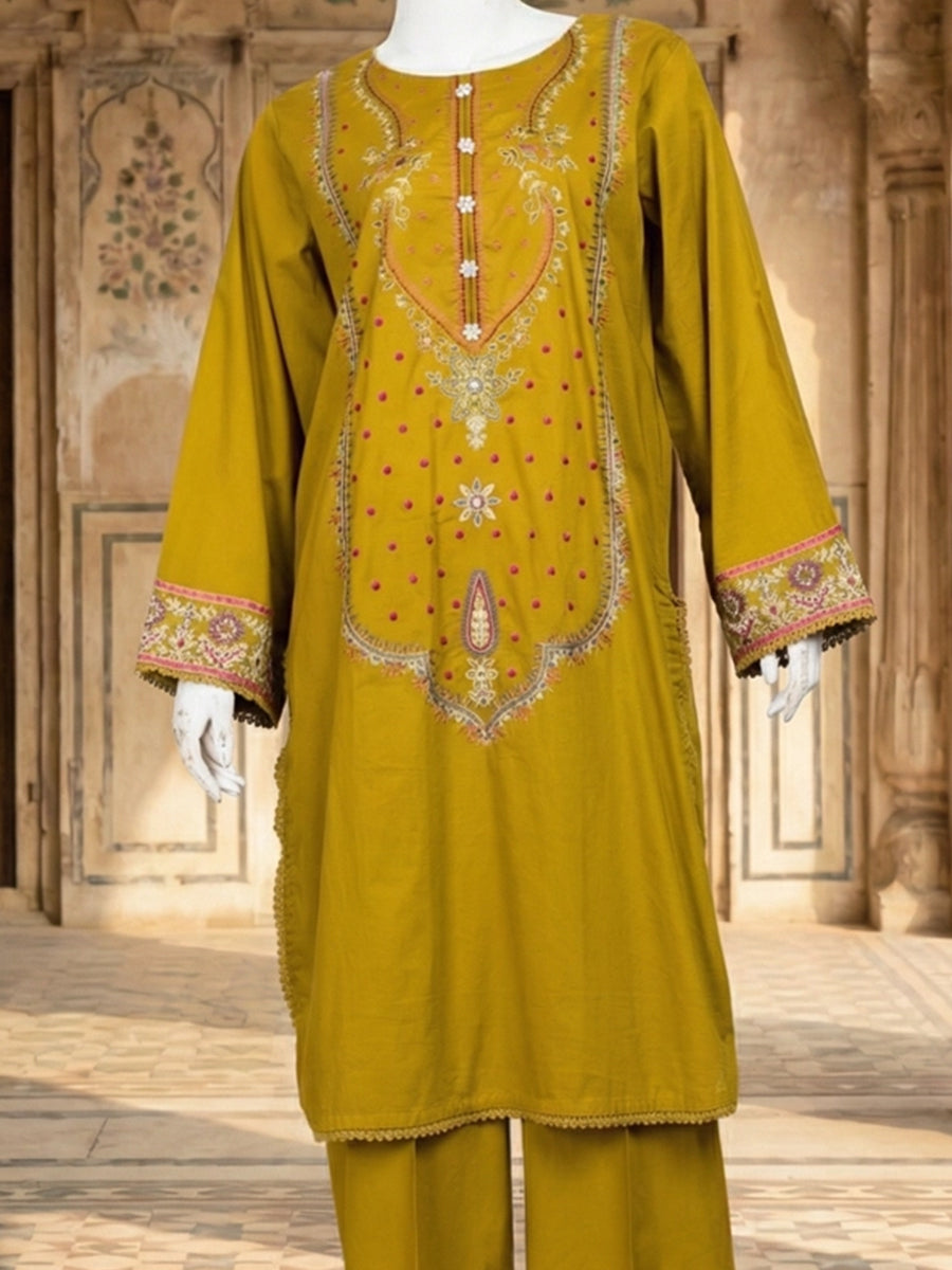 Heritage Bloom 2 Piece is a beautifully detailed outfit that blends traditional artistry with everyday comfort. The shirt is crafted from lawn, offering a lightweight and breathable feel ideal for all-day wear. It is paired with a cambric shalwar that provides a relaxed and easy silhouette, ensuring comfort and mobility. The medium-length basic shirt delivers modest coverage while maintaining a graceful and structured look. Intricate embroidery-inspired patterns on the front, along with finely detailed sleeves and borders, add a refined and elegant touch to the overall design. The outfit reflects a timeless aesthetic, making it suitable for both casual gatherings and semi-formal settings.