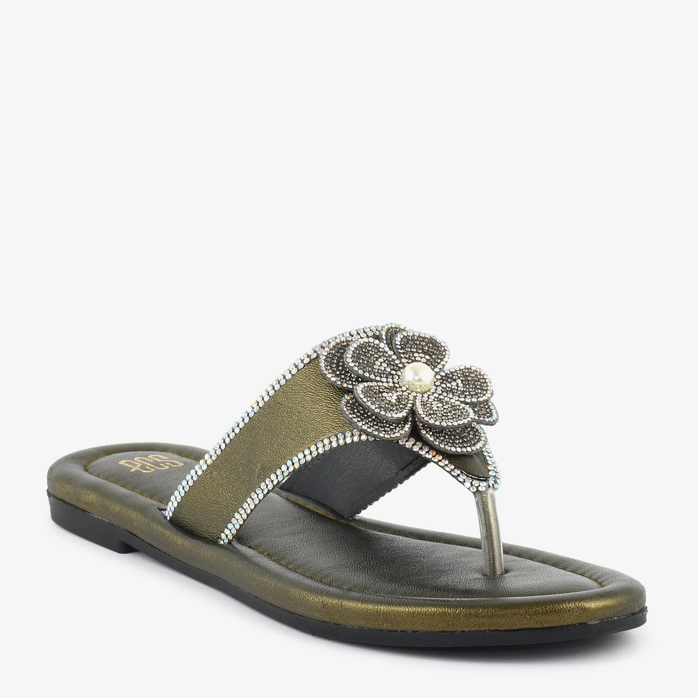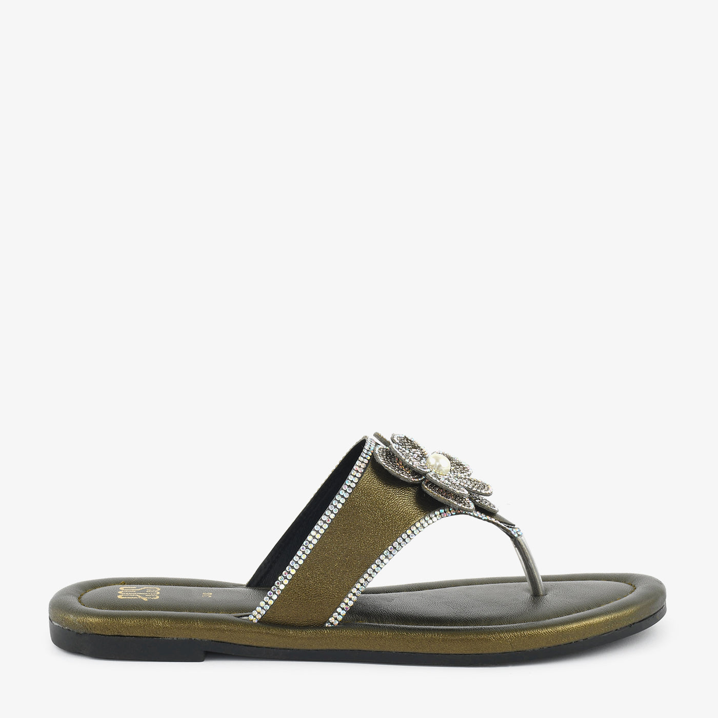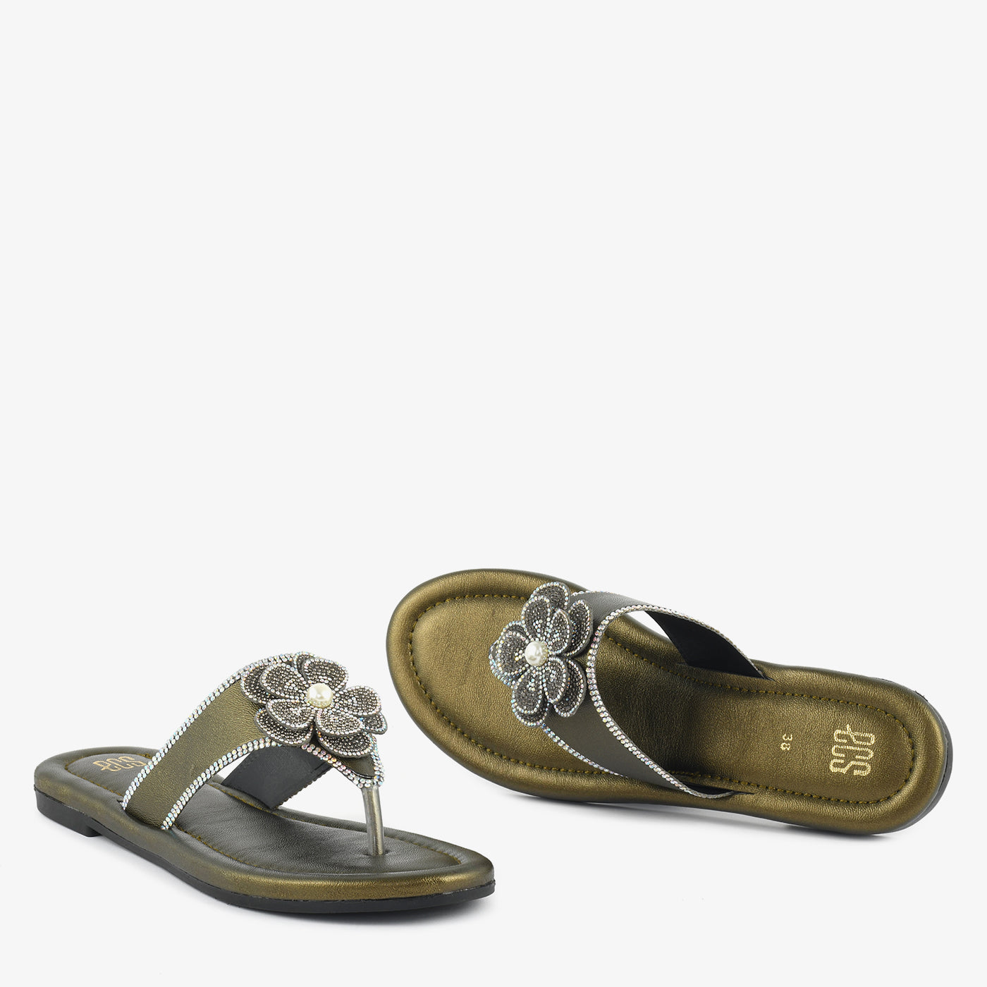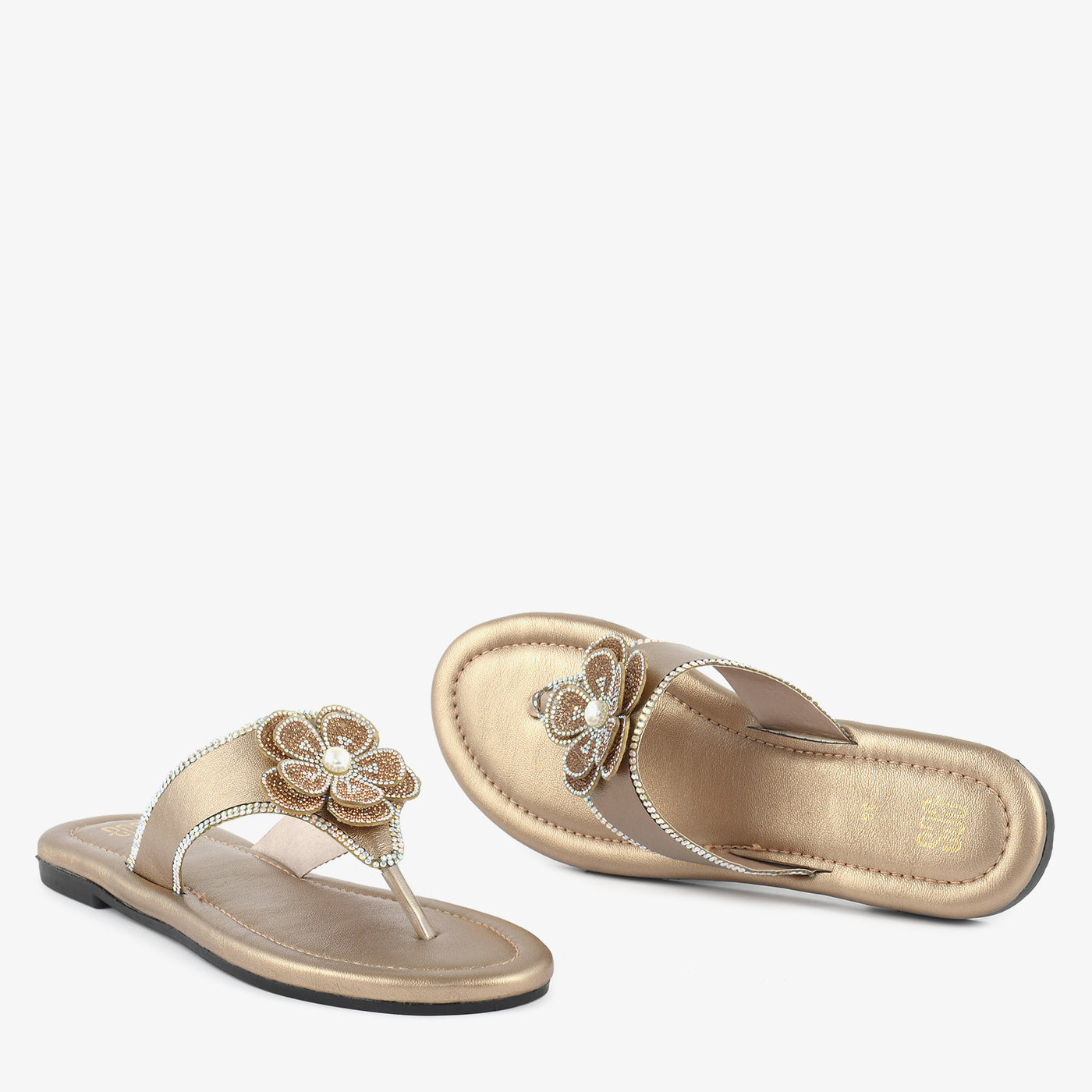 Crafted to elevate everyday elegance, this thong chappal blends comfort with refined detail. The softly cushioned footbed ensures lasting ease, while the smooth flat sole provides stable support for all-day wear. A beautifully embellished floral accent sits gracefully on the upper strap, highlighted with delicate crystal detailing for a luminous finish. The lightweight construction enhances flexibility and comfort with every step. Designed to complement both casual and dressy looks, this chappal transitions effortlessly from day outings to special gatherings. Its polished texture and intricate craftsmanship make it a timeless addition to any modern footwear collection. Perfect for women who appreciate subtle sophistication in their slipper choices.