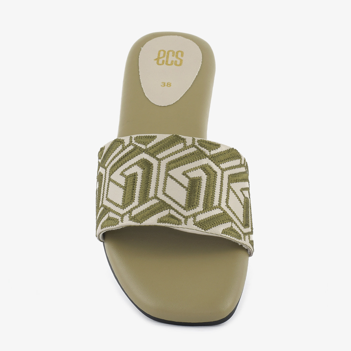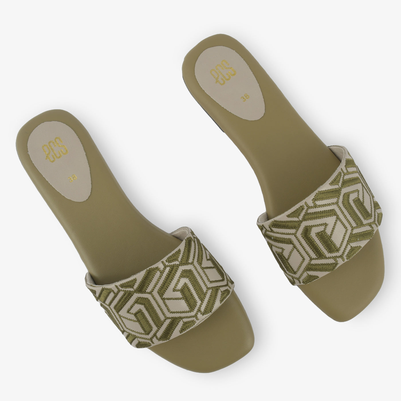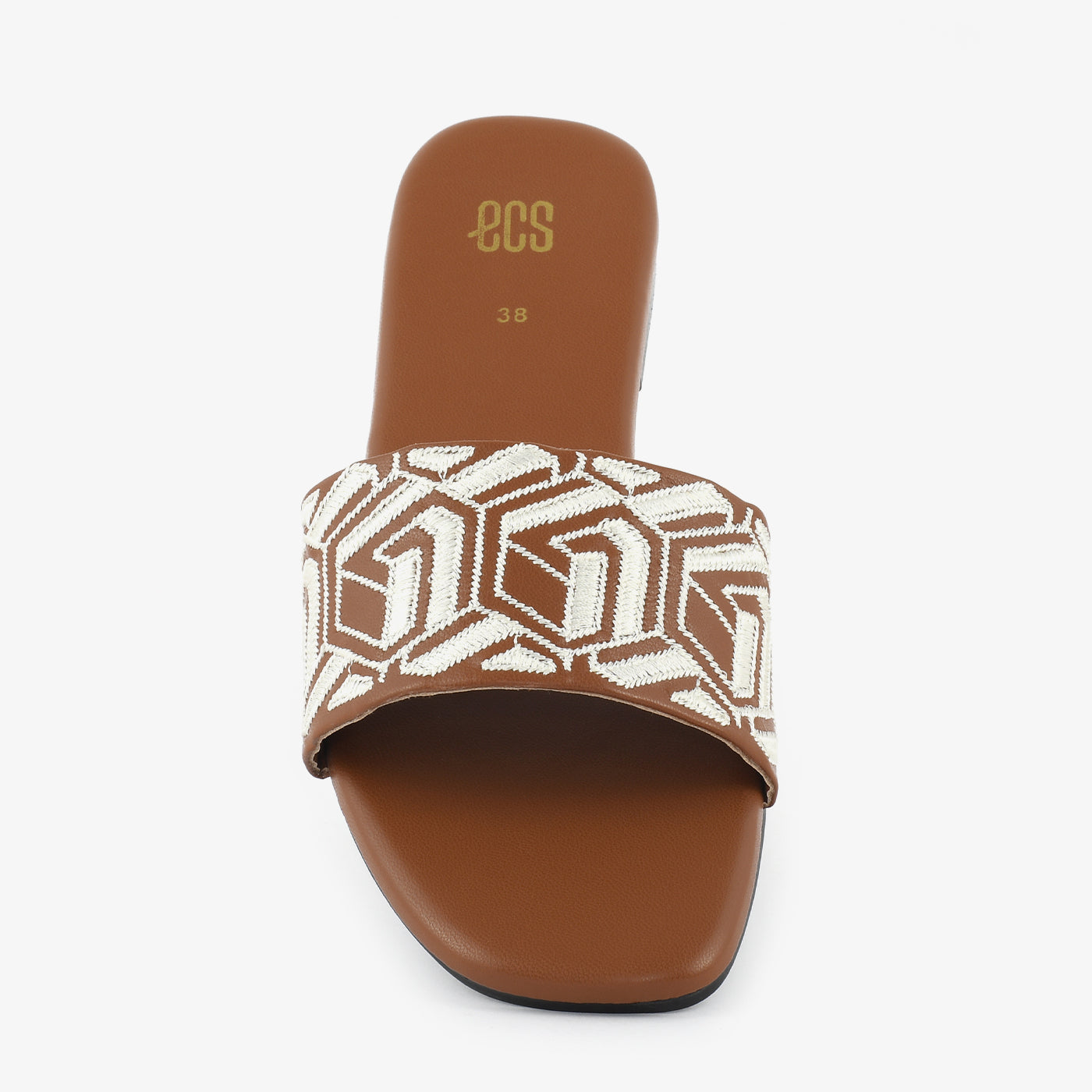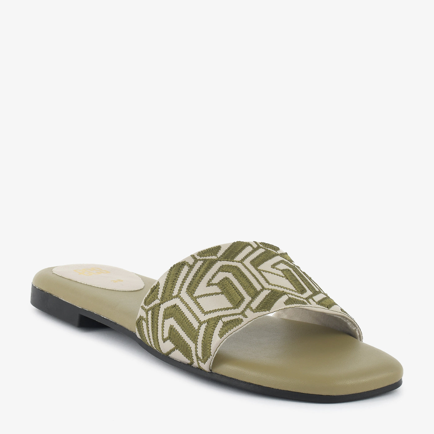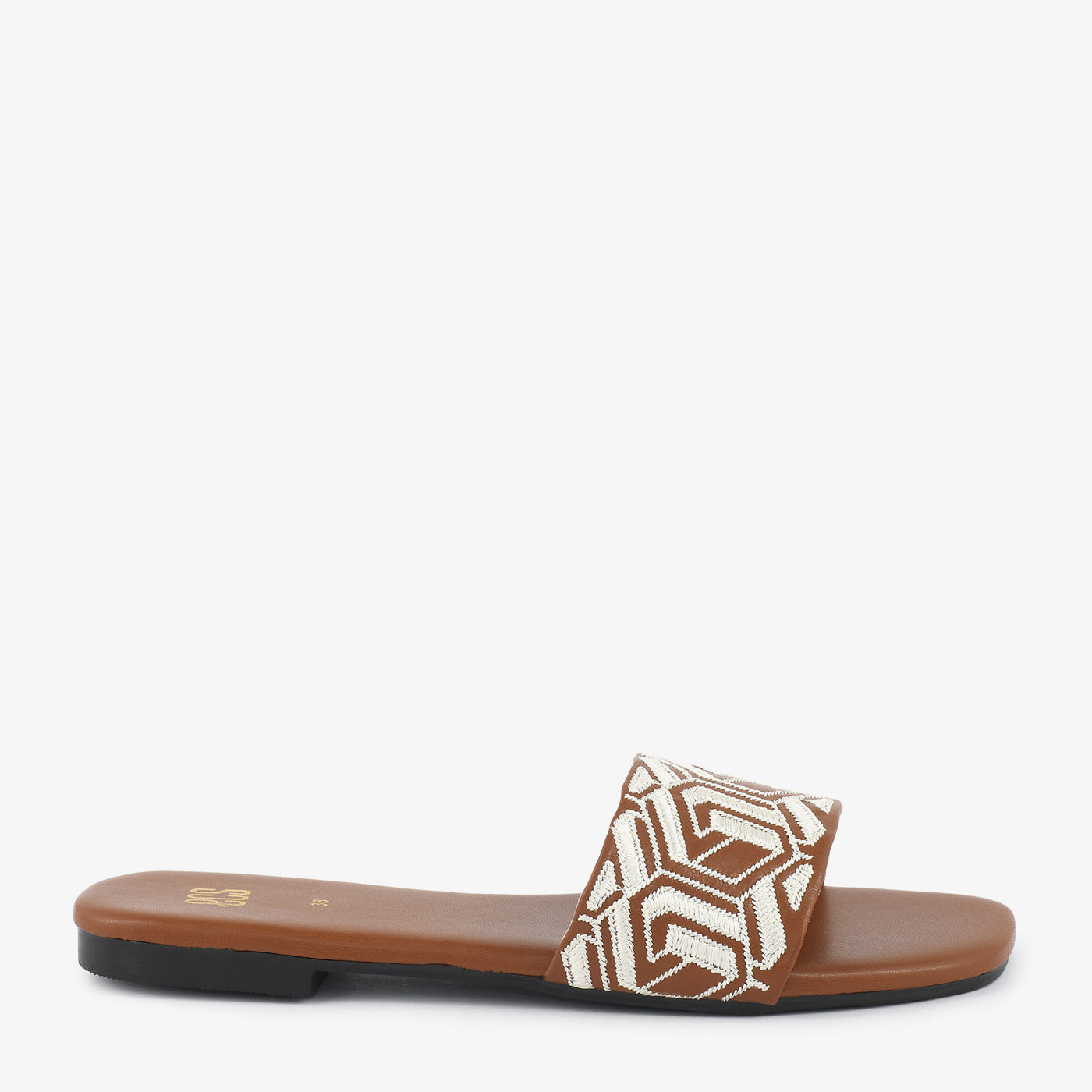 Step into comfortable style with these women's slide slippers. They feature a wide single strap across the foot, adorned with an intricate, geometric pattern. These flat, slip-on slippers offer an effortless blend of everyday comfort and distinctive design.