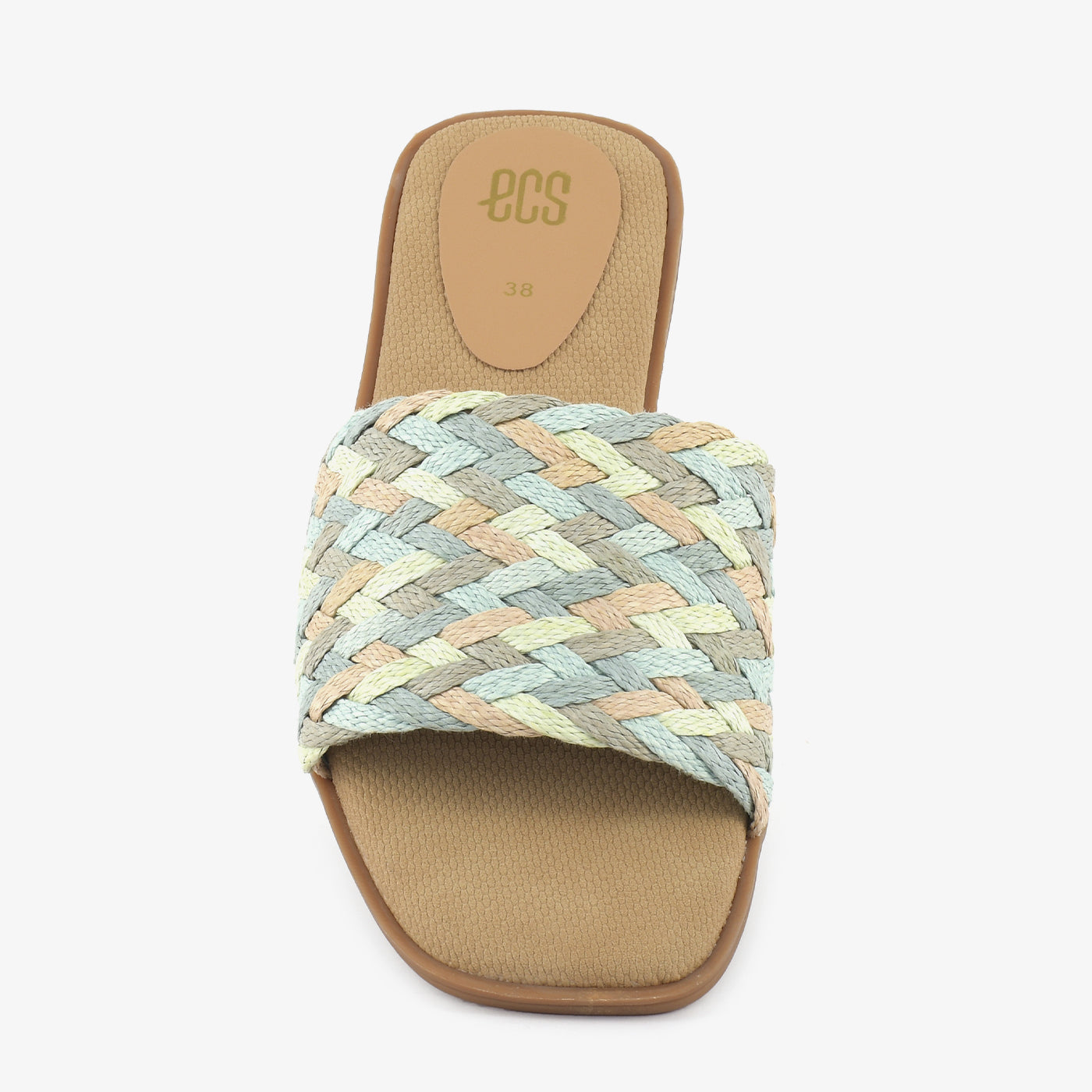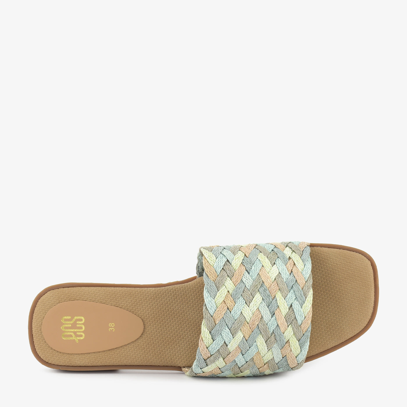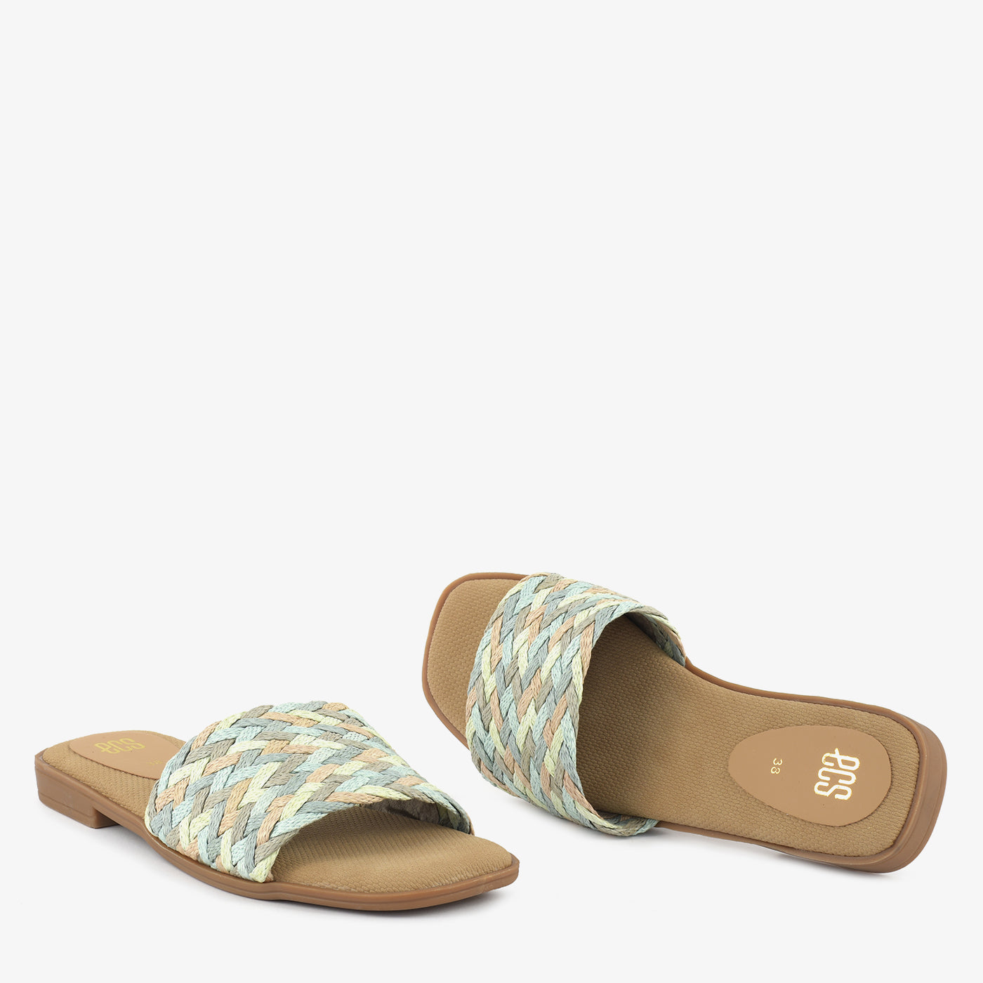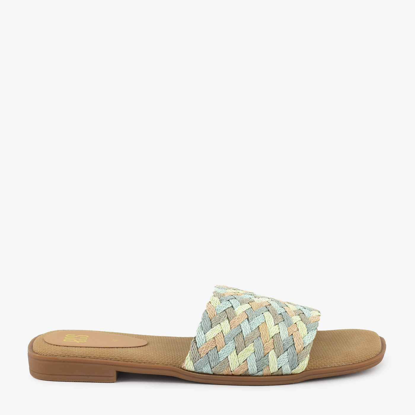 Step into relaxed style with the "Coastal Weave" slippers. These stylish multi-tone slippers feature a comfortable flat design and a unique woven strap. Perfect for adding a touch of breezy charm to your everyday look.