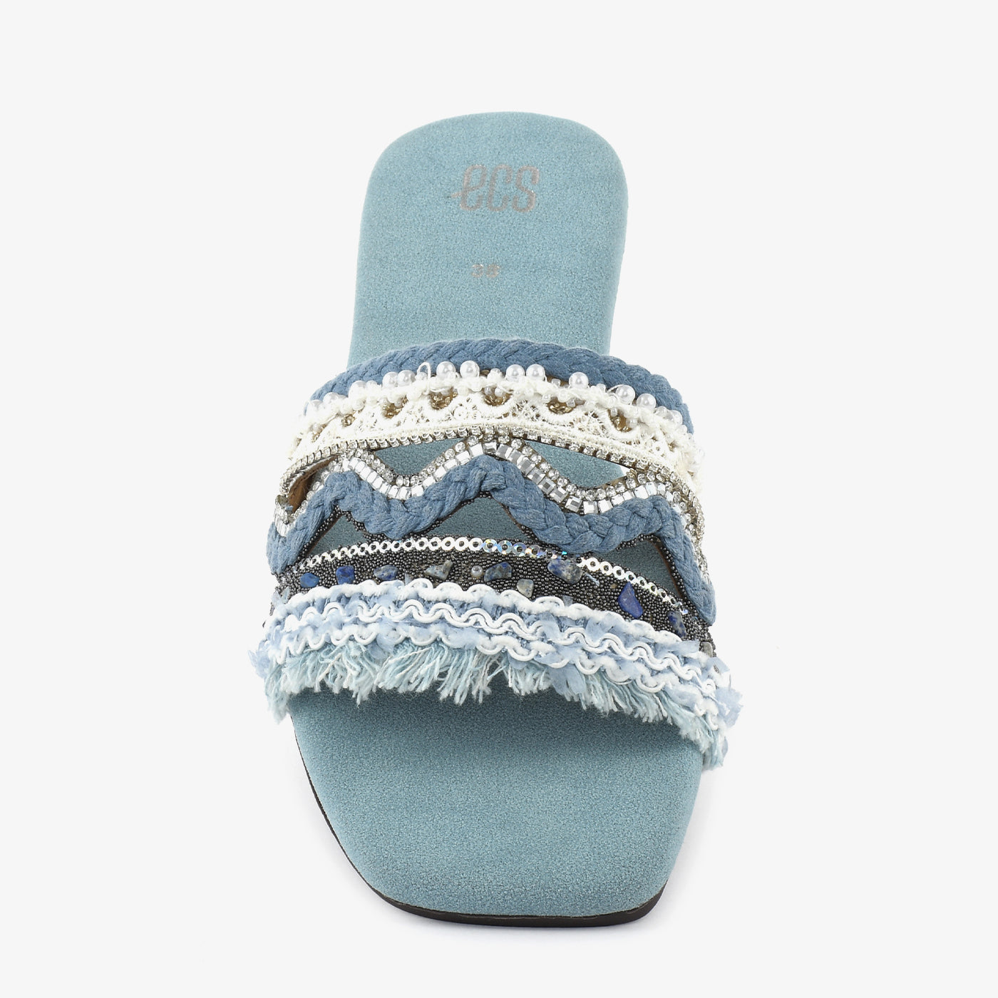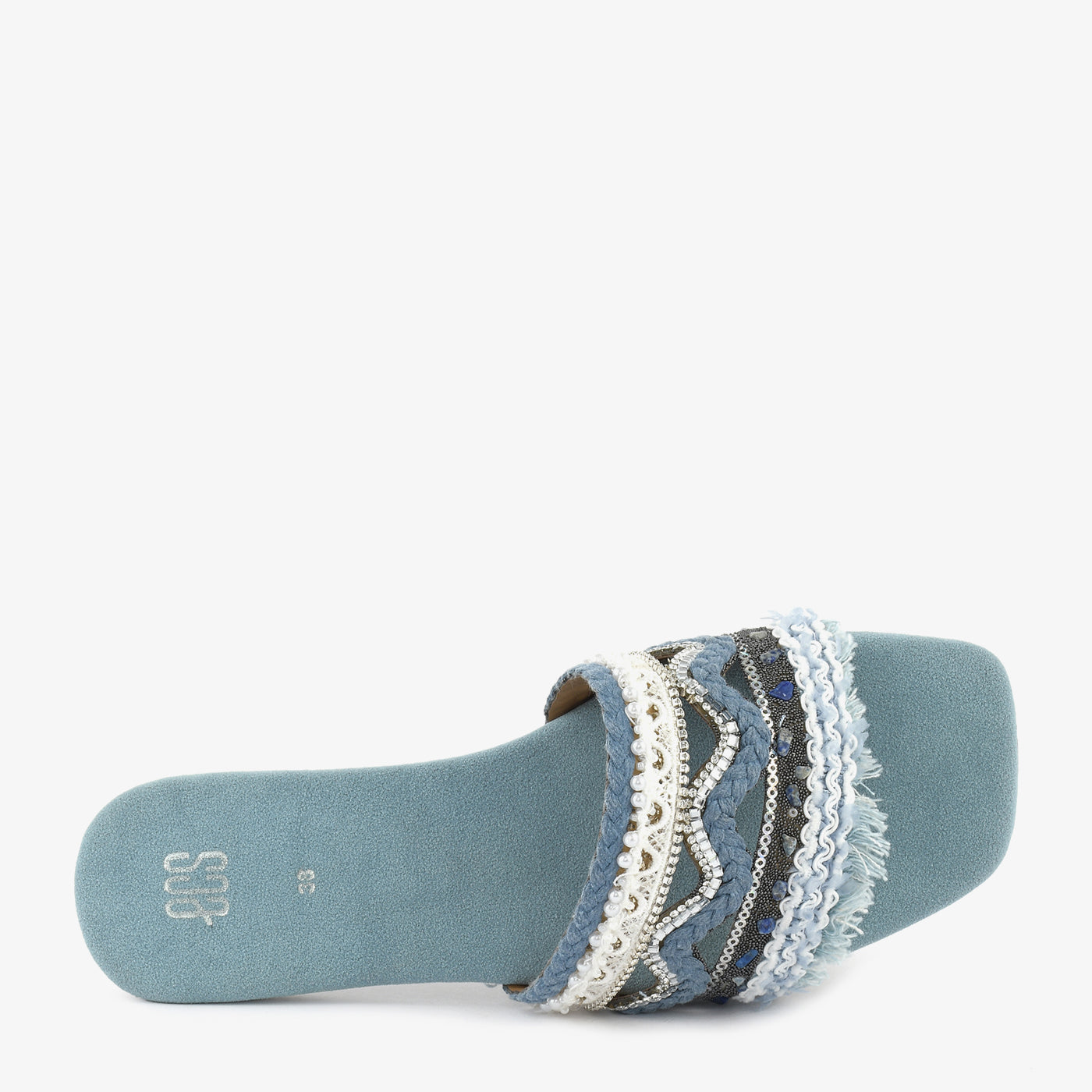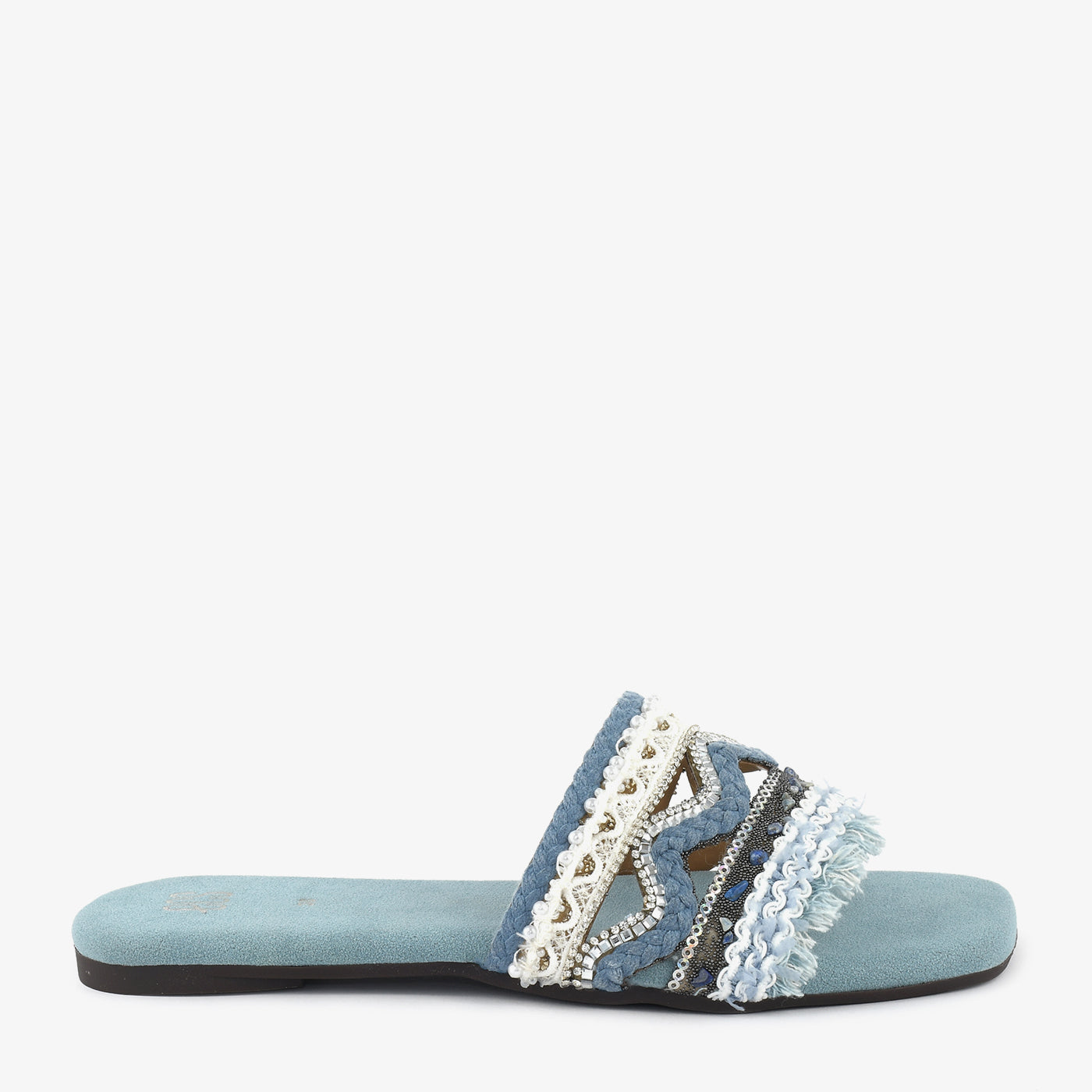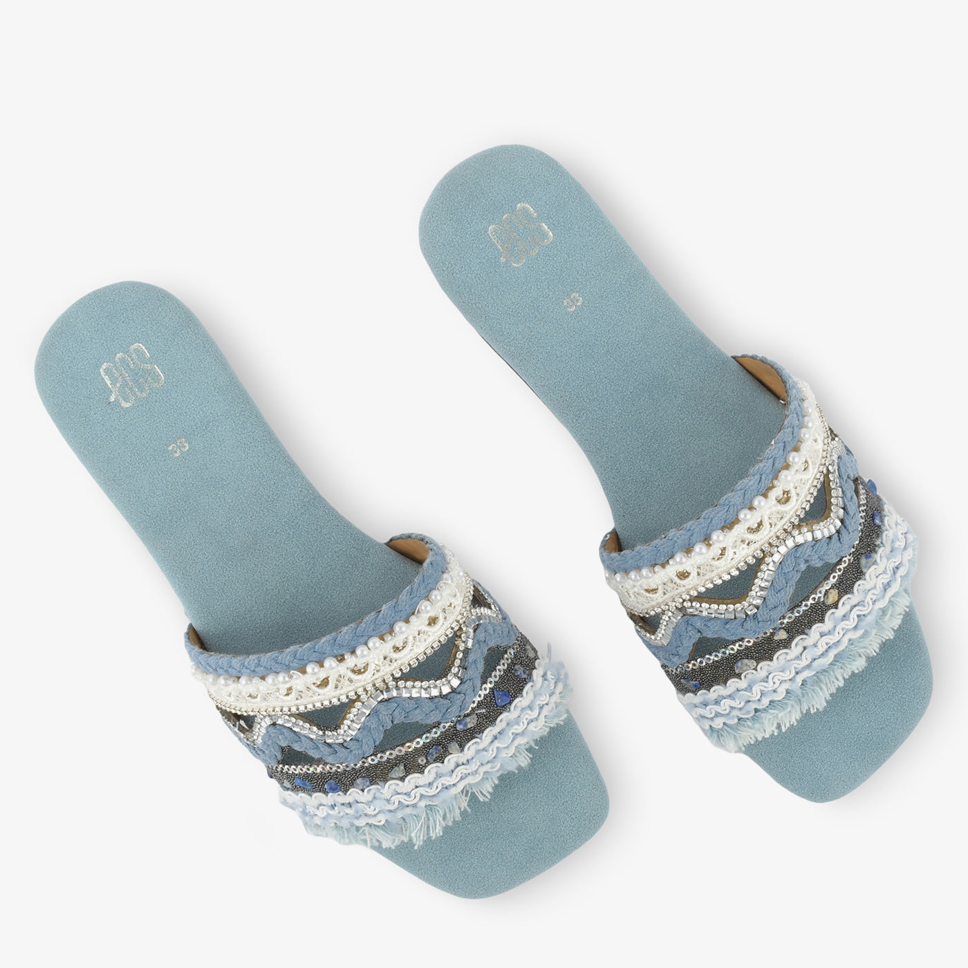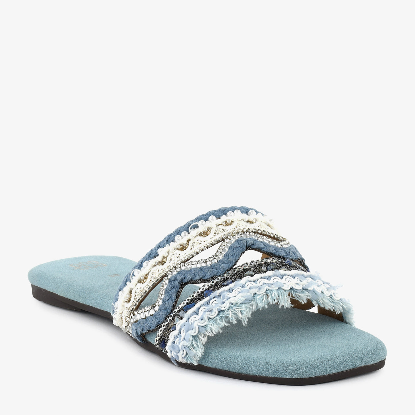 Step into effortless style with the "Azure Dream" slippers. These comfortable and stylish blue slippers feature a flat design and eye-catching embellishments. Perfect for adding a relaxed yet elegant touch to any outfit.