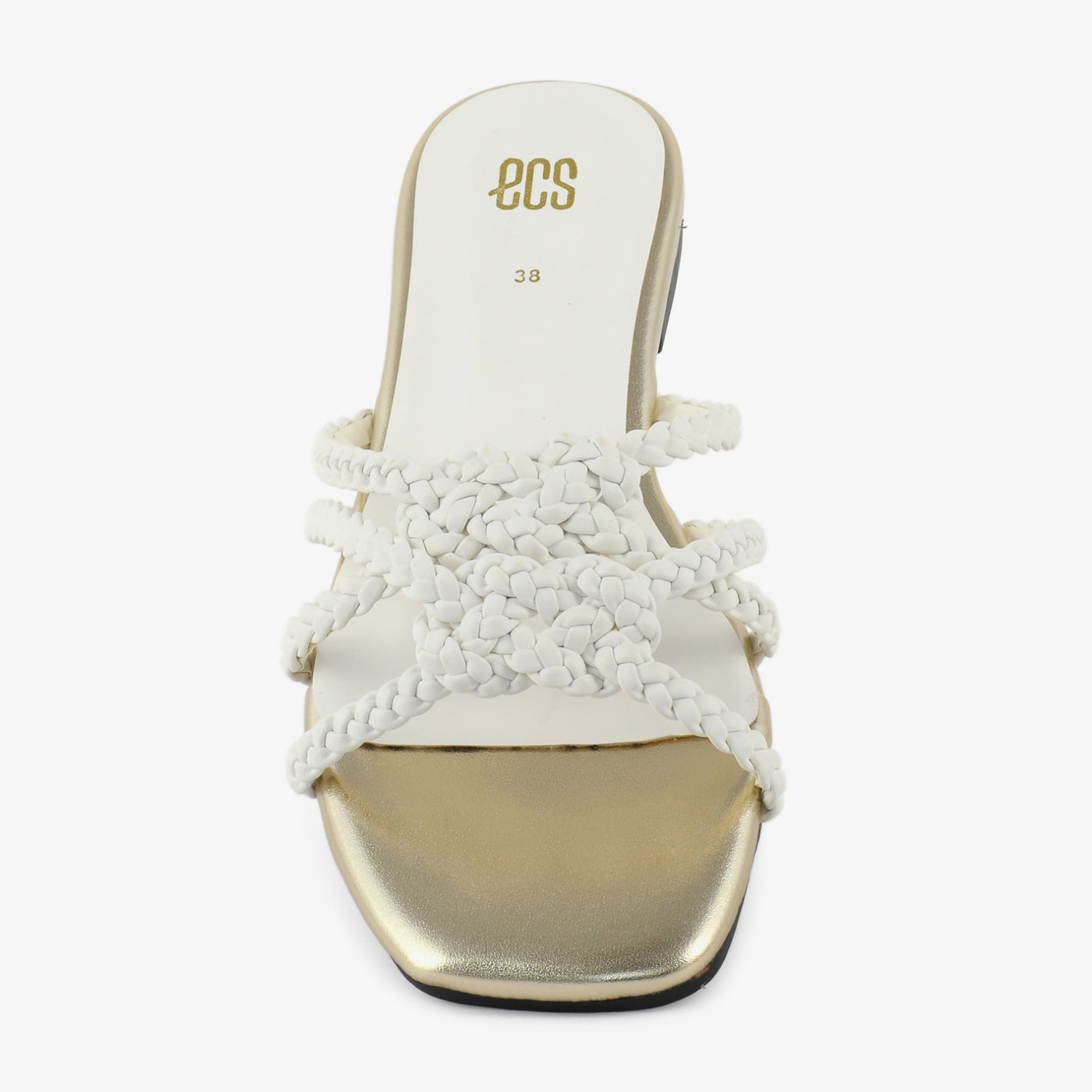 • Design: Multi-strap woven slipper with metallic-finish base