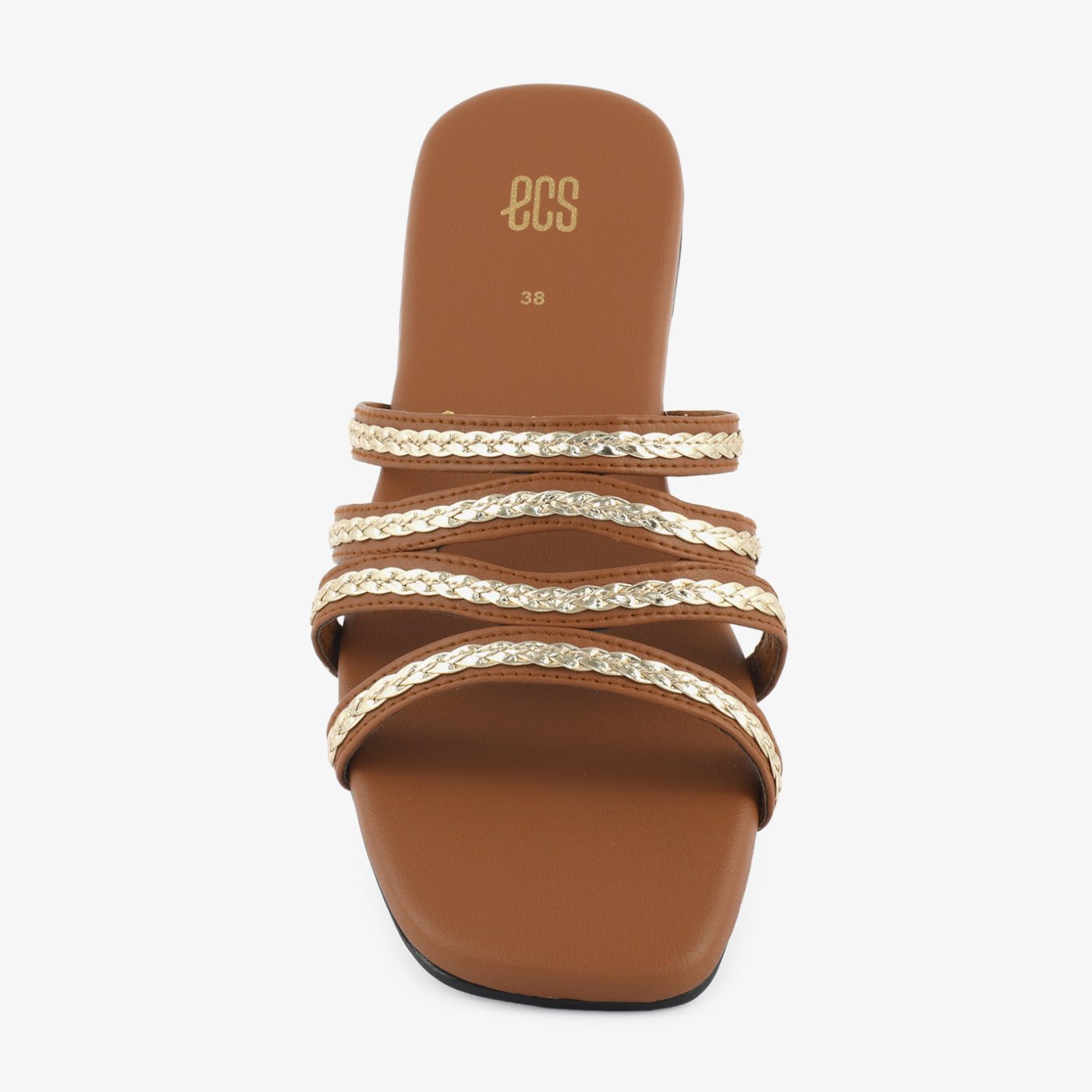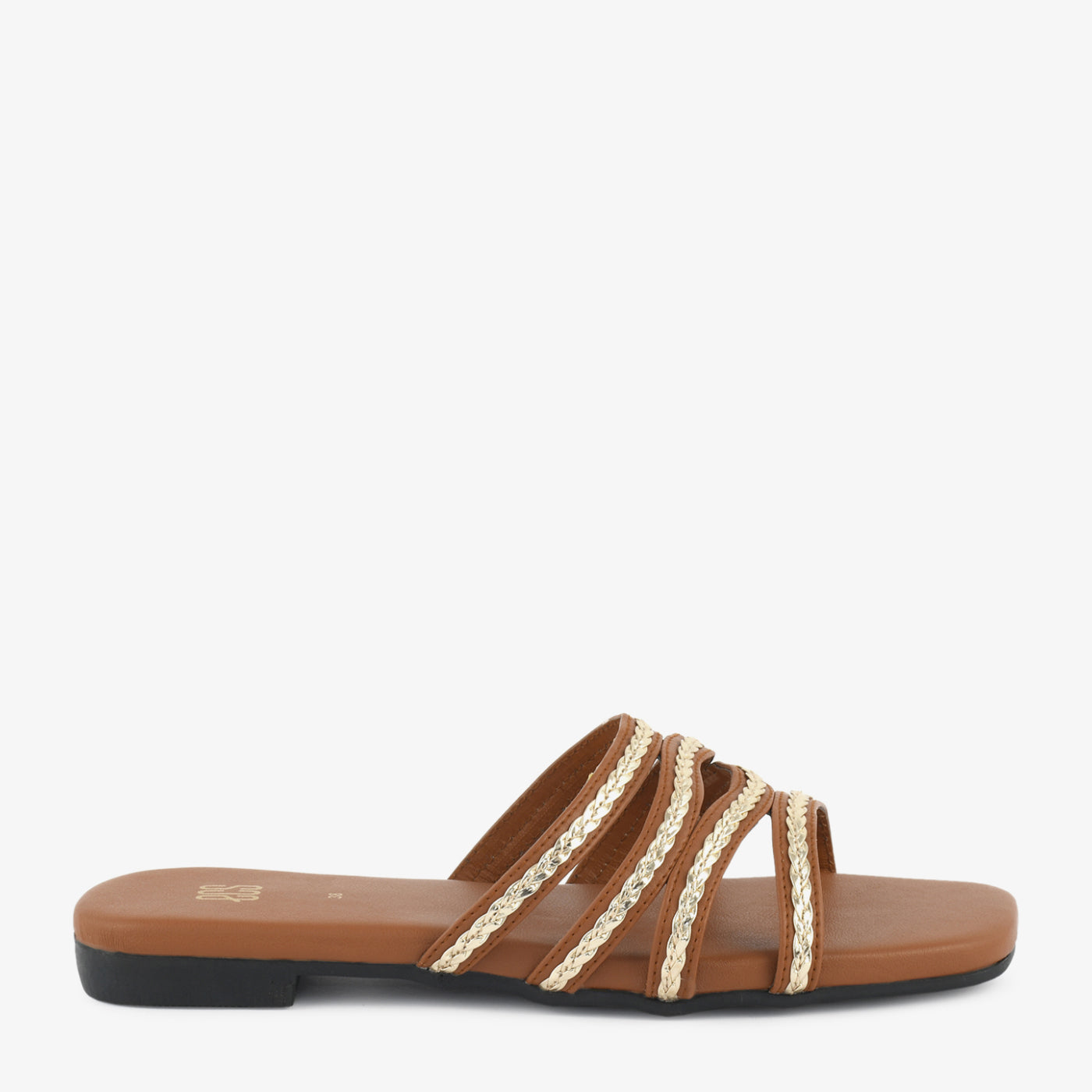 Designed for everyday comfort with a refined look, this women’s slipper features a stylish multi-strap design that adds a neat and modern touch to daily outfits. The upper straps are detailed with woven metallic accents that create a subtle textured appearance while keeping the design simple and elegant. Its open slip-on style allows easy and quick wear, making it perfect for daily routines. The cushioned footbed provides soft support for comfortable steps throughout the day, while the lightweight sole ensures smooth and stable movement. Ideal for casual outings or daily wear, this slipper blends comfort with a clean and stylish design.