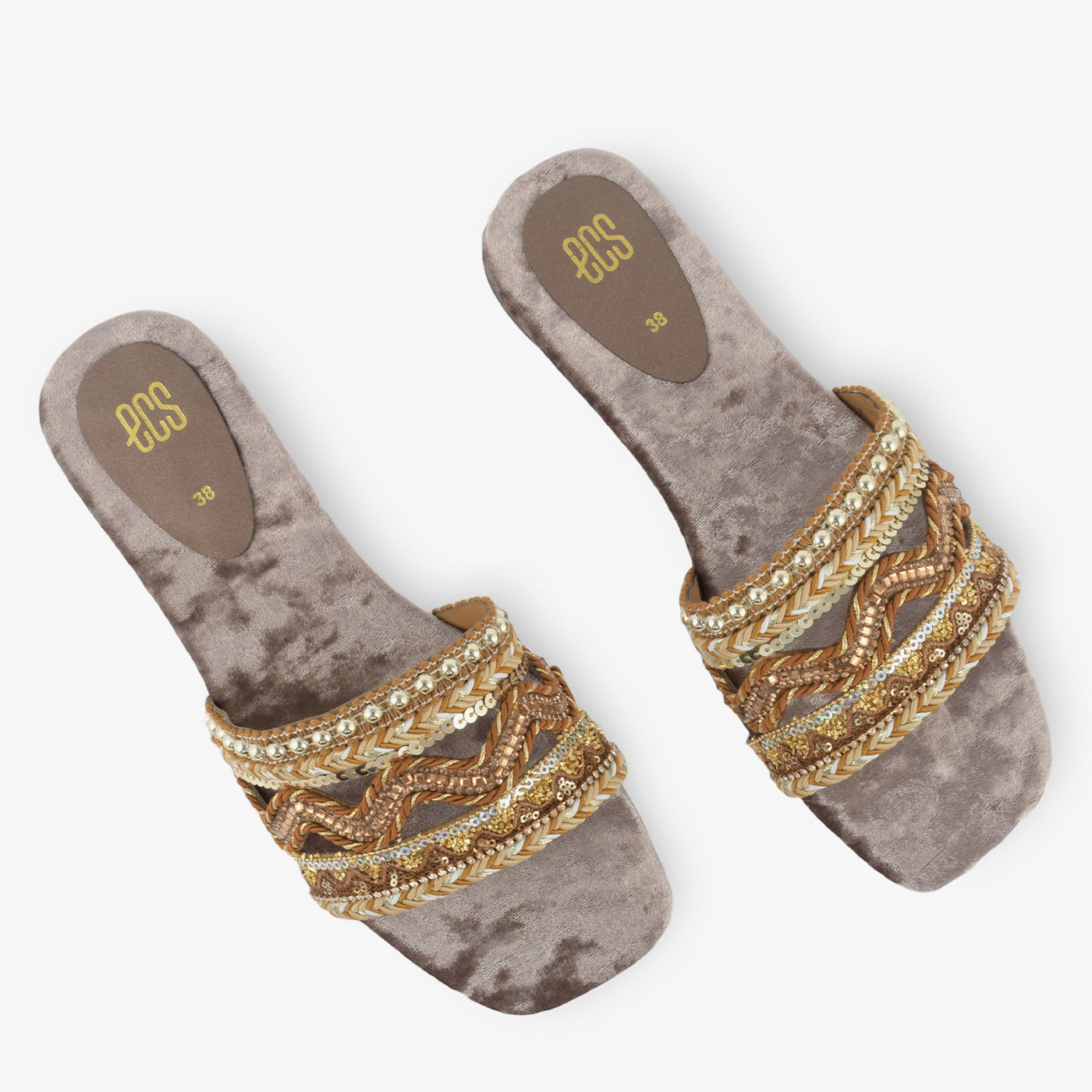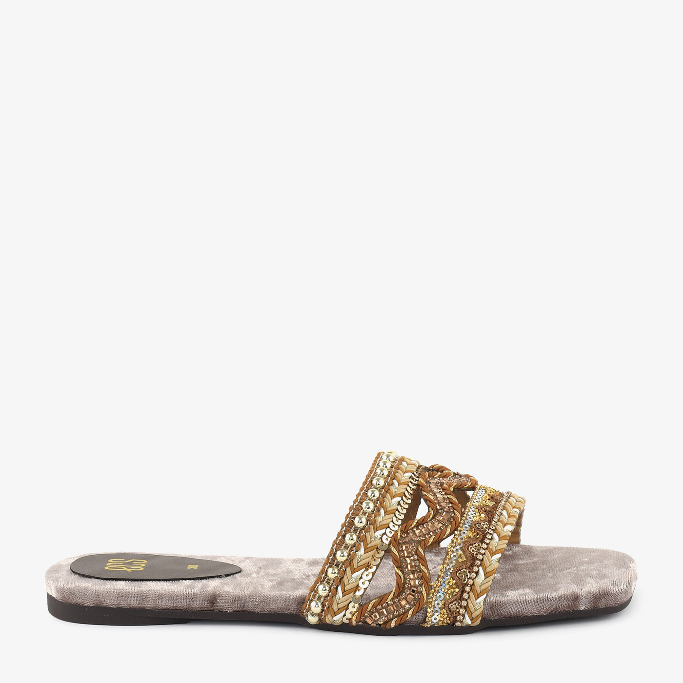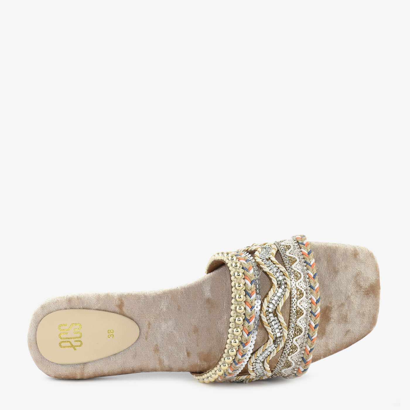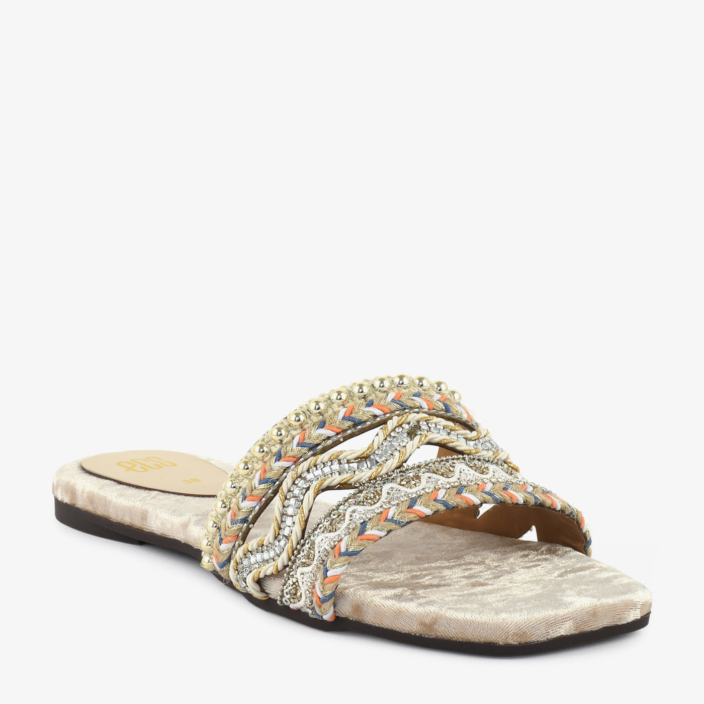 Step into vibrant style with these embellished flat slippers. The multiple straps feature a rich tapestry of woven textures, intricate beadwork, and shimmering accents, creating a bohemian-inspired look perfect for adding flair to your everyday style. The comfortable flat sole makes them ideal for warm weather.
