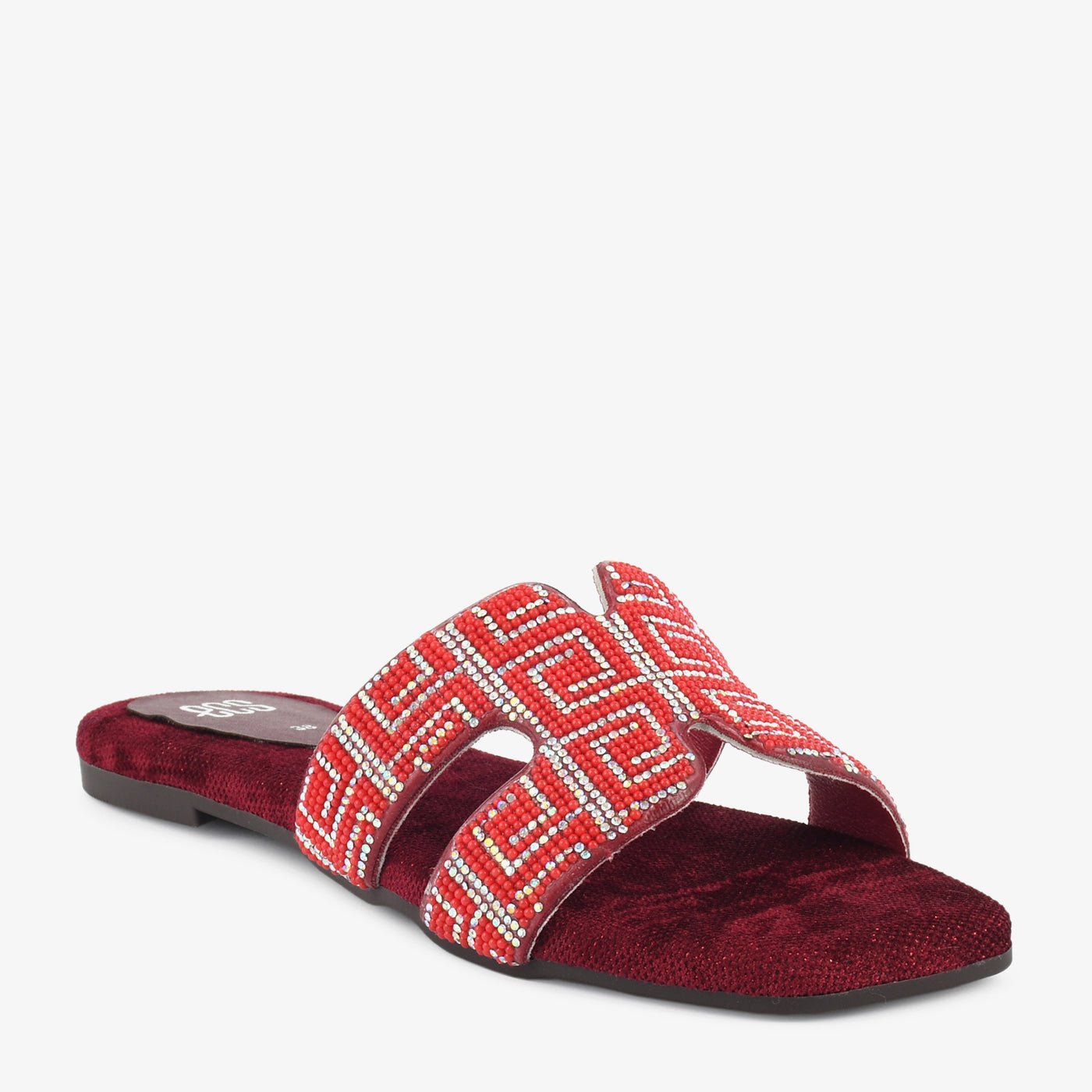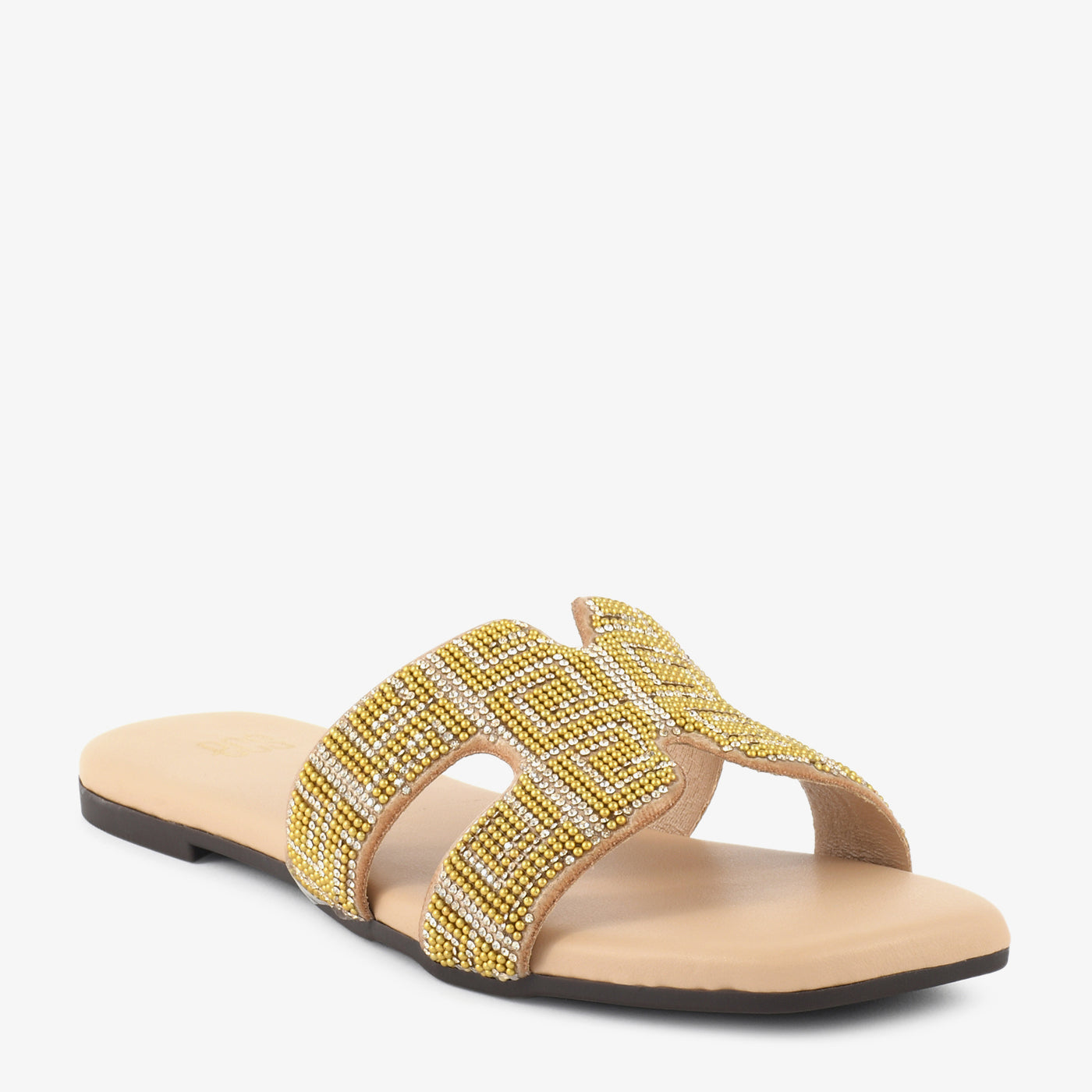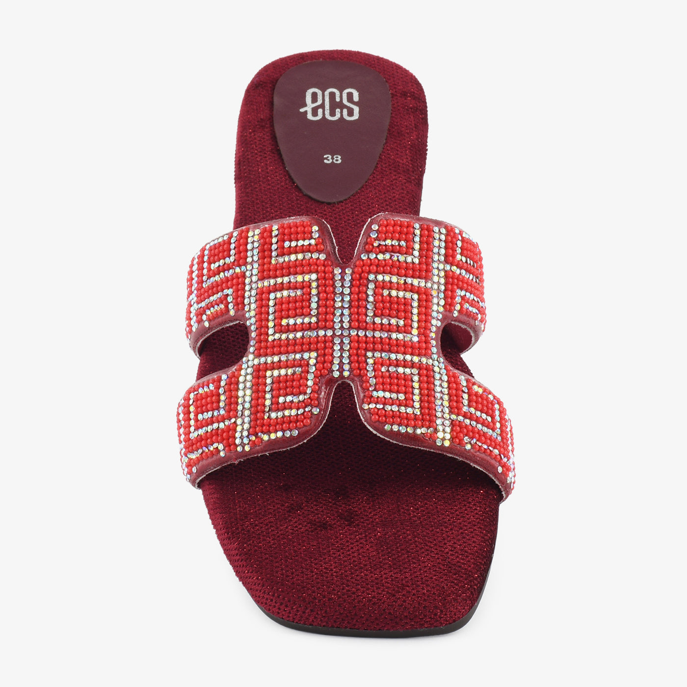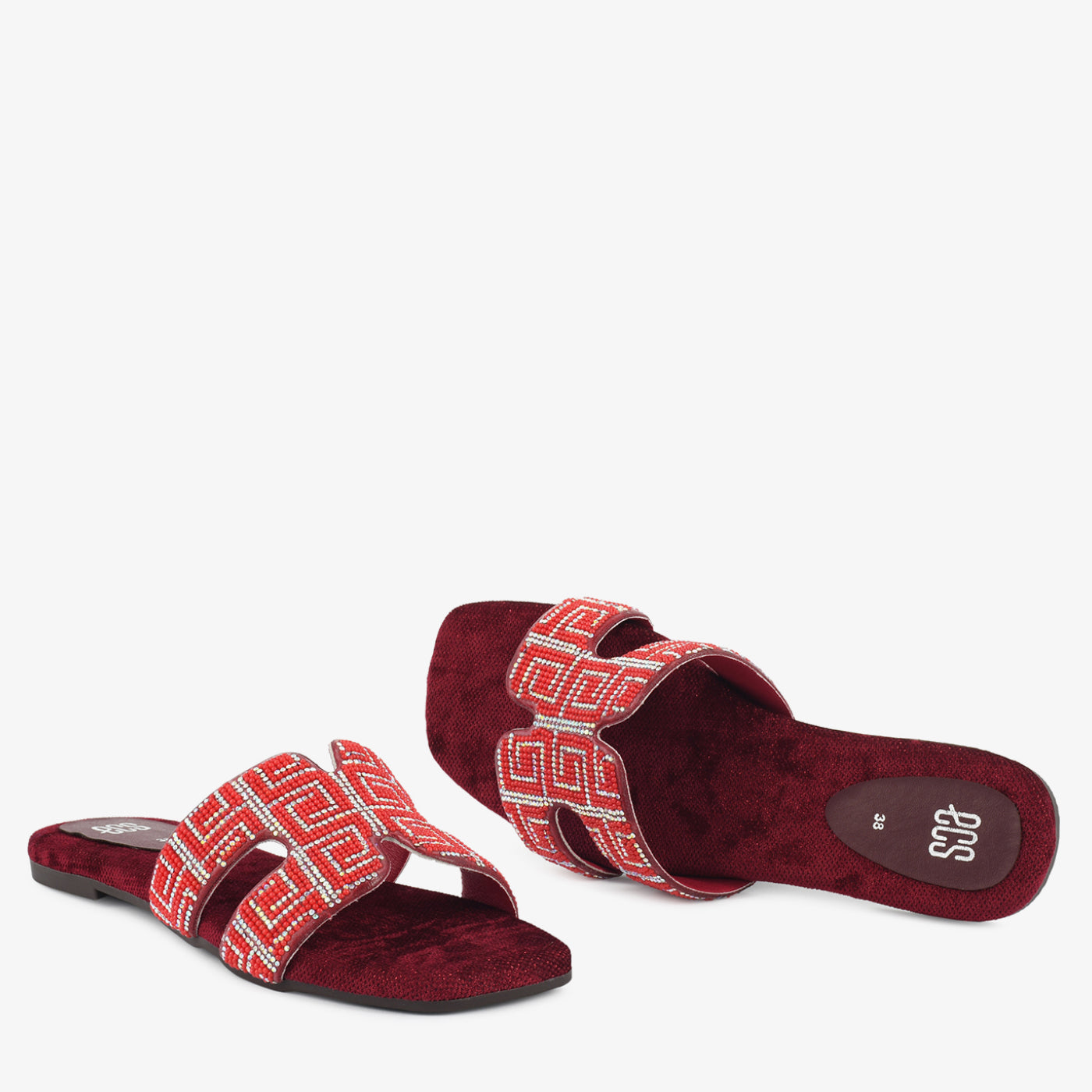 Designed with a bold and eye-catching look, this women’s slipper features a striking geometric pattern created with detailed bead embellishments on the upper strap. The decorative design adds a vibrant and stylish touch that stands out while keeping the overall structure sleek and comfortable. Its slip-on style makes it easy to wear, making it perfect for everyday outings or casual gatherings. The cushioned footbed provides soft support for comfortable steps throughout the day, while the lightweight sole ensures smooth and stable movement. Ideal for adding a fashionable accent to daily wear, this slipper blends comfort with a statement style.