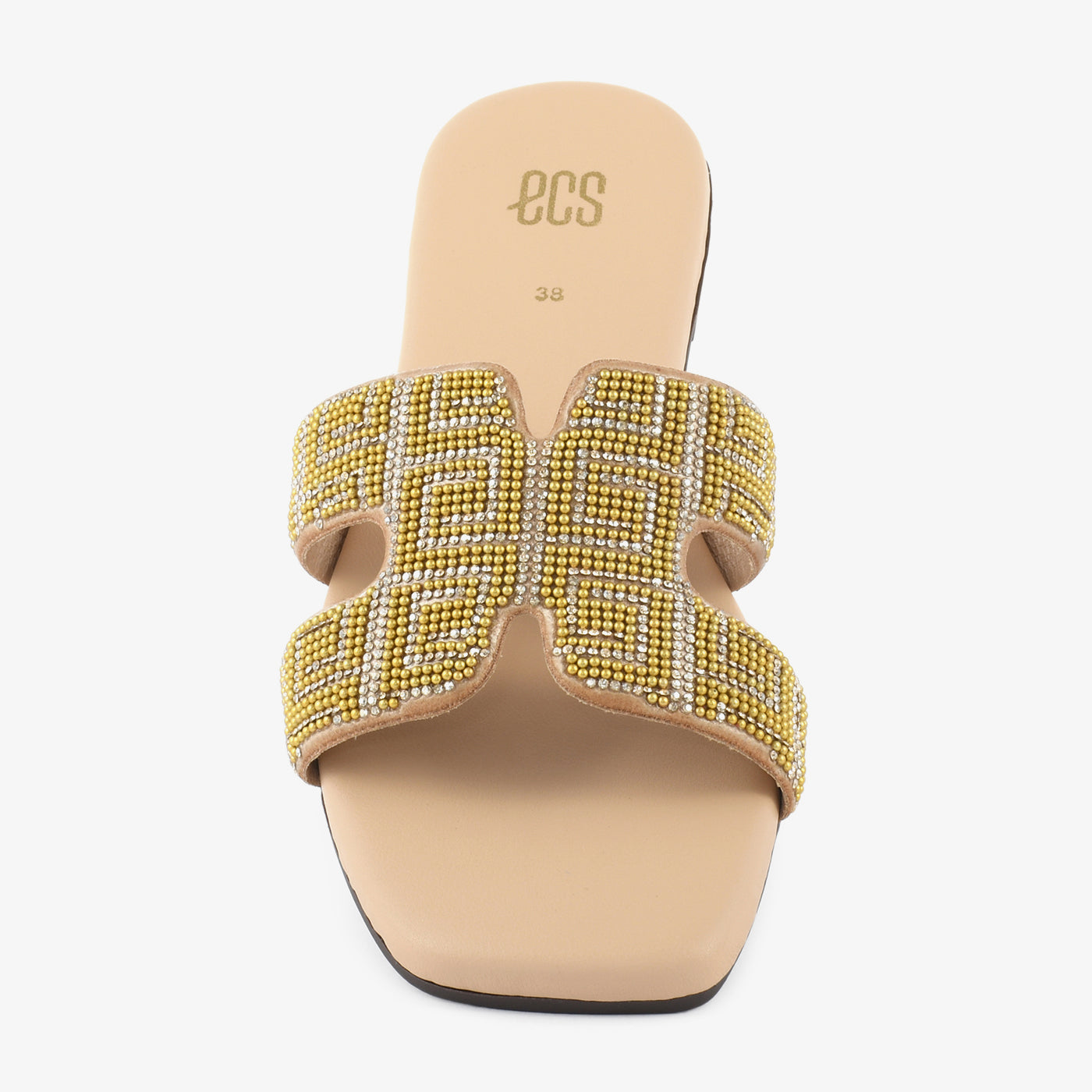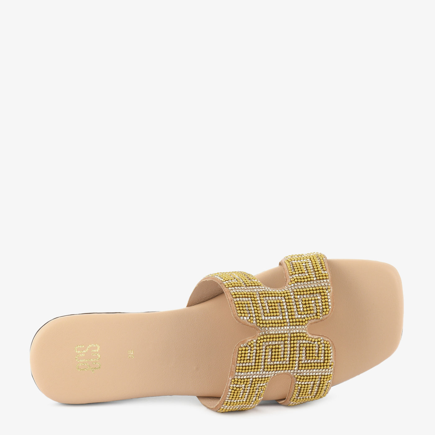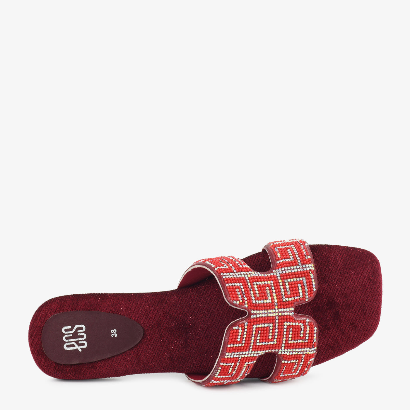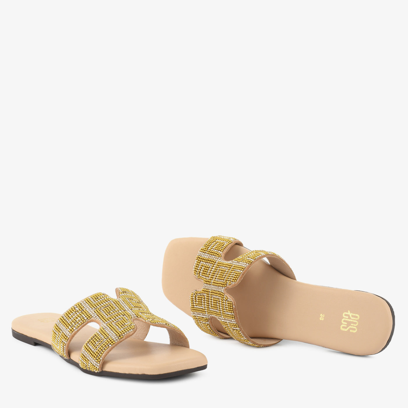 Designed with a bold and eye-catching look, this women’s slipper features a striking geometric pattern created with detailed bead embellishments on the upper strap. The decorative design adds a vibrant and stylish touch that stands out while keeping the overall structure sleek and comfortable. Its slip-on style makes it easy to wear, making it perfect for everyday outings or casual gatherings. The cushioned footbed provides soft support for comfortable steps throughout the day, while the lightweight sole ensures smooth and stable movement. Ideal for adding a fashionable accent to daily wear, this slipper blends comfort with a statement style.