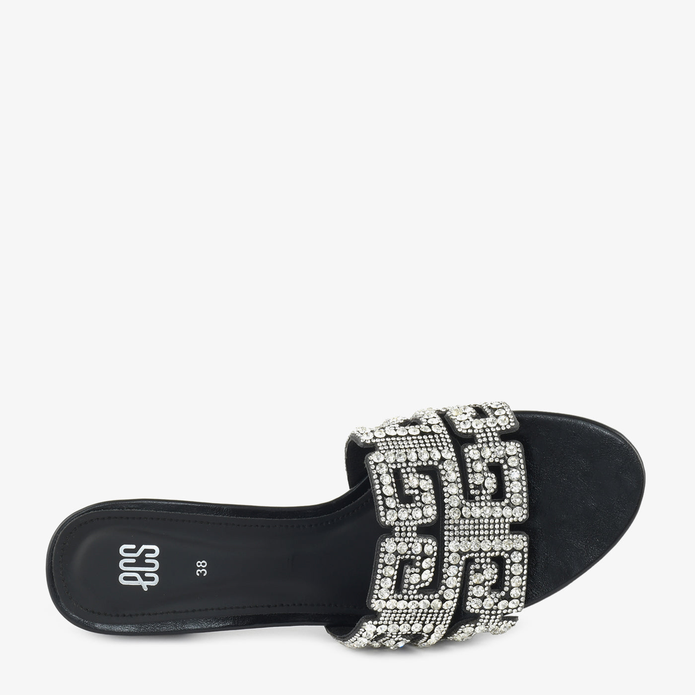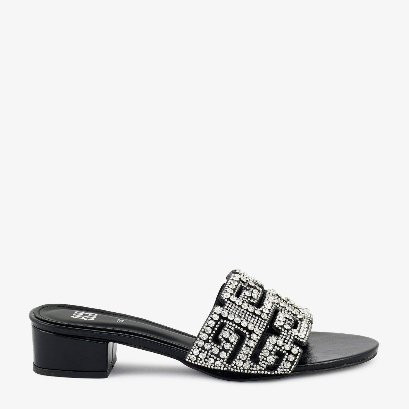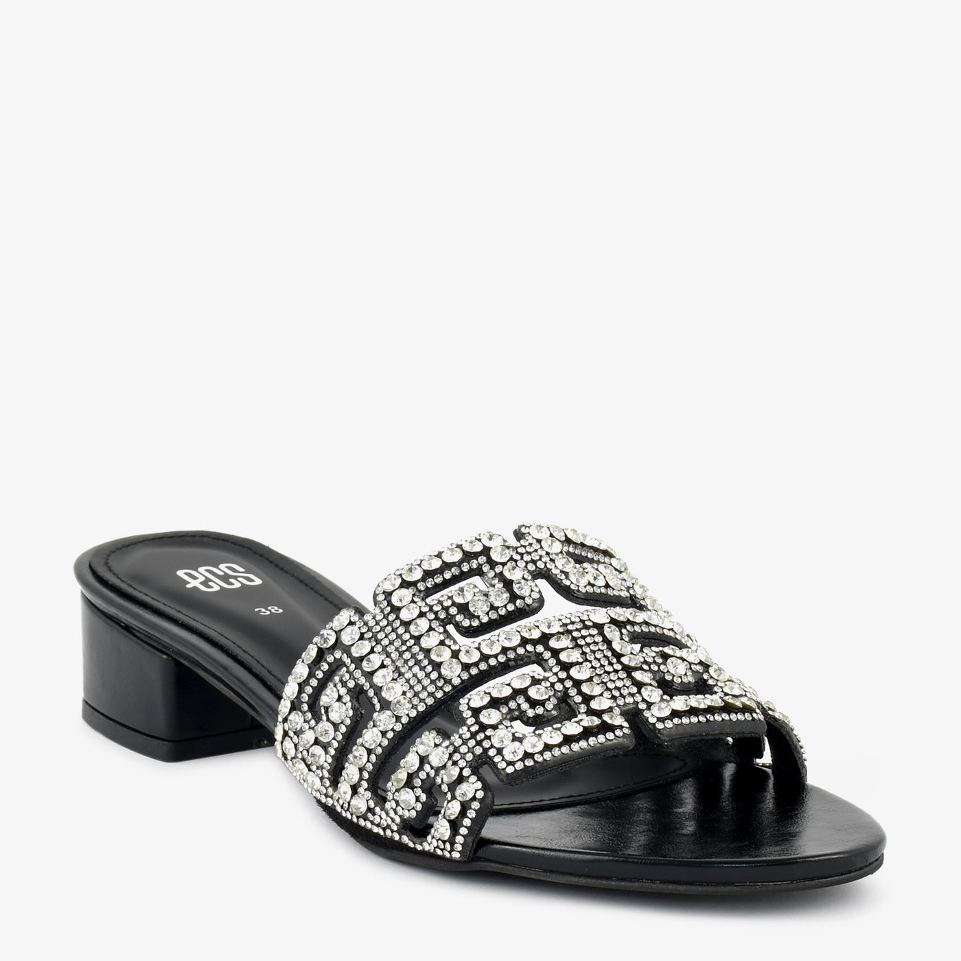 Step into dazzling style with these embellished block heel slipper. The wide strap features an intricate, maze-like pattern of shimmering stones, creating a luxurious and eye-catching look perfect for special occasions. The comfortable block heel provides stability and elegance.