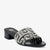Step into dazzling style with these embellished block heel slipper. The wide strap features an intricate, maze-like pattern of shimmering stones, creating a luxurious and eye-catching look perfect for...