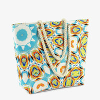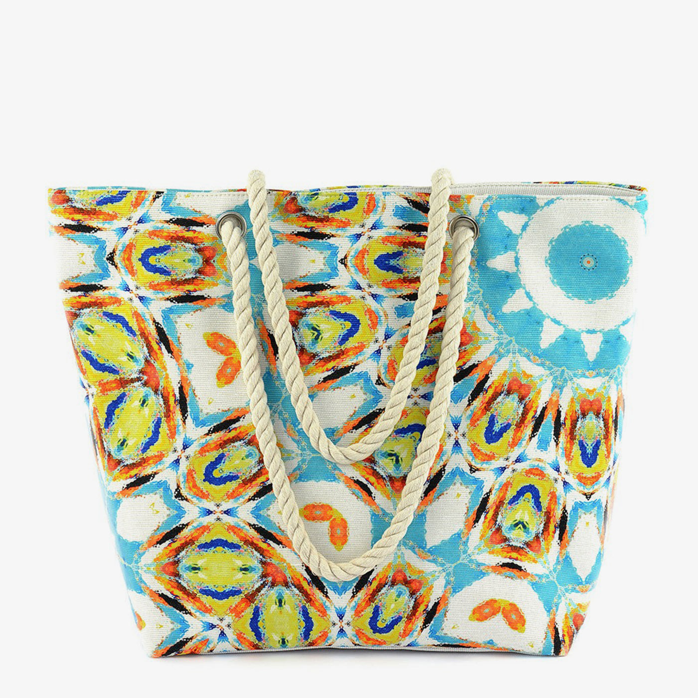 This vibrant beach bag is your perfect summer companion, blending artistic flair with practical design. Its spacious interior and durable construction make it ideal for carrying all your essentials, from sunscreen to a good book. The eye-catching geometric pattern in shades of blue, orange, and yellow evokes a sunny, carefree vibe, ensuring you'll stand out whether you're by the sea or strolling through town.