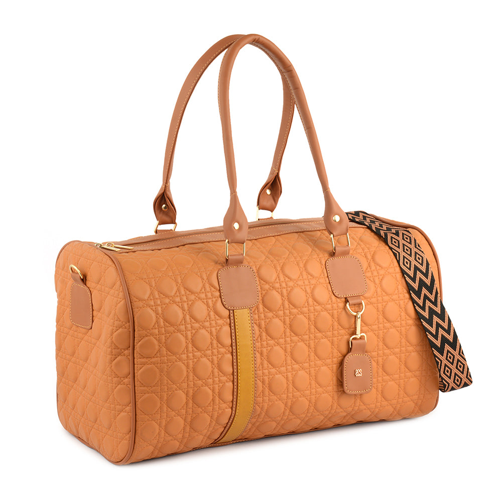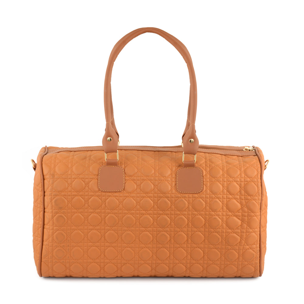 Introducing the "Quilted Jetsetter Duffle Bag," crafted from high-quality synthetic PU with a stylish matte finish. The textile lining complements its sophisticated design, while the exquisite quilting adds a touch of luxury. With a secure zip fastening, this bag ensures your belongings are safe. Measuring 25 inches in width, 9 inches in depth, and 14 inches in height, it provides ample space for all your travel essentials. The convenient handles offer easy carrying. Featuring a single, spacious compartment, this bag combines functionality with chic aesthetics, making it the perfect companion for your travels.