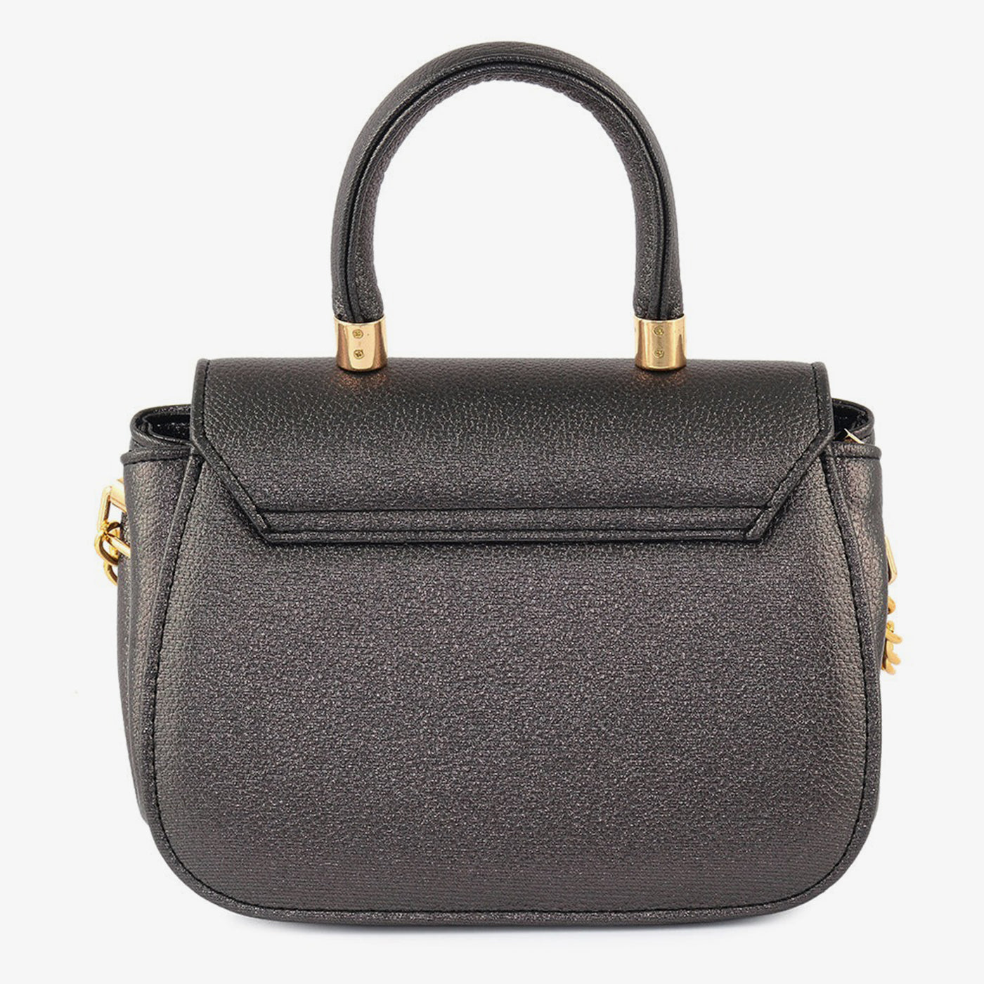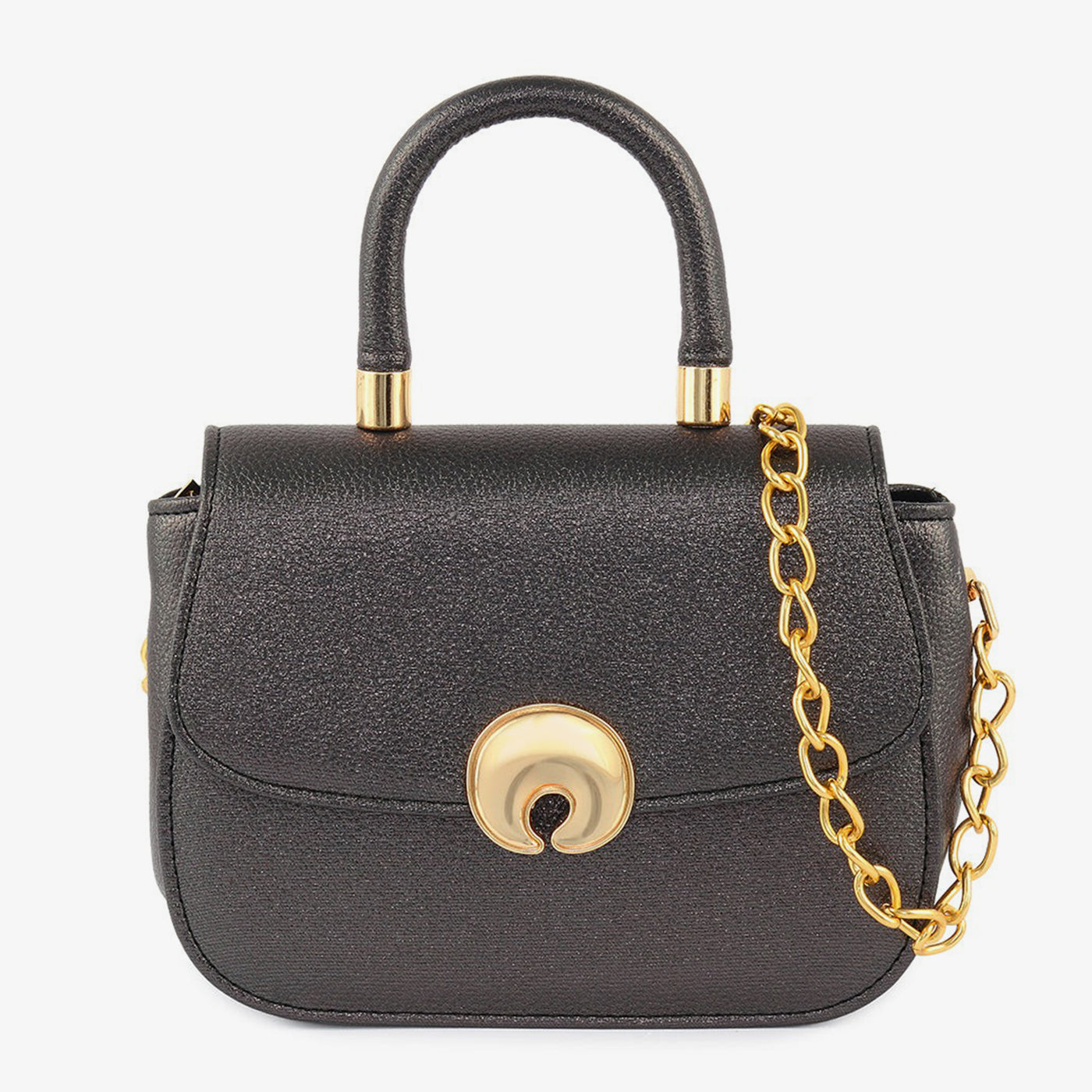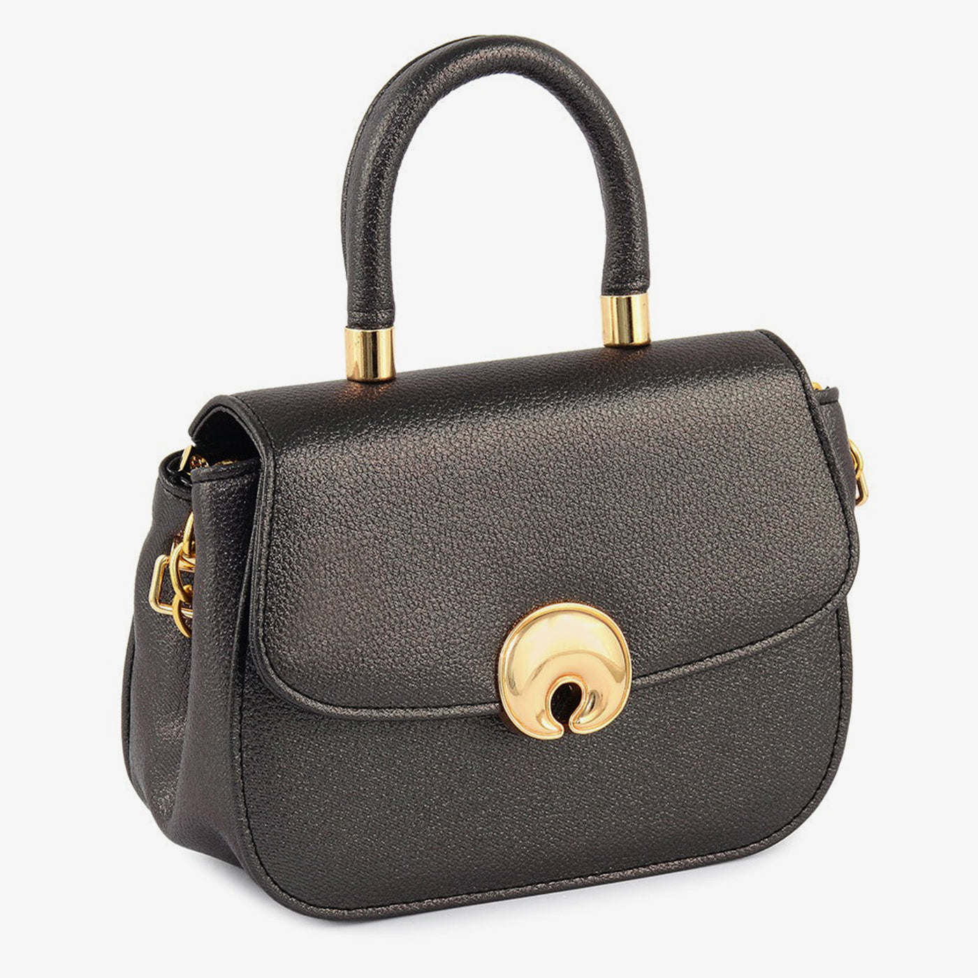 Embrace celestial chic with the Luna Mini Top Handle bag. This structured, compact bag in a textured black finish is accented with a unique crescent moon closure, adding a touch of whimsical elegance. The detachable gold chain offers versatility, allowing you to carry it by hand or wear it as a crossbody.