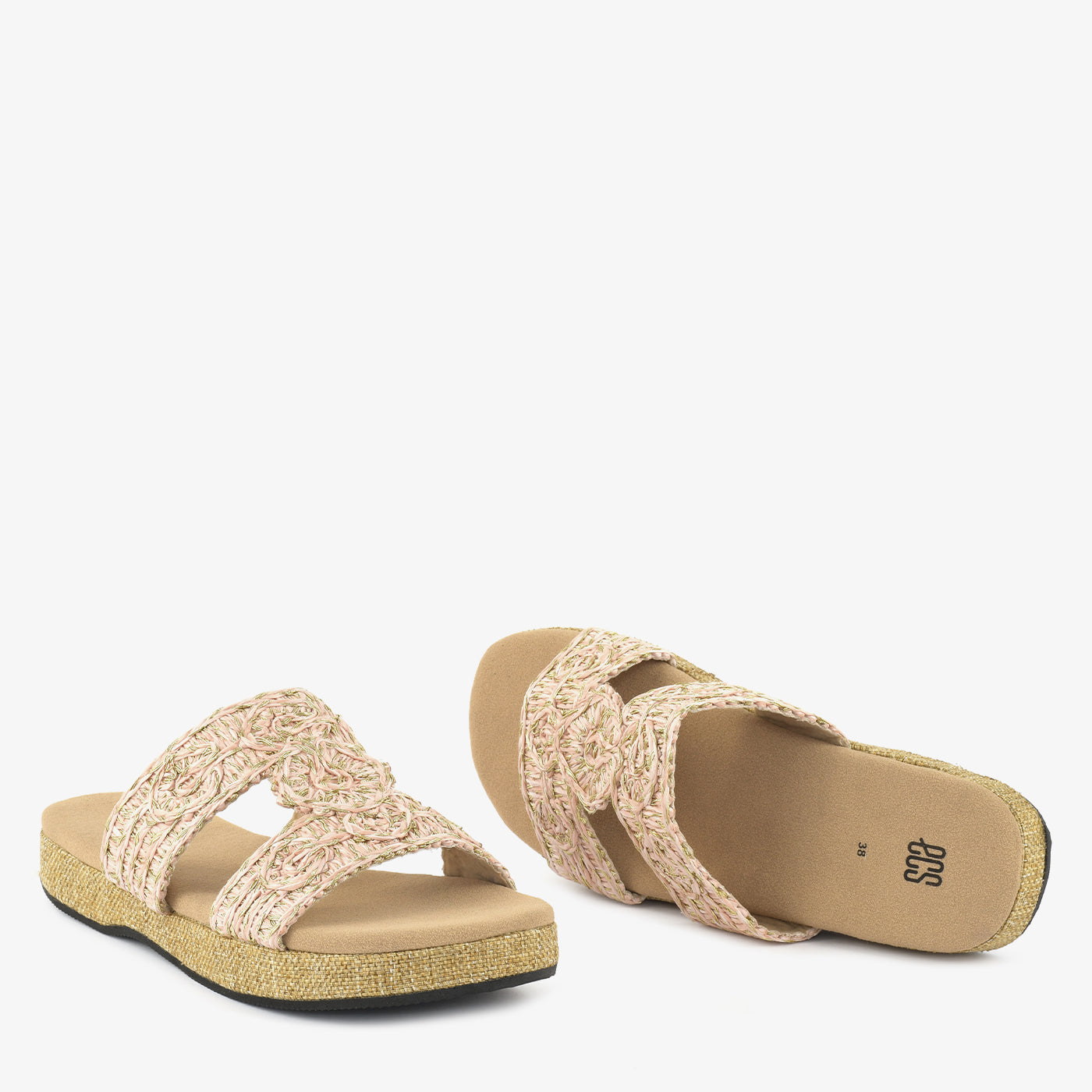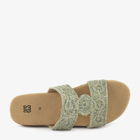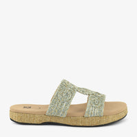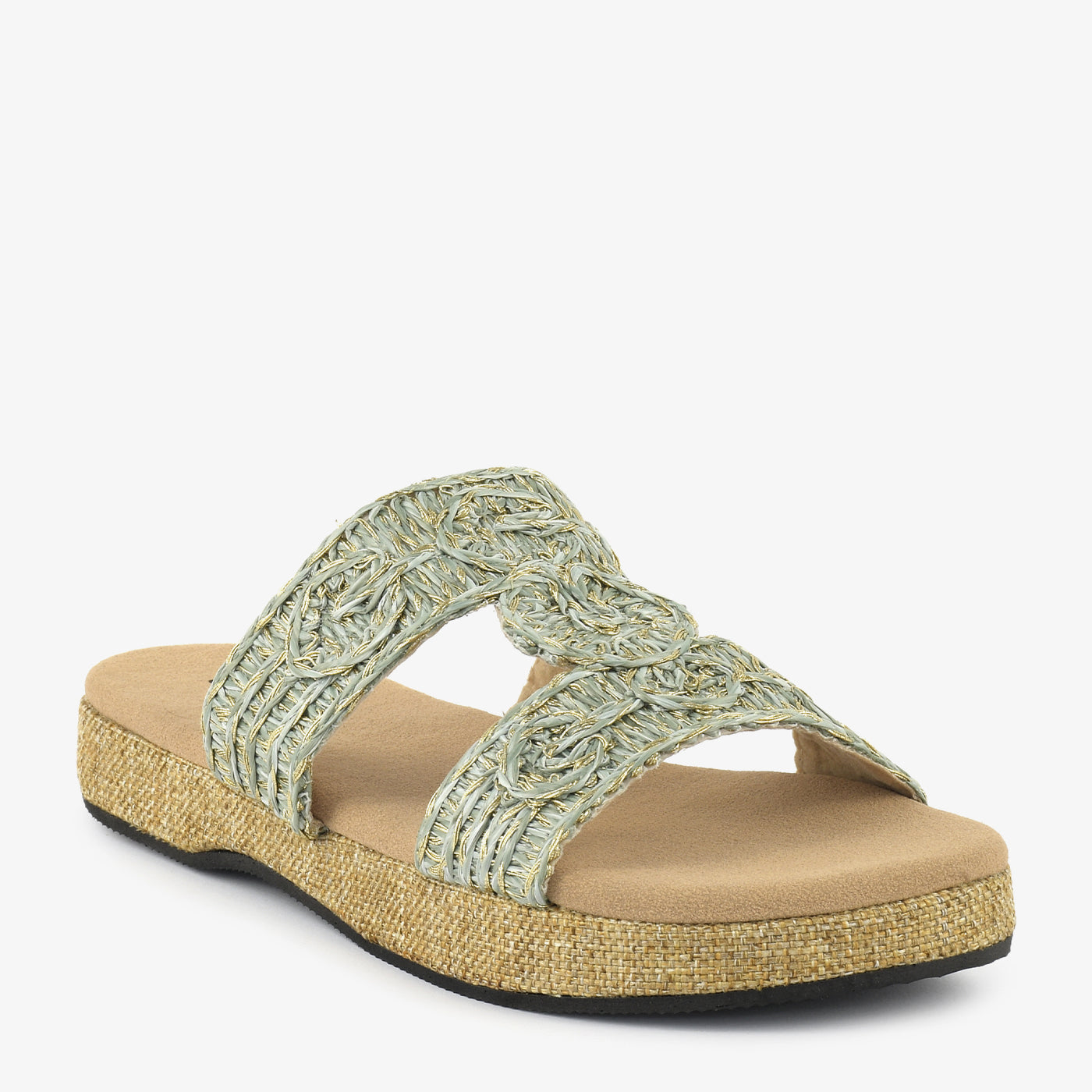 Step into relaxed elegance with the "Woven Serenity Platforms." These stylish light green slippers feature a unique woven design with subtle gold accents. Their comfortable low platform sole makes them perfect for strolling around on a warm afternoon.