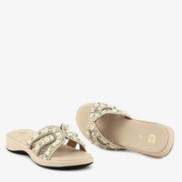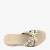 Step into delicate elegance with the "Ivory Pearl Cascade Platforms." These stylish off-white slippers feature a comfortable low wedge heel and multiple straps beautifully adorned with pearls and shimmering crystals. Perfect for adding a touch of refined glamour to any occasion.