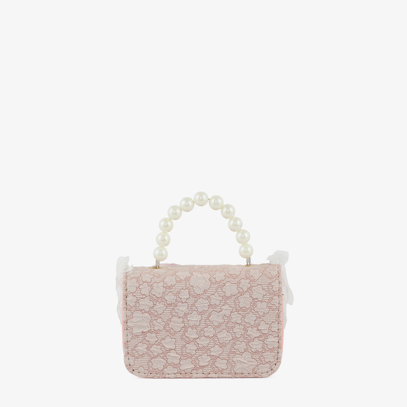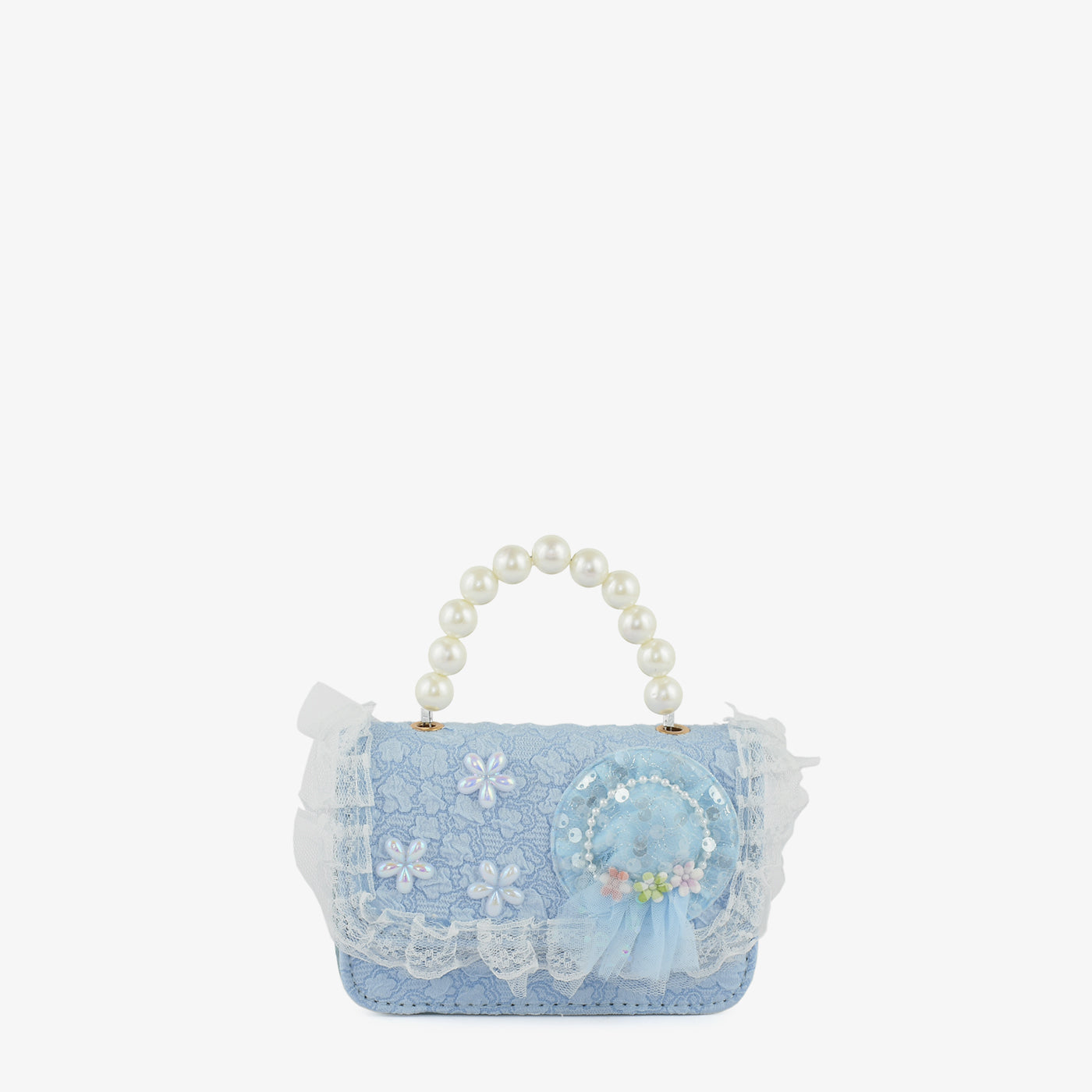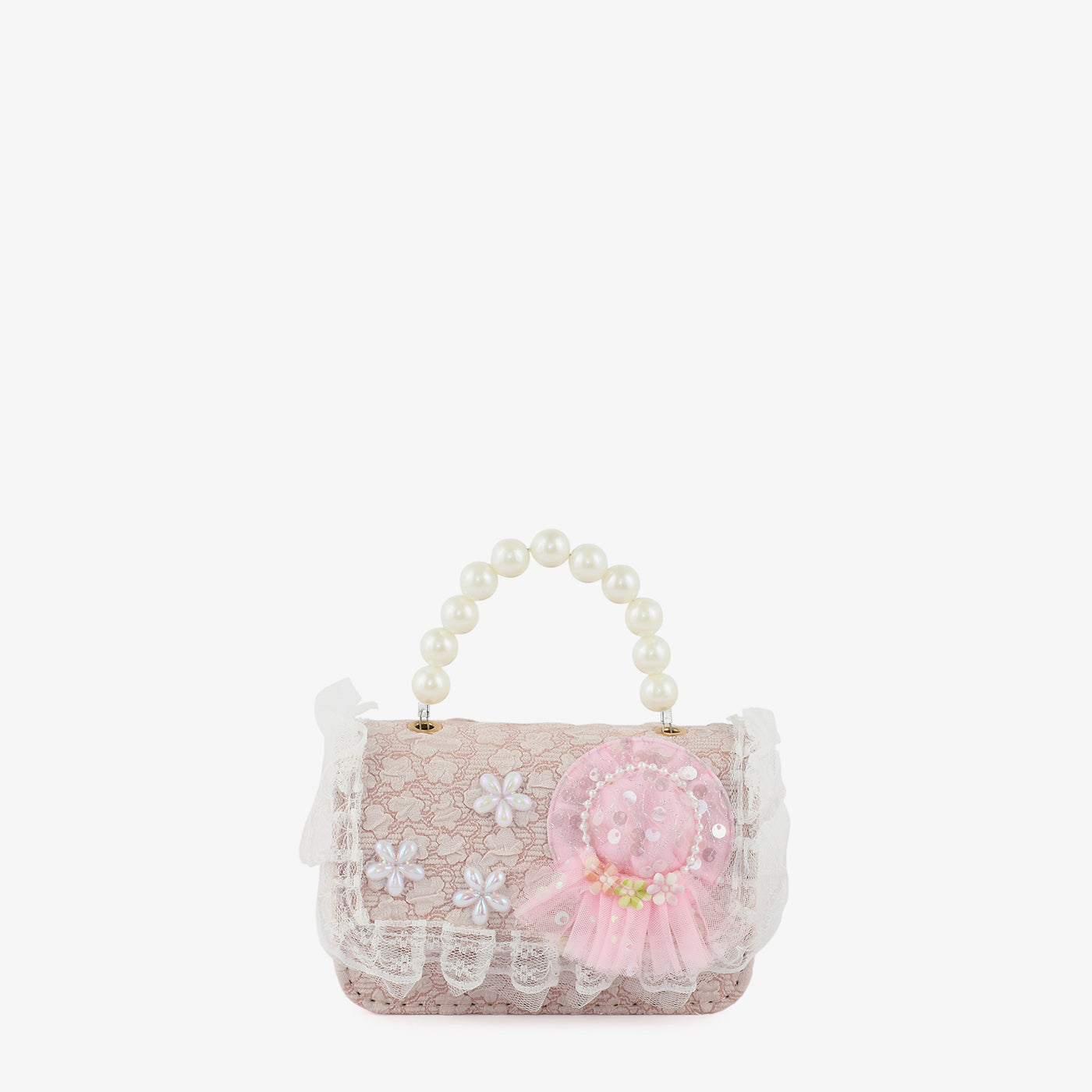 A charming handbag designed with intricate lace details and delicate floral embellishments that add a touch of grace. The structured silhouette ensures both beauty and durability. Finished with a pearl...