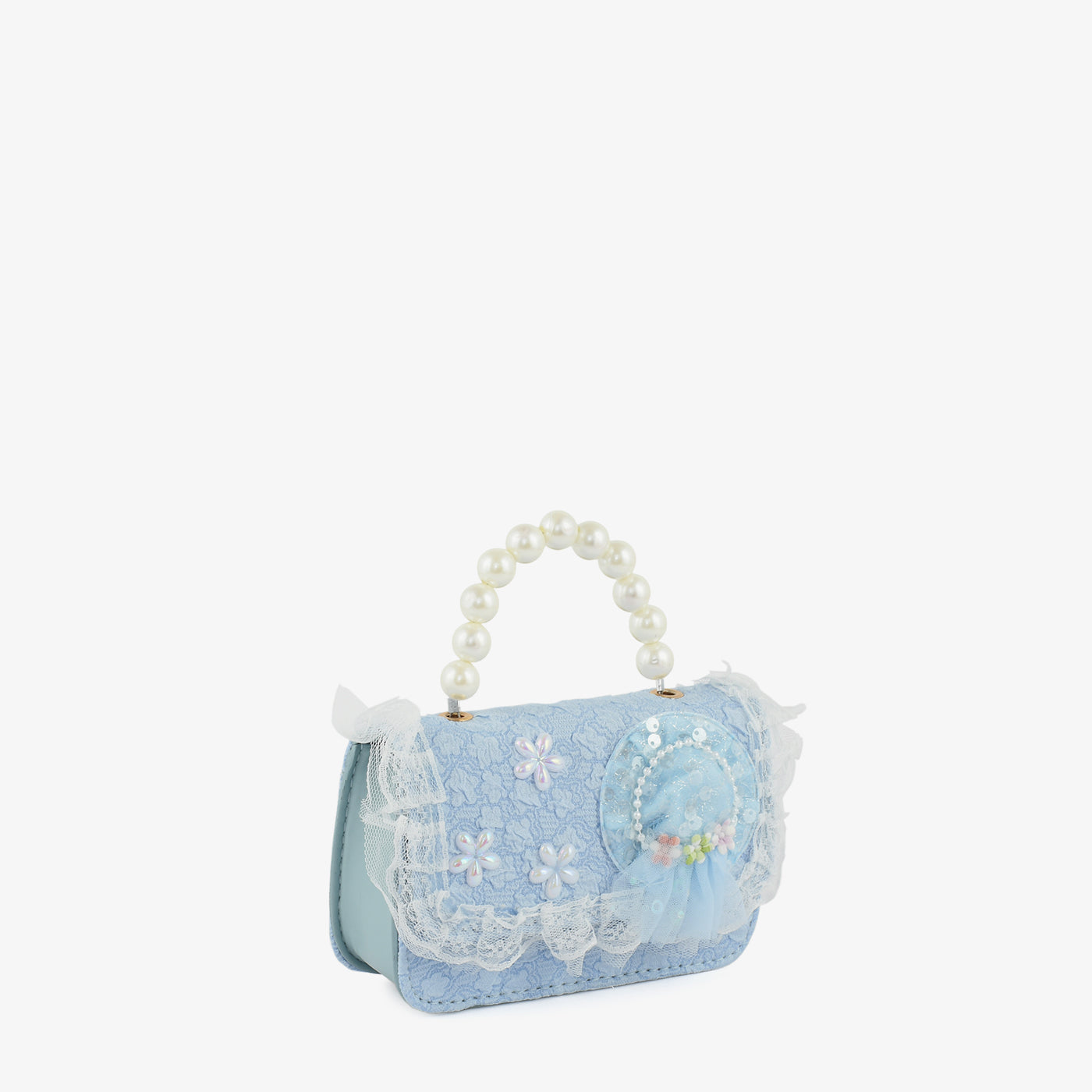 A charming handbag designed with intricate lace details and delicate floral embellishments that add a touch of grace. The structured silhouette ensures both beauty and durability. Finished with a pearl handle, it’s ideal for festive gatherings or special occasions.
