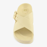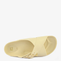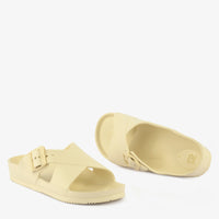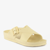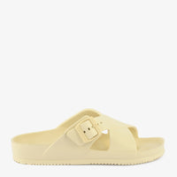 Effortless Comfort Buckle Slippers offer a blend of casual style and practical design. These off-white slippers feature a unique crisscross strap design with an adjustable buckle, providing a secure and customized fit. The lightweight construction and contoured footbed ensure all-day comfort, making them perfect for relaxed wear around the house or quick trips outside.