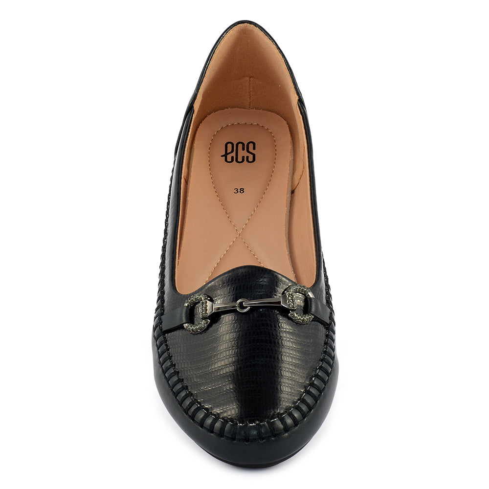 A comfortable black loafer in a soft, matte finish. It features a rounded toe with moccasin stitching and a decorative gunmetal-tone link across the instep, offering a blend of comfort and subtle style.