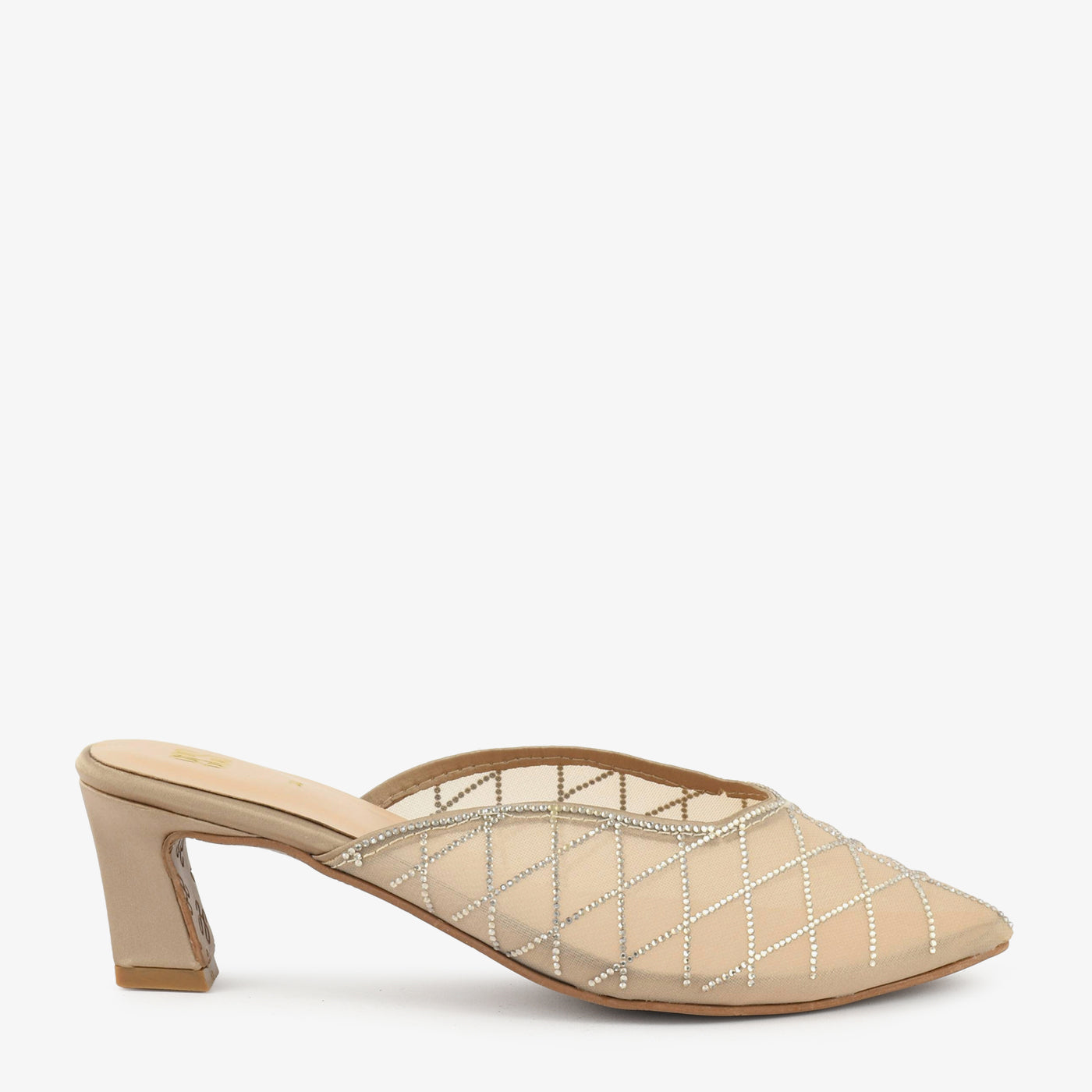 A stylish slip-on mule crafted with a delicate geometric woven pattern enhanced with fine embellishments. The pointed silhouette adds sophistication while offering easy wear. The mid-height heel makes it suitable for festive gatherings, cultural celebrations, and evening events. Lightweight construction ensures extended comfort. A beautiful blend of tradition-inspired detailing and modern mule design.