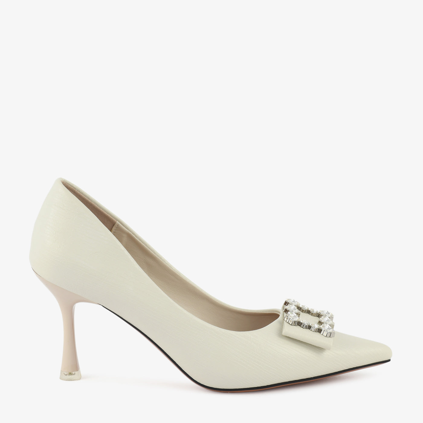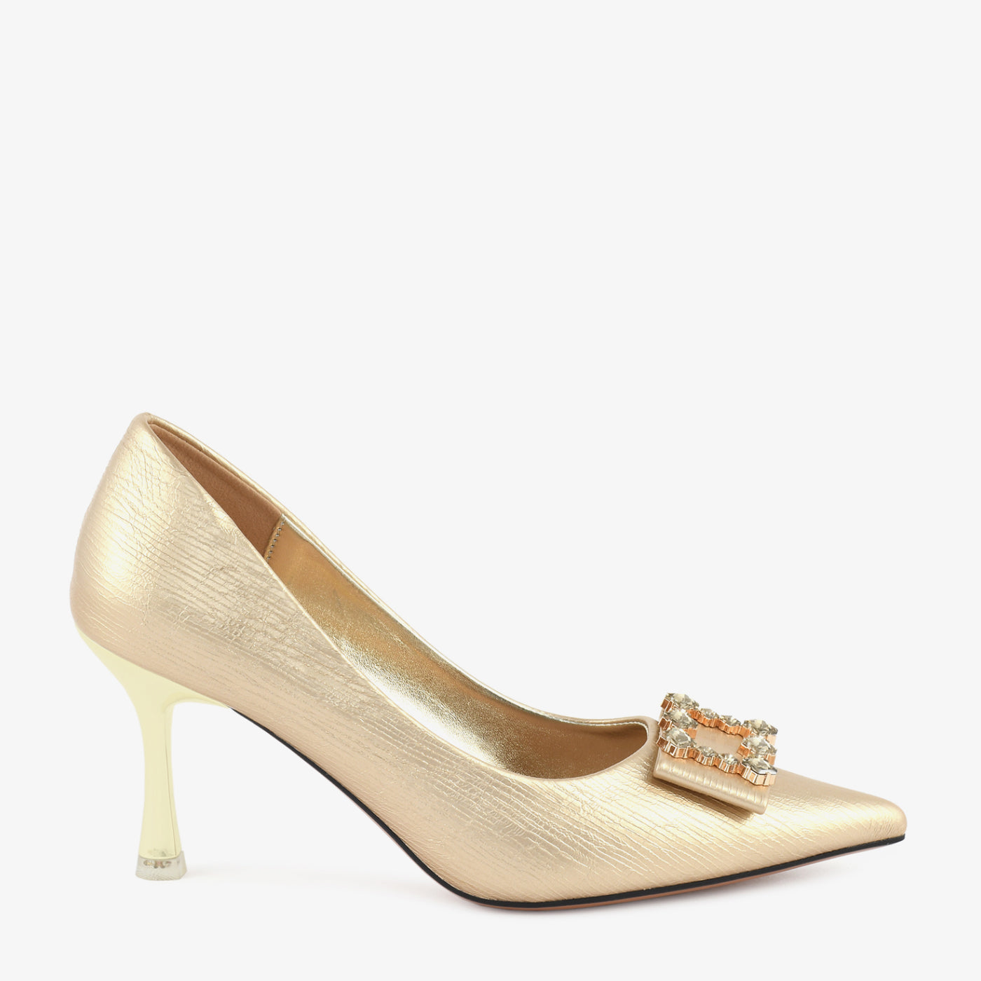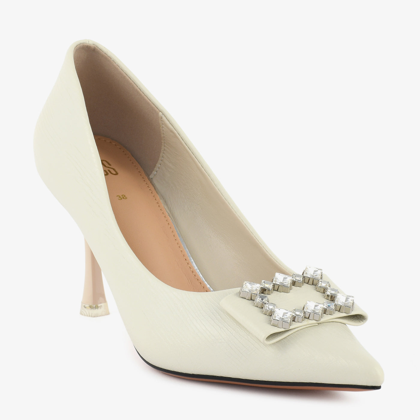 A sleek and graceful court shoe designed to add instant elegance to every occasion. The structured silhouette and pointed toe offer a refined feminine touch, while the crystal-studded buckle on the toe brings a hint of luxurious sparkle. Its balanced heel height ensures confident strides, making it ideal for formal dinners, festive events, and evening wear. Perfect for women who love timeless style with a touch of glamour.