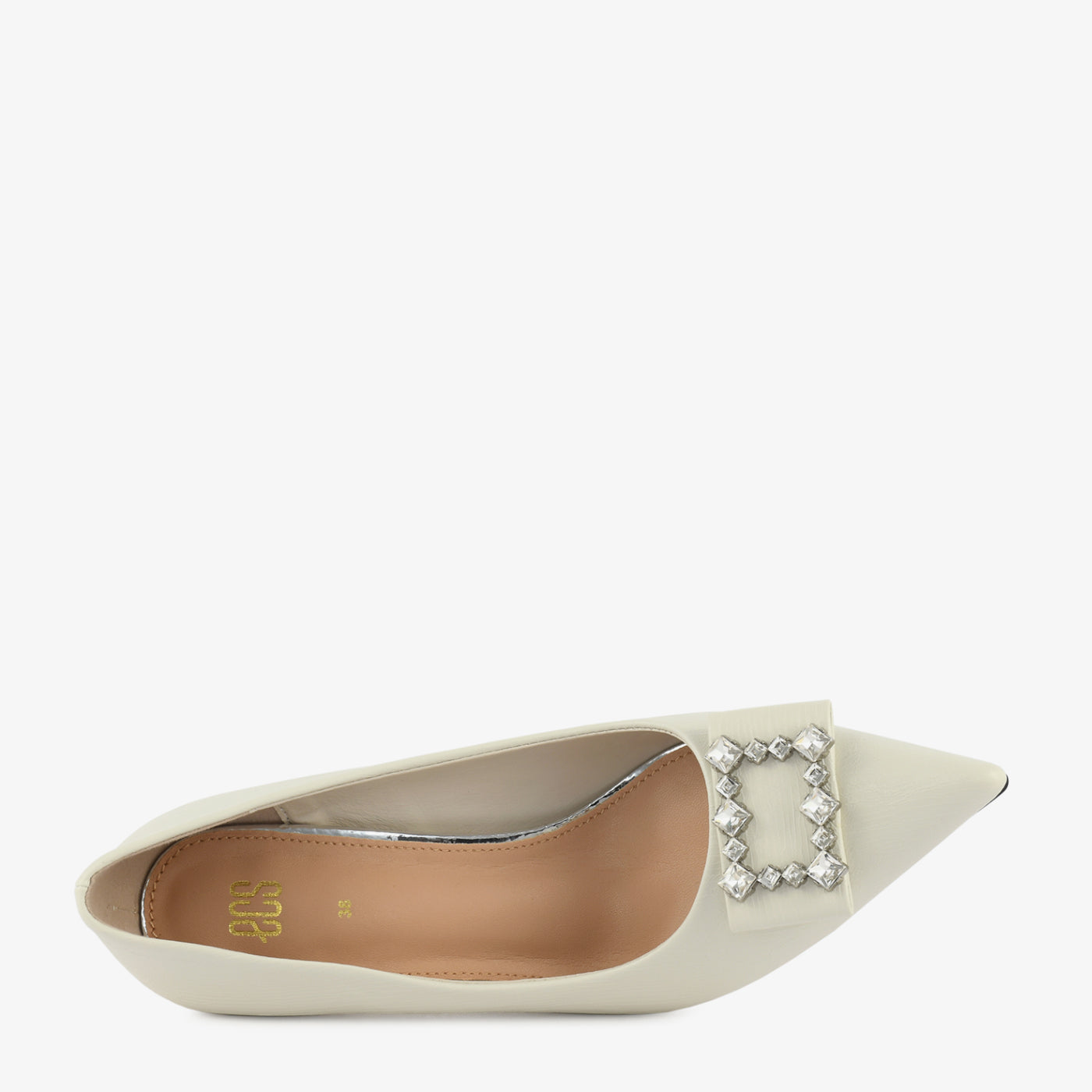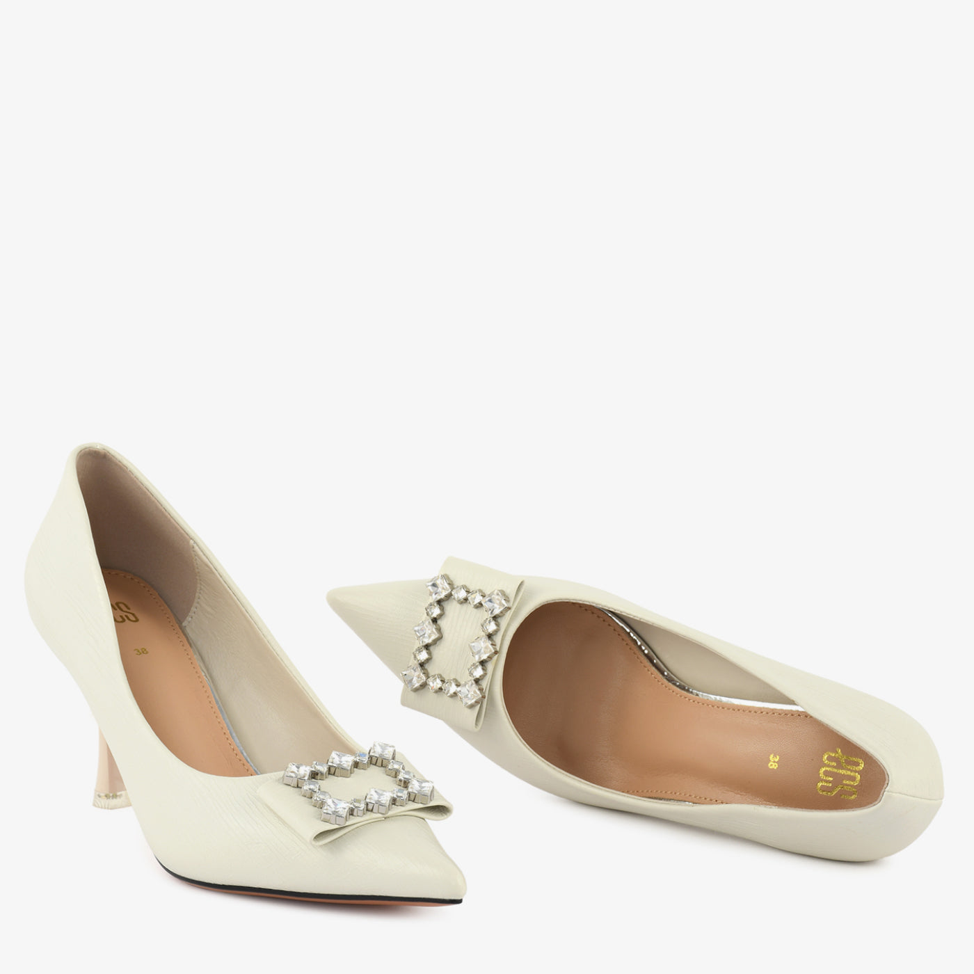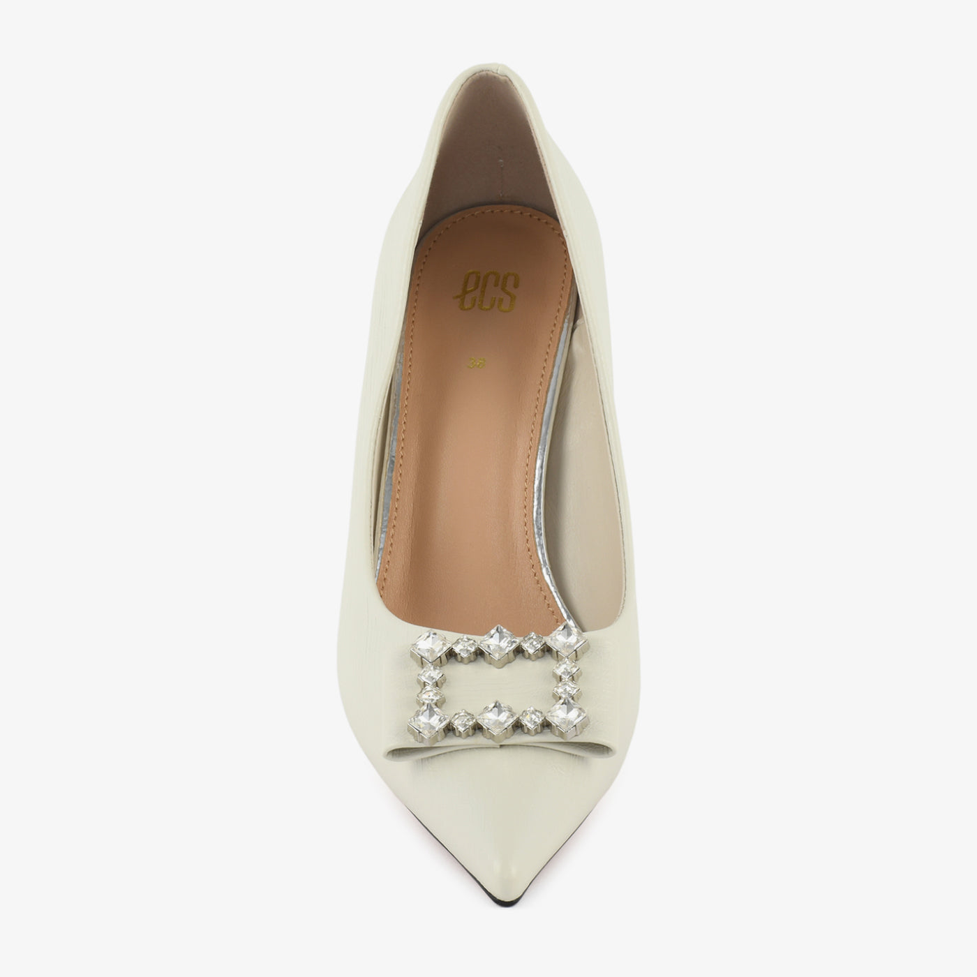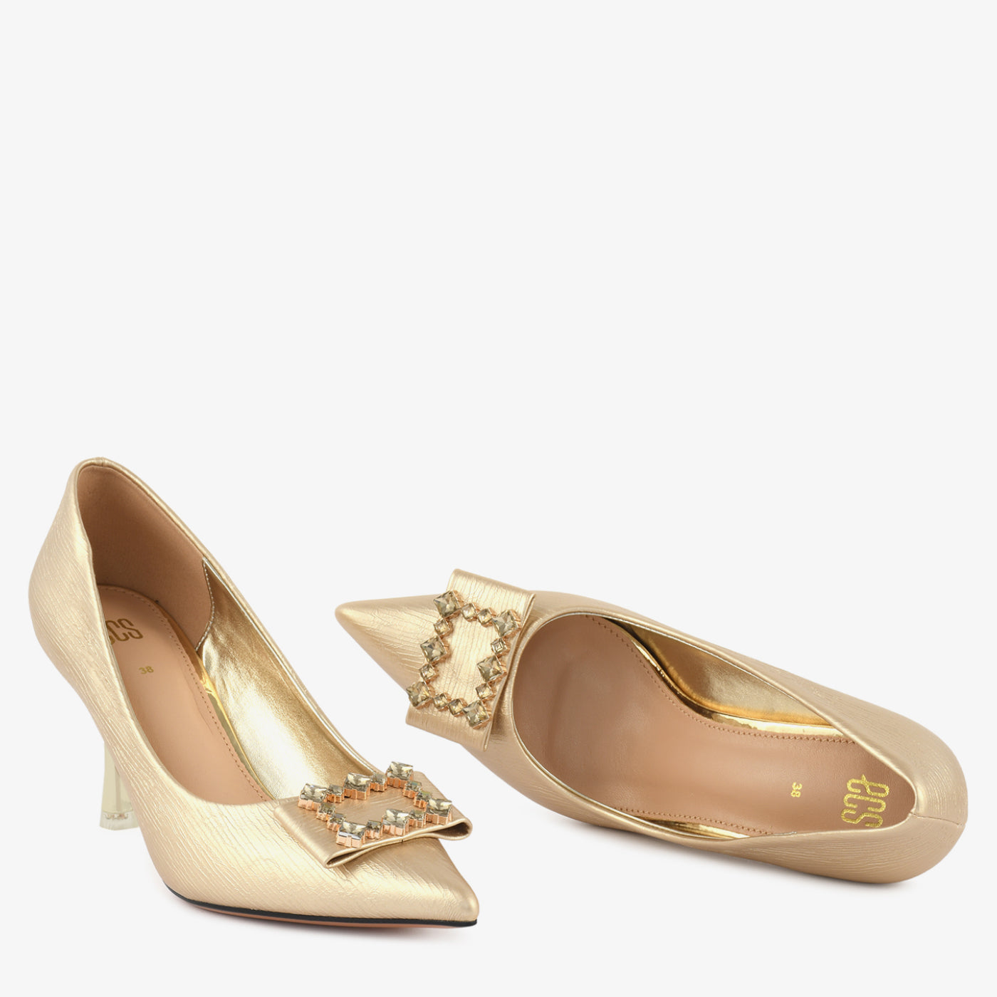 A sleek and graceful court shoe designed to add instant elegance to every occasion. The structured silhouette and pointed toe offer a refined feminine touch, while the crystal-studded buckle on the toe brings a hint of luxurious sparkle. Its balanced heel height ensures confident strides, making it ideal for formal dinners, festive events, and evening wear. Perfect for women who love timeless style with a touch of glamour.