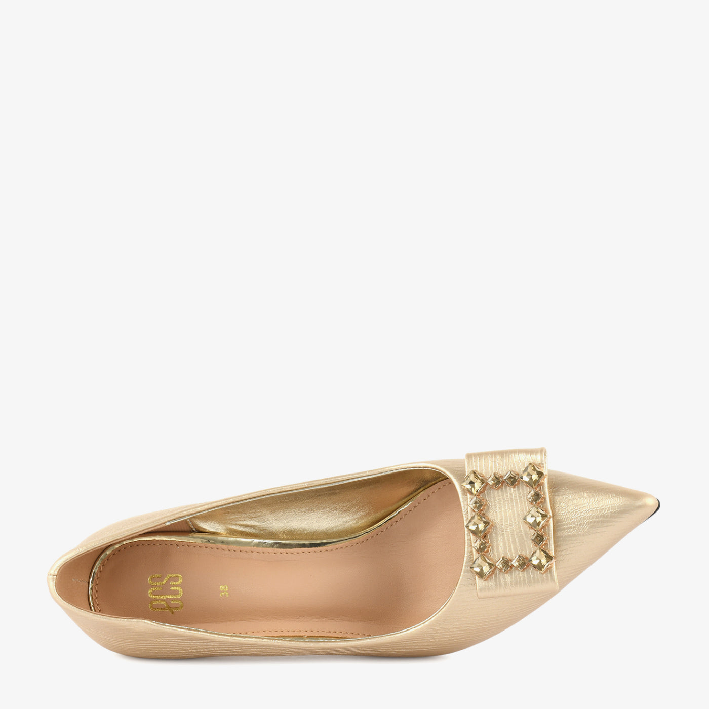 - Design: Crystal-embellished buckle toe design