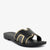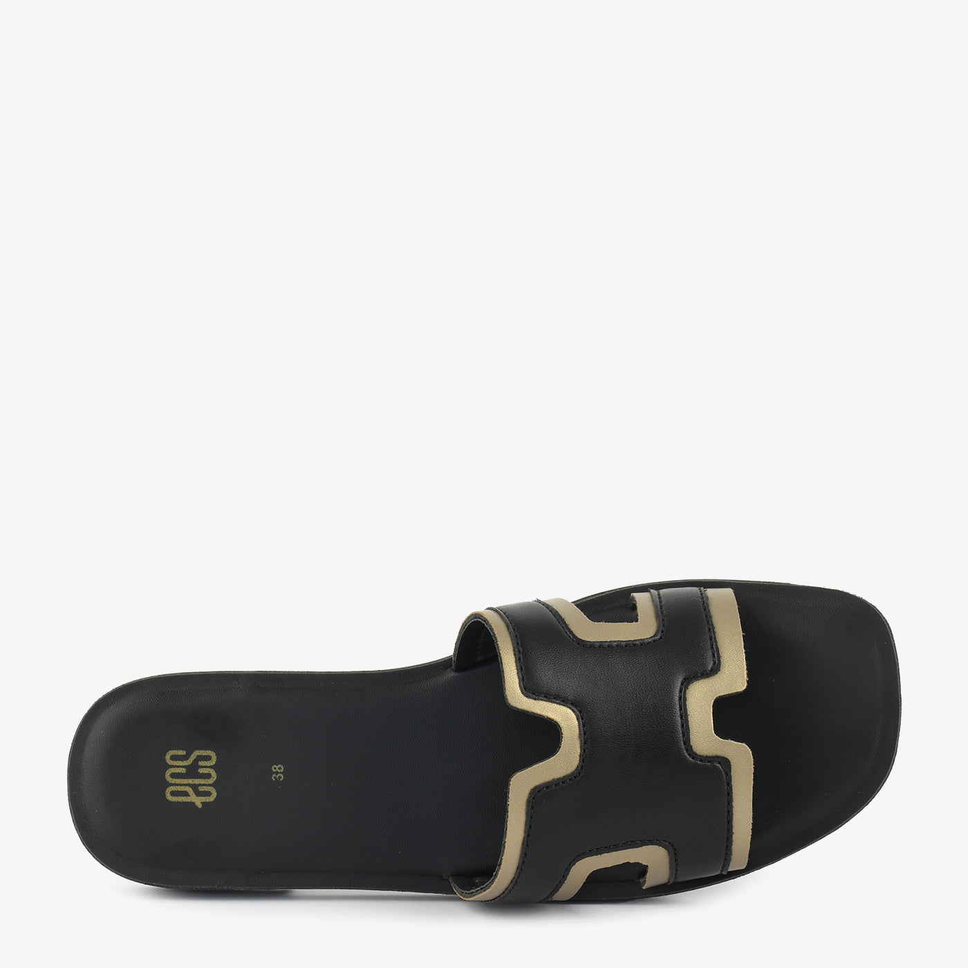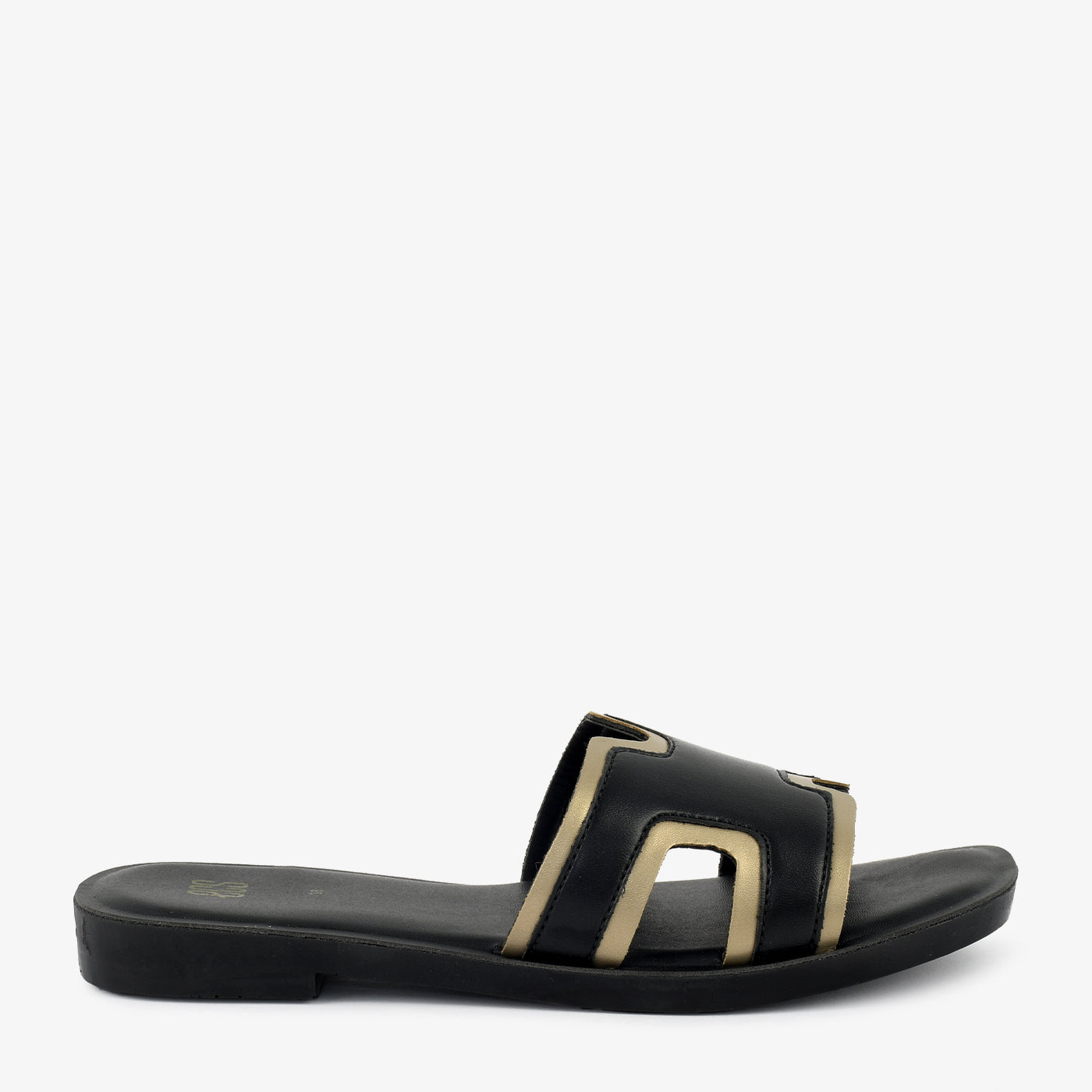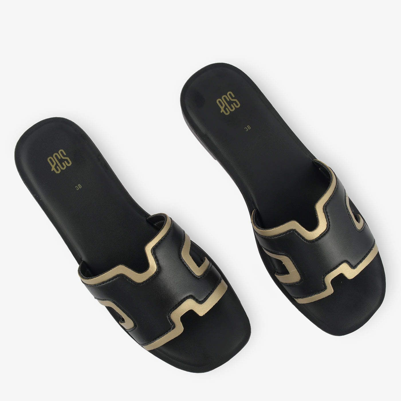 Step into sophisticated ease with these striking black slide slippers. The bold, geometric strap is accented with a rich gold trim, adding a touch of regal elegance to your everyday style. The comfortable flat sole makes them perfect for warm days and casual outings around the city.