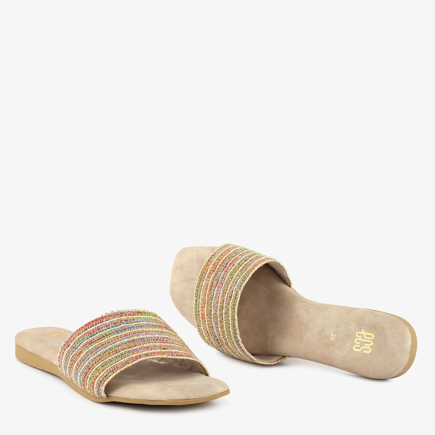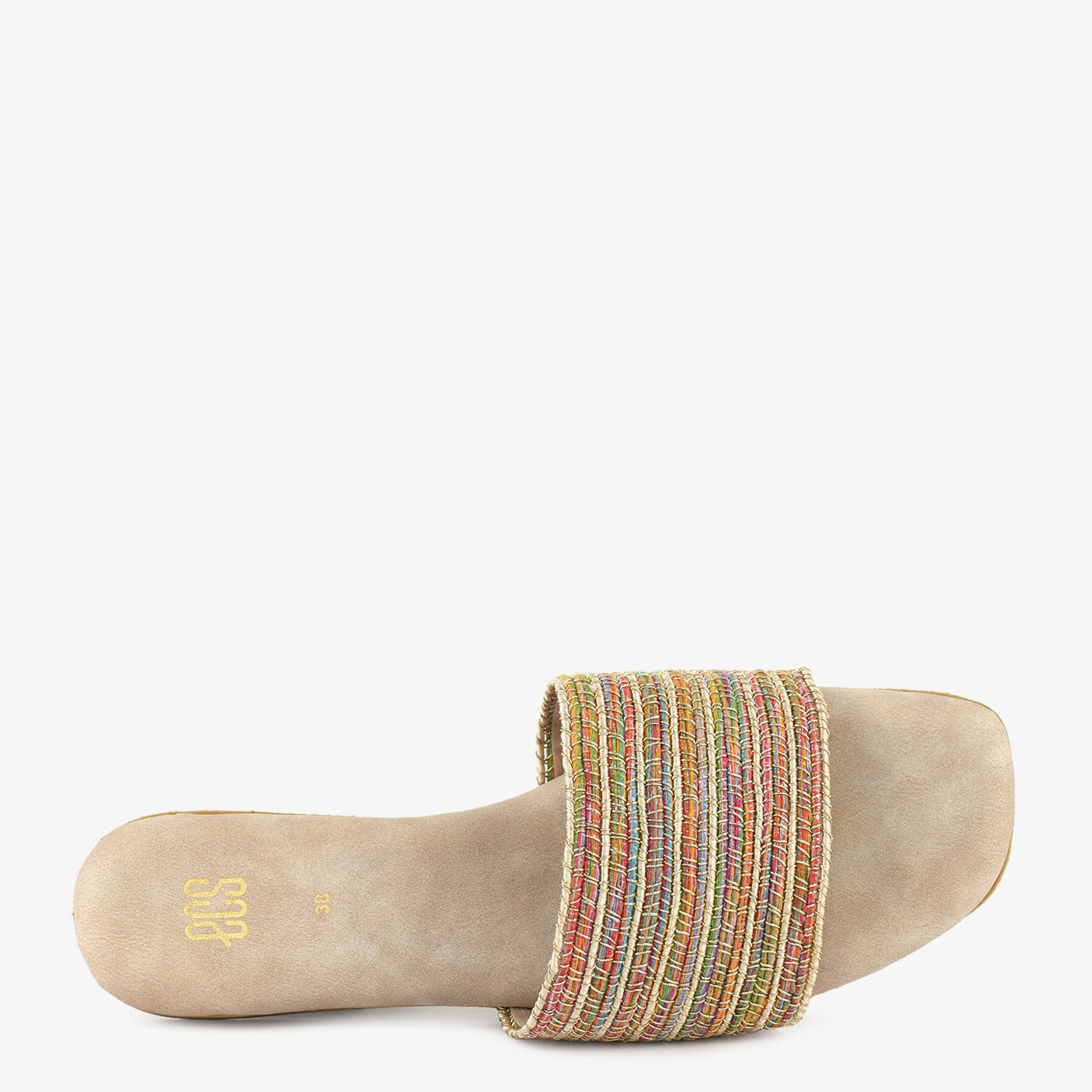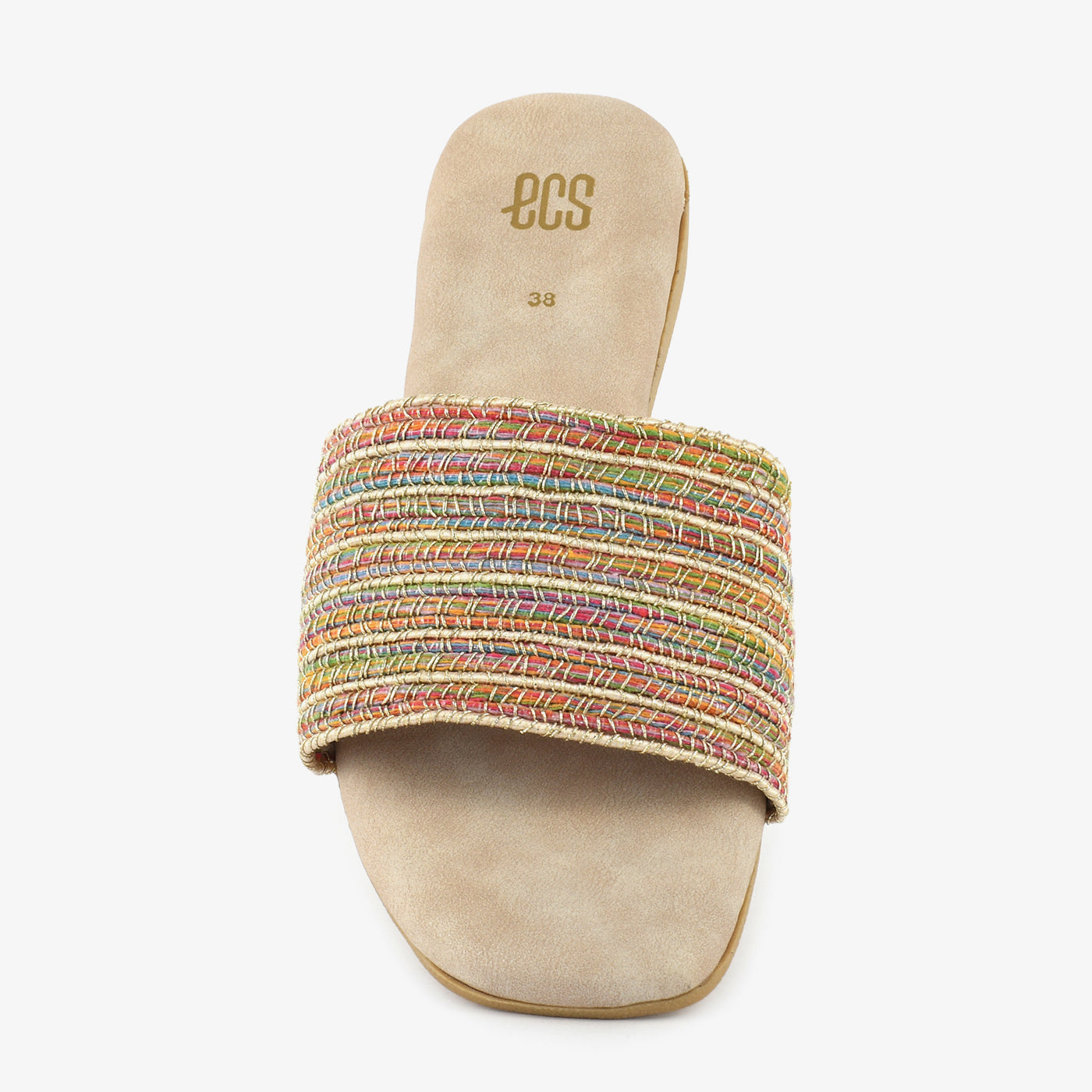 Add a pop of texture with these vibrant woven slides. The broad upper band showcases intricate multi-tone threading, offering a playful yet sophisticated finish.