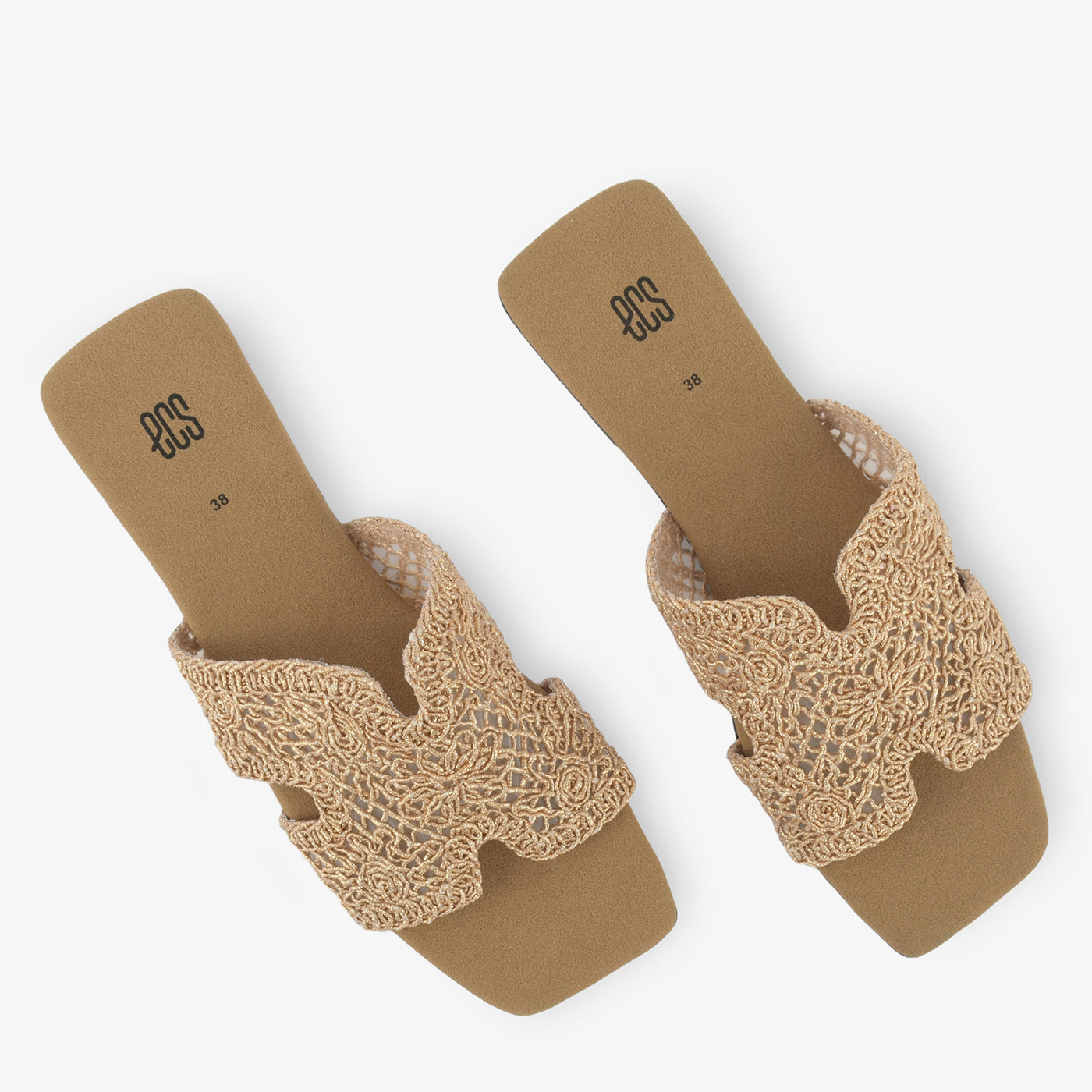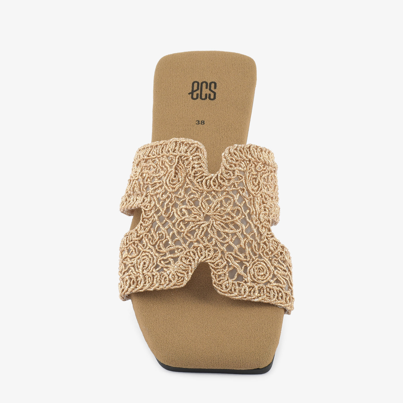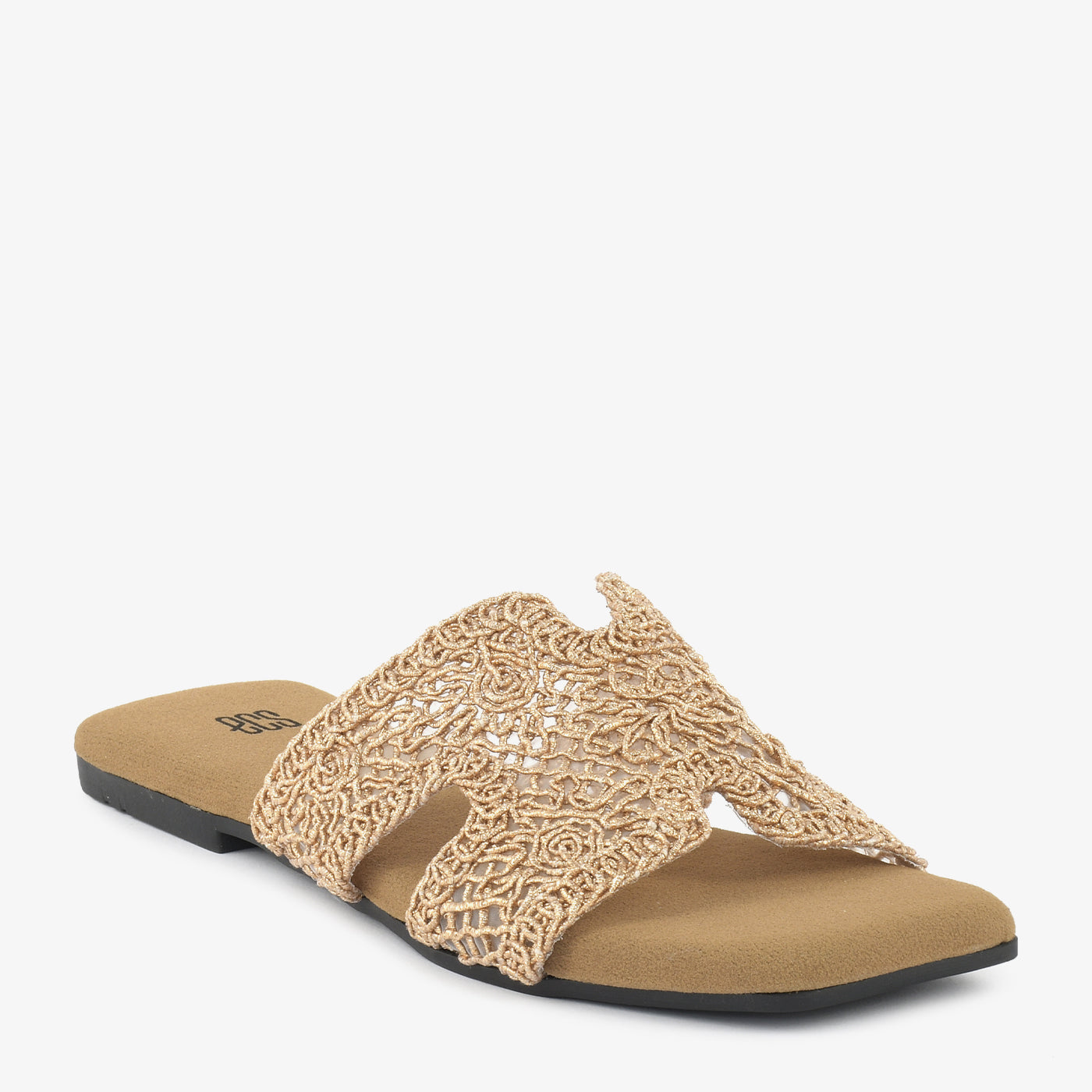 Step into intricate elegance with these golden crochet flat slippers. The delicate woven design adds a touch of bohemian charm, while the metallic gold finish brings a touch of glamour. The comfortable flat sole makes them perfect for relaxed days and casual outings.