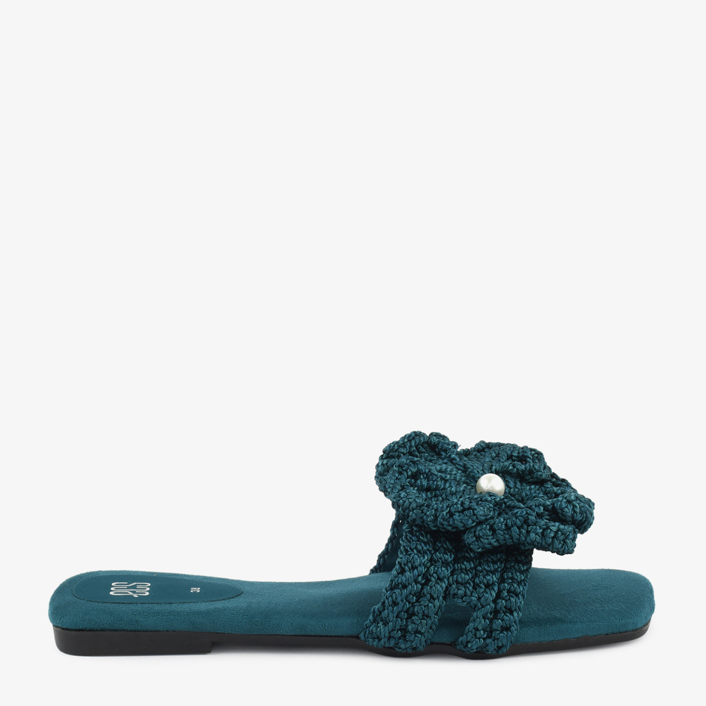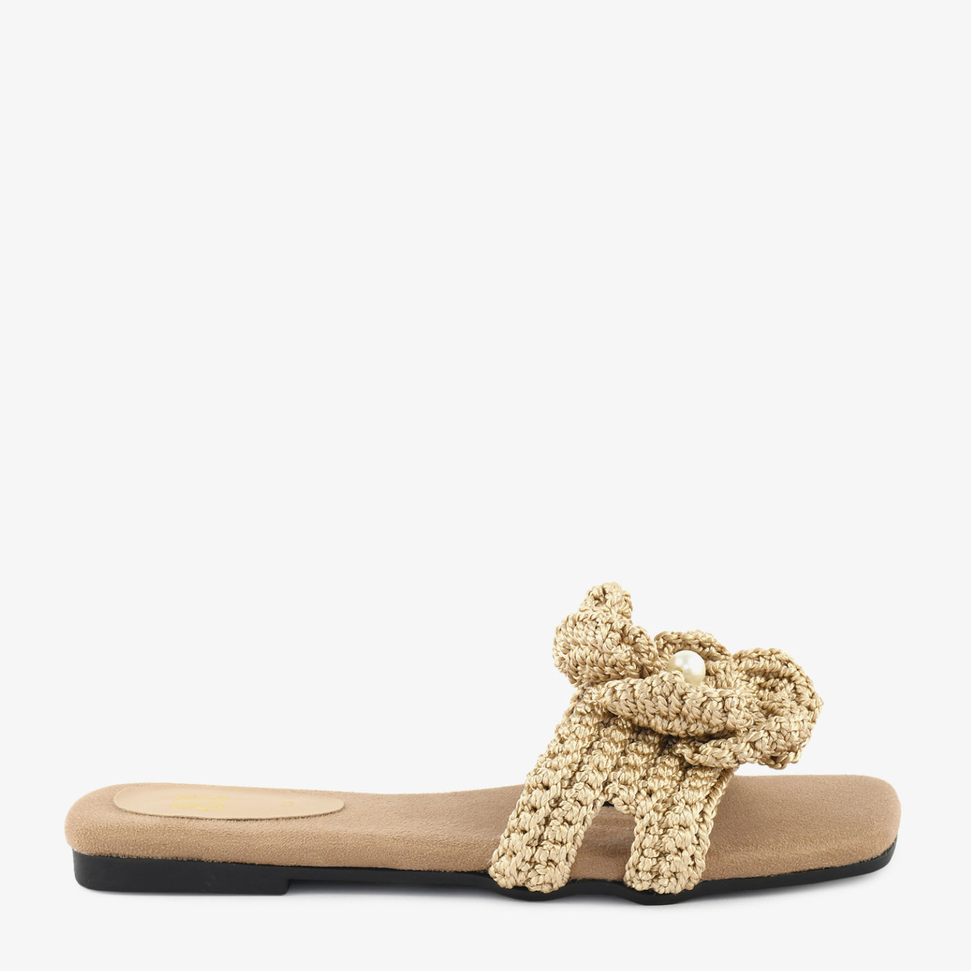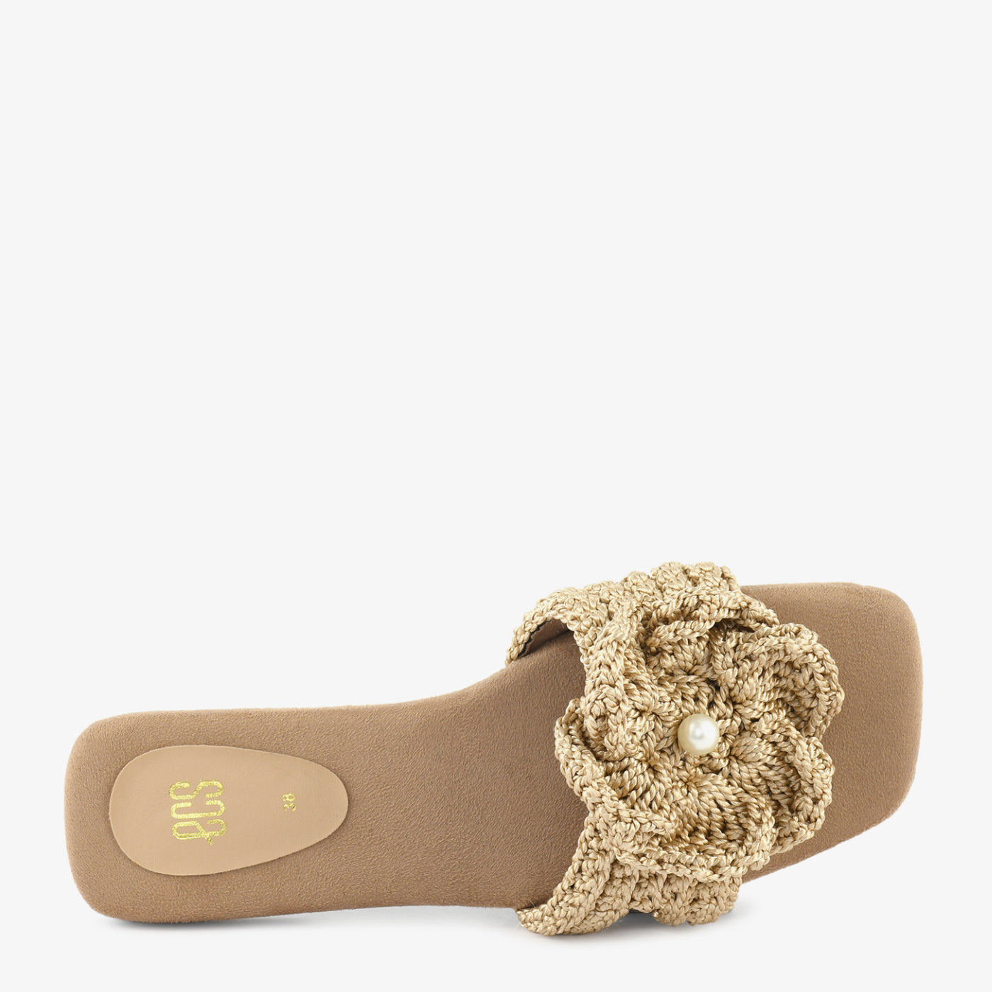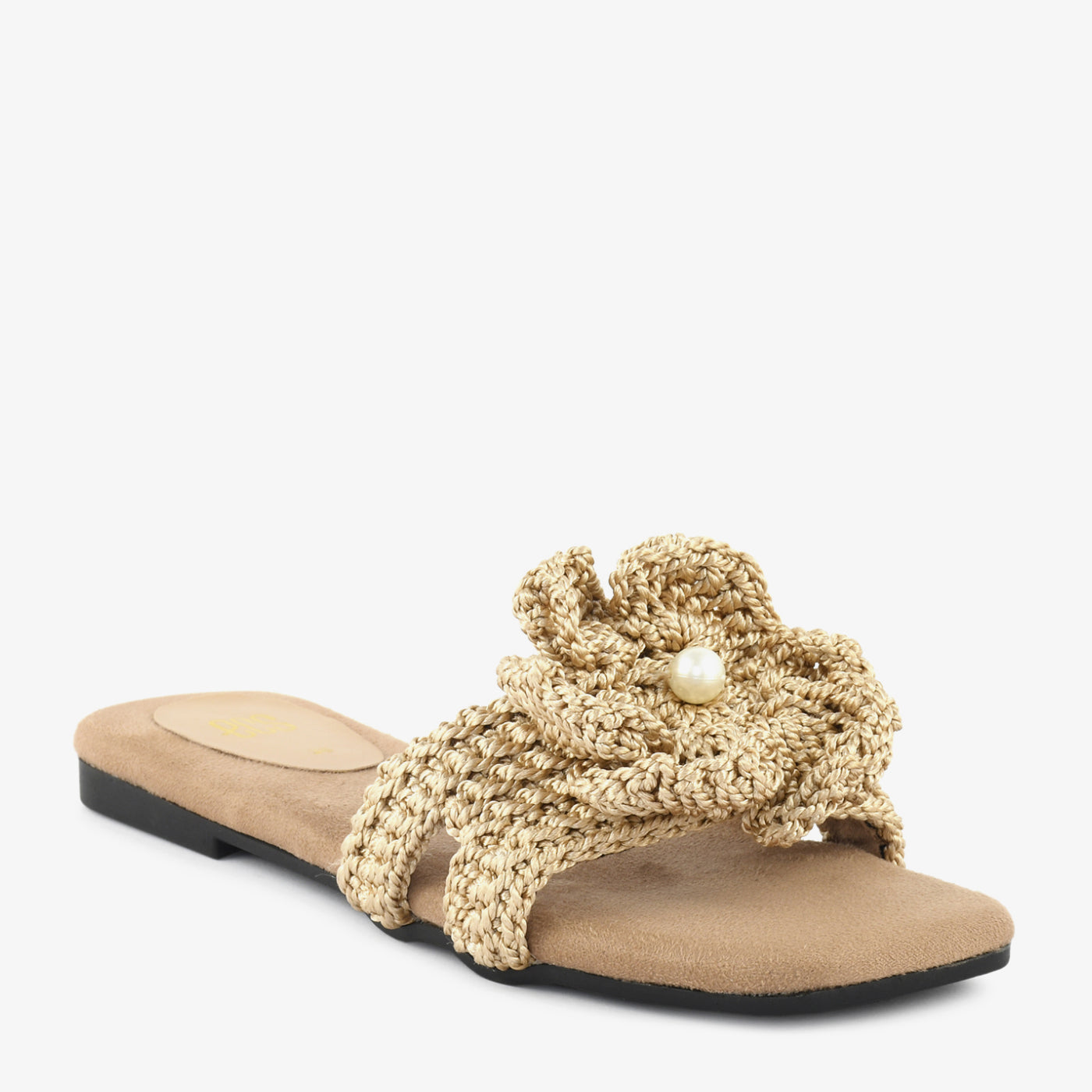 The "Petal Bloom Slide" brings artistry to your steps with a crochet floral accent detailed with a pearl center. Its slip-on design ensures both comfort and chic appeal, perfect for relaxed yet polished looks.